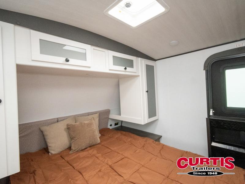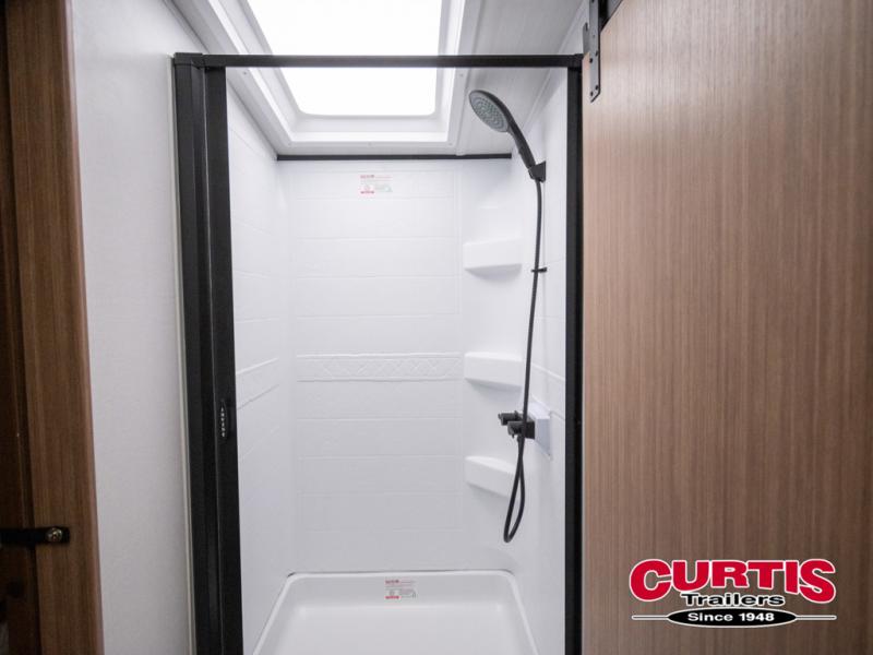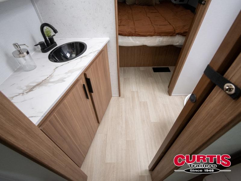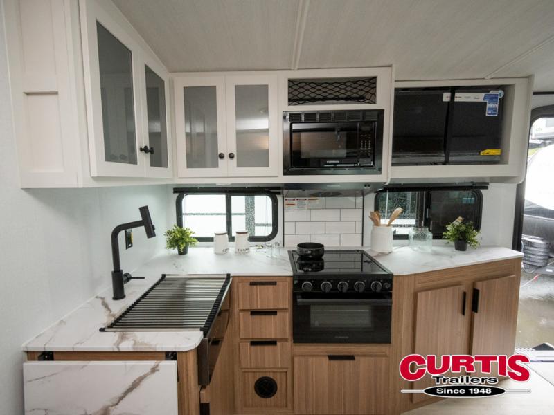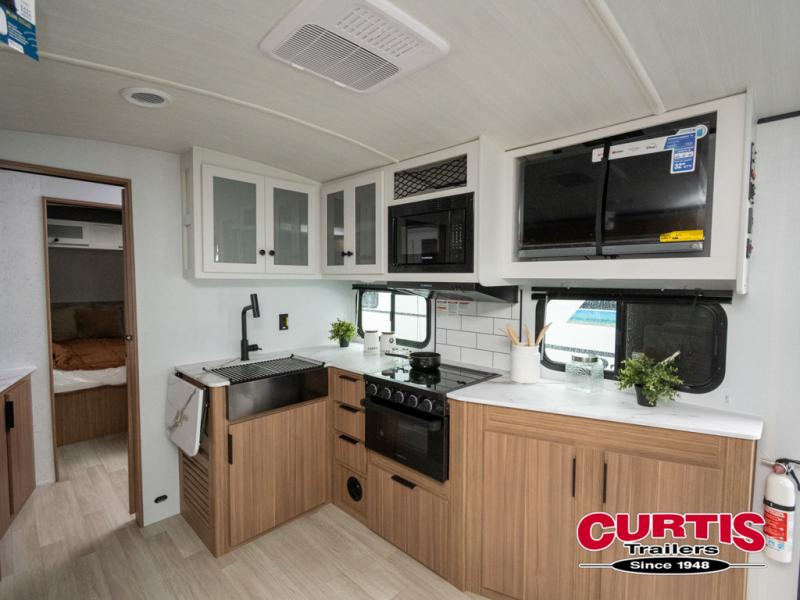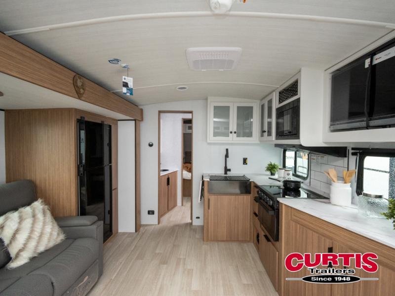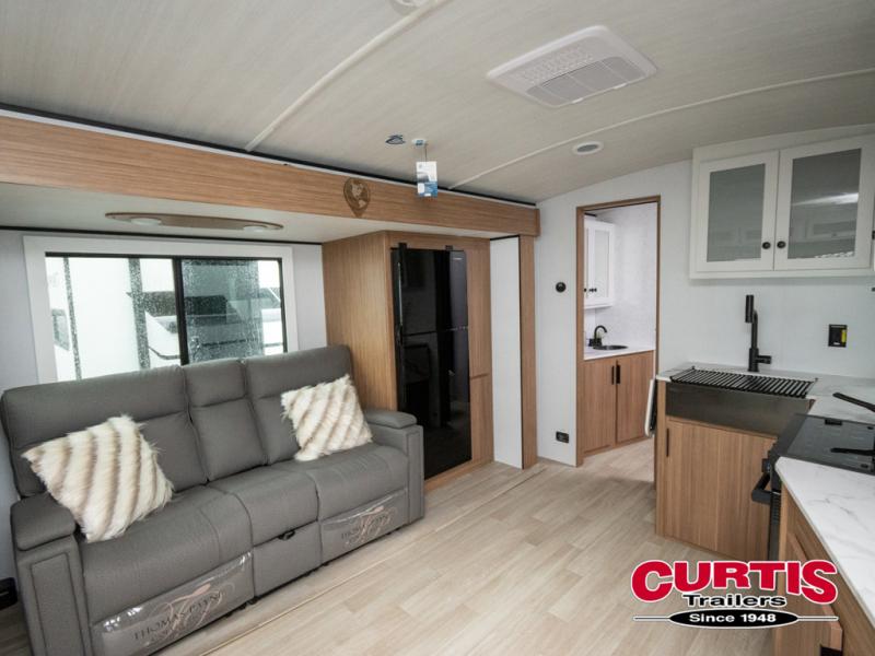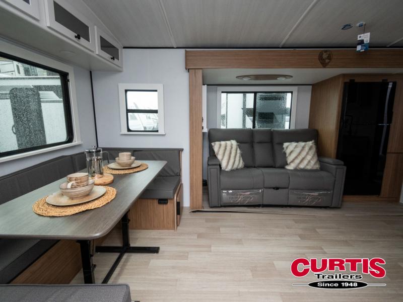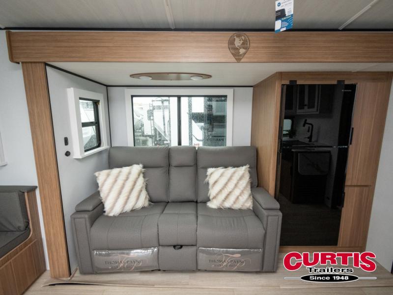 If you're looking to upgrade from a tent to a travel trailer, the time is now with this model! You will love having your own master bedroom up front with a queen bed, dual bedroom wardrobes and your own exterior entry door. The second entry door leads right into the combined kitchen and living area for added convenience. Your crew can dine or play a game around the U-shaped dinette or relax on the tri-fold sofa across from the entertainment center. These pieces of furniture will also double as your guests' sleeping space at night, and you have the option to choose luxury cinema recliners in place of the sofa if you don't need that much sleeping room. There is also a full walk-through bath to clean up in each day plus a fully-equipped kitchen to make meals!