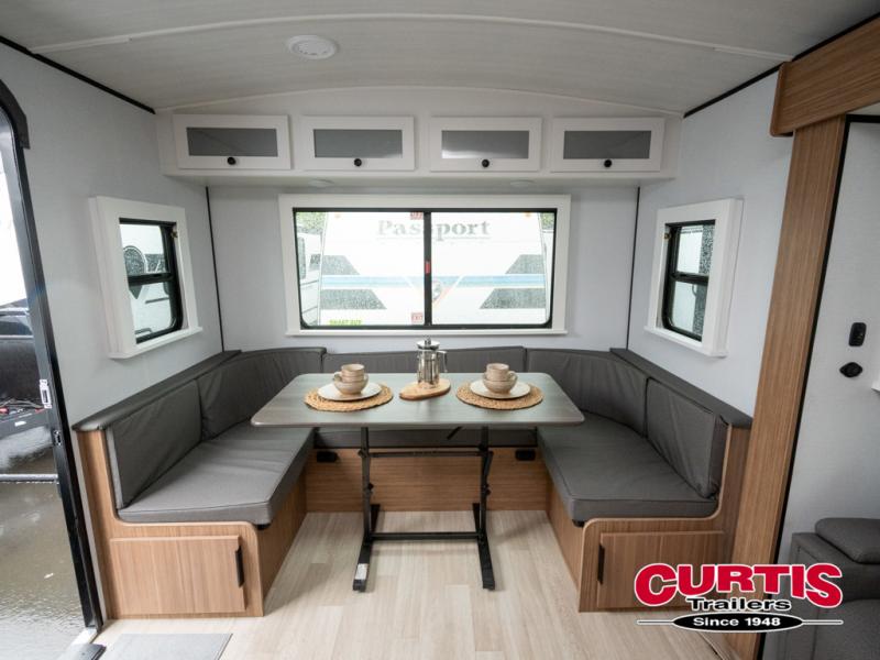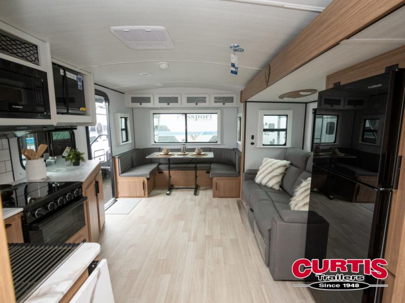 With any Keystone Passport Super Lite travel trailer you will enjoy lightweight towing and lots of interior comforts! The power tongue jack lets you hitch up at the drop of a hat, and the Dexter torsion axle rubber ride suspension will make towing easier than ever. You will appreciate having power stabilizer jacks for quick setup and an exterior convenience center to monitor tank levels. These trailers are constructed with a seamless, laminated and gel-coated filon exterior, 80% tinted safety glass windows, and a one-piece polypropylene underbelly. The interior will have you feeling right at home with residential durable Beauflor vinyl flooring, deluxe night shades, and seamless kitchen countertops to name a few comforts.