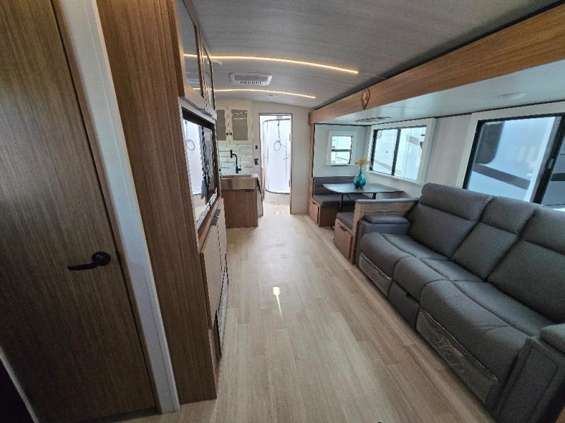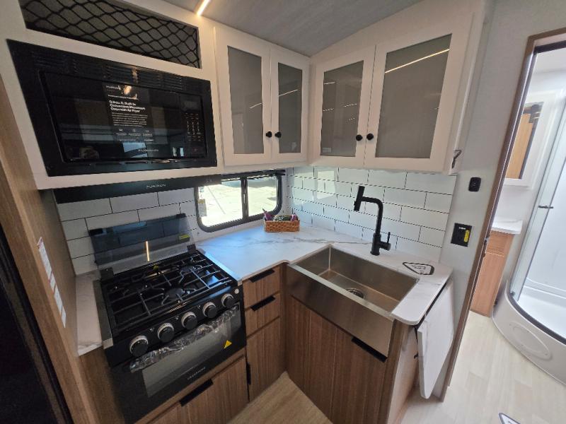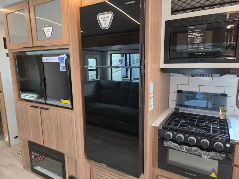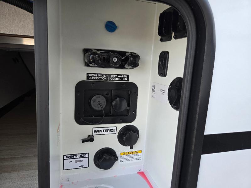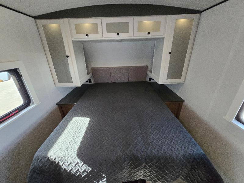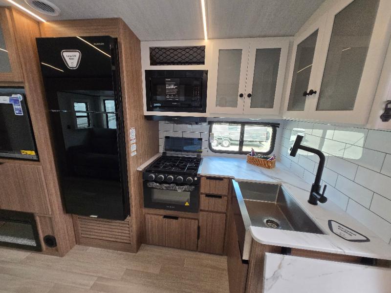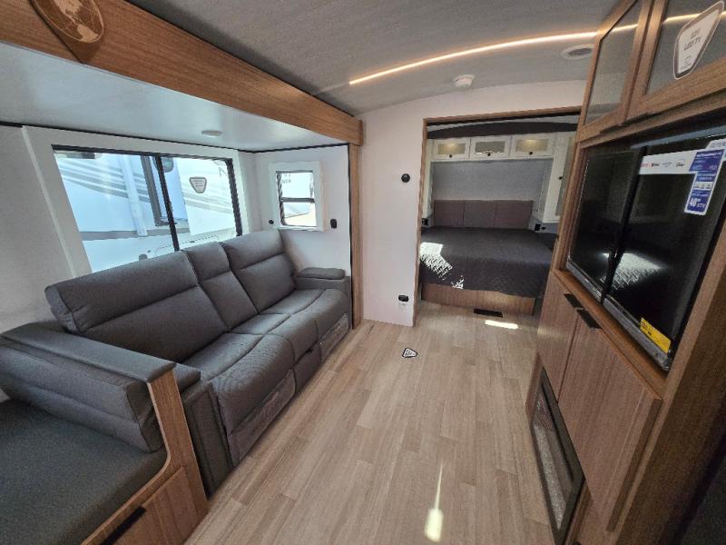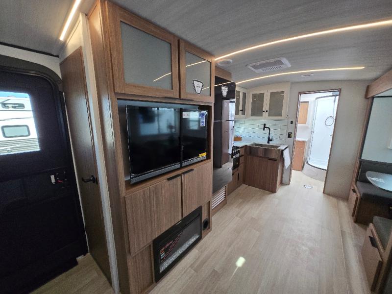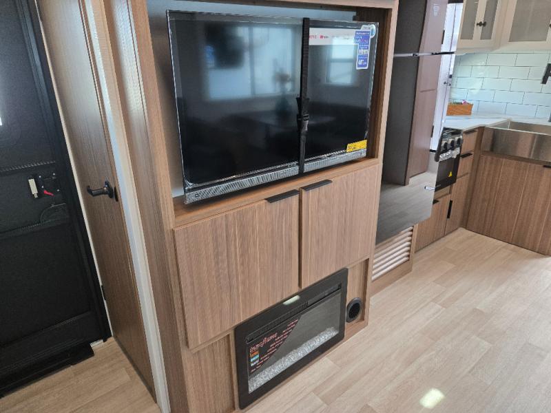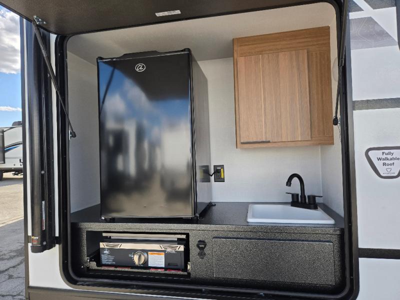 Time spent in this dual axle travel trailer will be time well spent. You can put out the 21' awning when you arrive, then unload the pass-thru storage and start lunch on the exterior kitchen with a griddle, sink, and mini refrigerator. The tri-fold sofa and do-more dinette table within the large slide out will provide a place to relax and dine each day, and there is a full interior kitchen when the weather isn't cooperating outdoors. This unit includes a front private bedroom with sliding doors for more space, a queen bed, dual wardrobes, and a nightstand to keep everything tidy. And don't overlook the full rear bath that will allow you to clean up each day without having to leave your trailer!