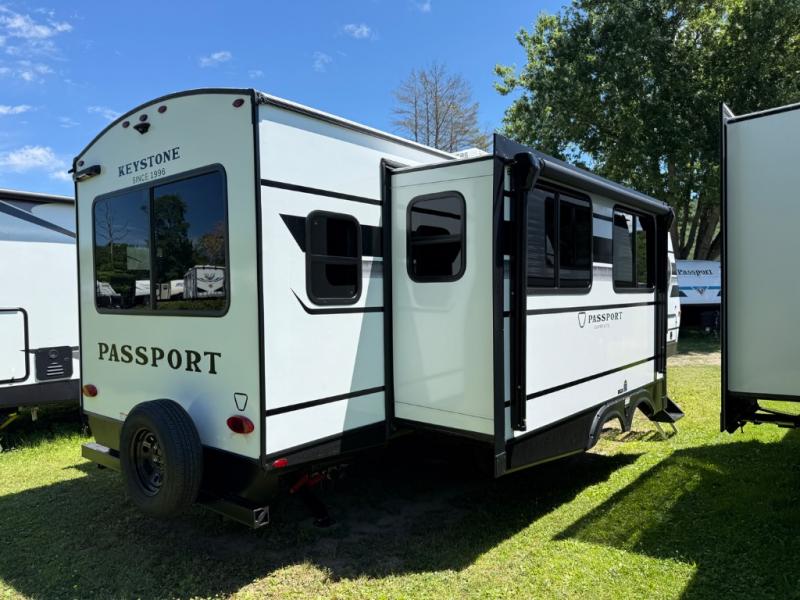 With any Keystone Passport Super Lite travel trailer you will enjoy lightweight towing and lots of interior comforts! The power tongue jack lets you hitch up at the drop of a hat, and the Dexter torsion axle rubber ride suspension will make towing easier than ever. You will appreciate having power stabilizer jacks for quick setup and an exterior convenience center to monitor tank levels. These trailers are constructed with a seamless, laminated and gel-coated filon exterior, 80% tinted safety glass windows, and a one-piece polypropylene underbelly. The interior will have you feeling right at home with residential durable Beauflor vinyl flooring, deluxe night shades, and seamless kitchen countertops to name a few comforts.