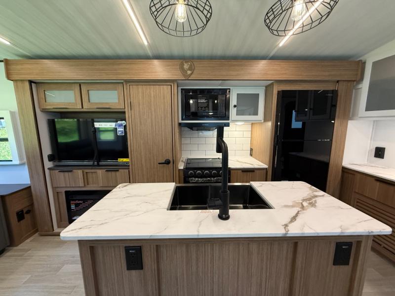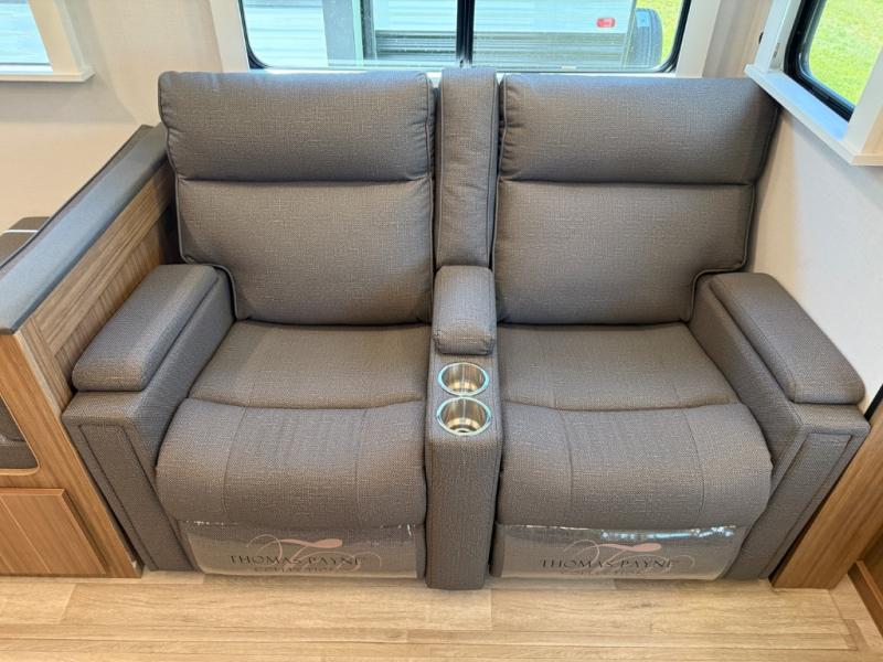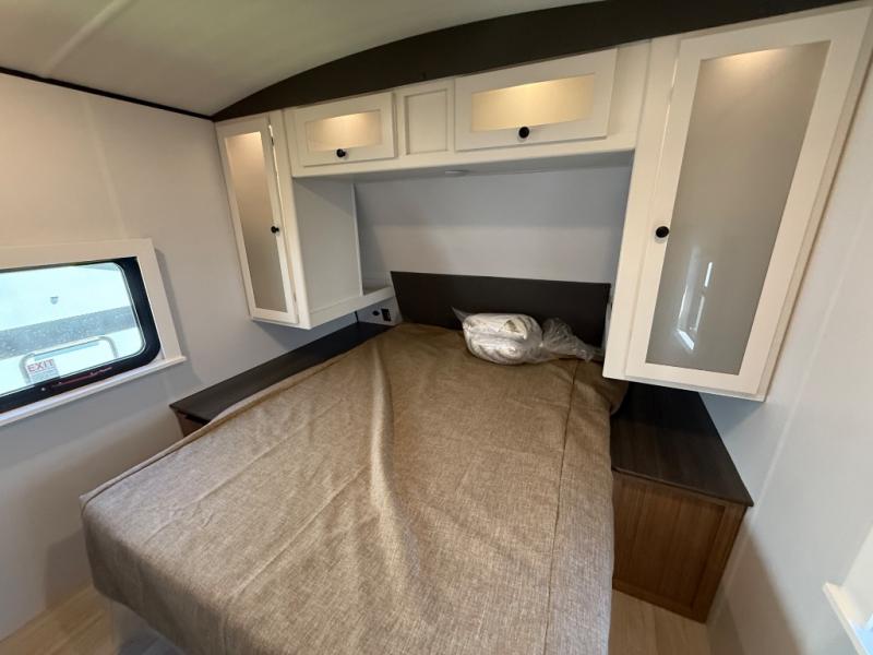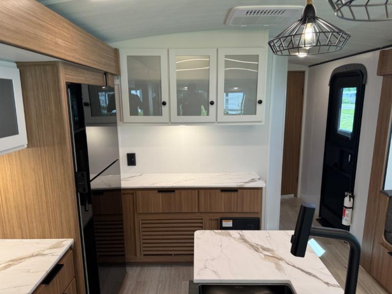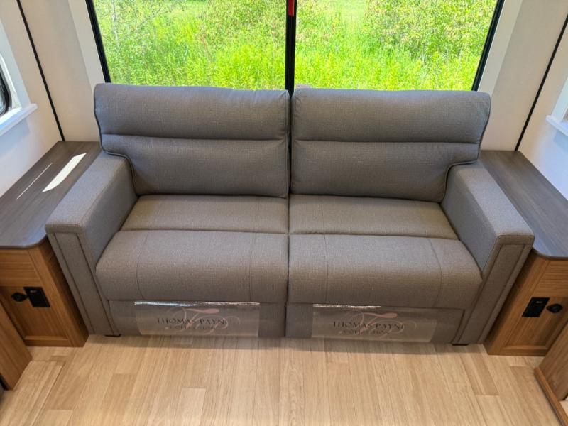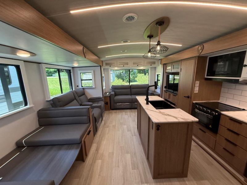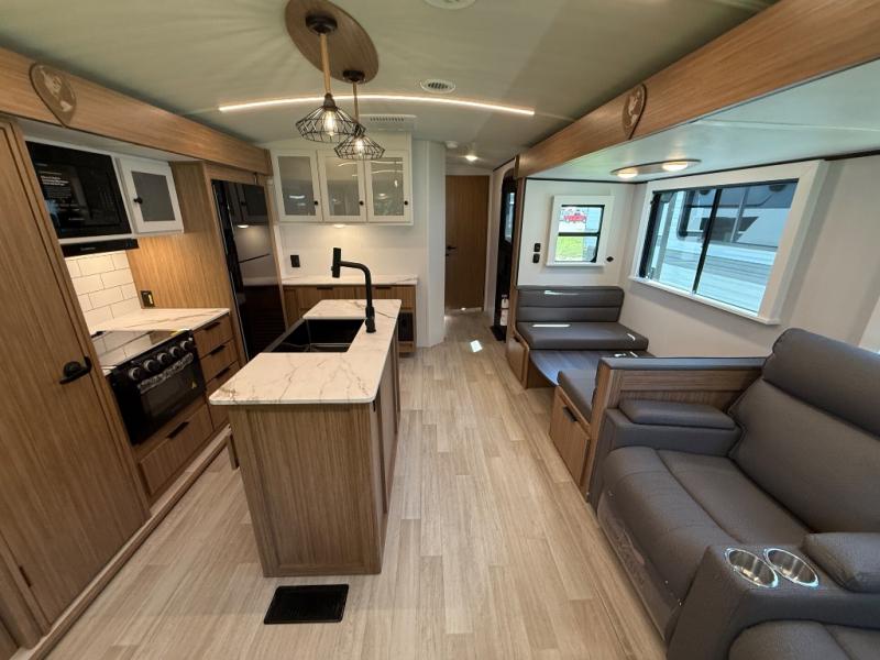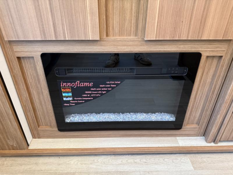 This is the travel trailer you've been searching for with a spacious interior, a front private bedroom, and a kitchen island for more counter space! Your crew can relax on the tri-fold sofa sleeper and luxury cinema theater seating, or play a game at the do-more dinette table. There is also an entertainment center and a fireplace to make this space feel more like home. A full kitchen, complete with a large pantry and 12V refrigerator will keep the chef of your group happy, and the full bath will let everyone clean up before bed. When it's time to call it a night, the front bedroom with a queen bed will be waiting for you, while your guests sleep on the sofa and dinette.
