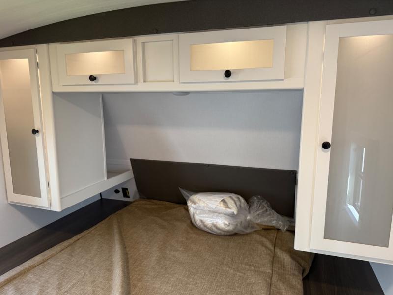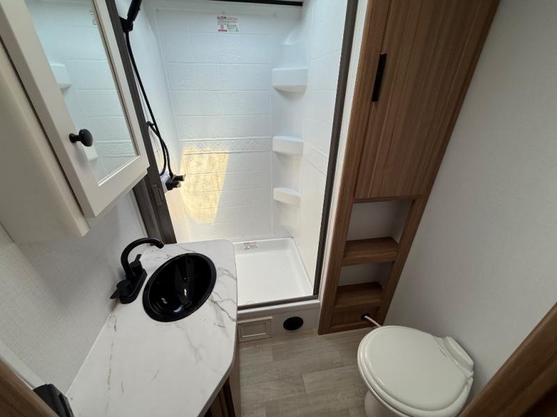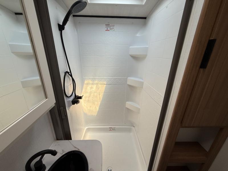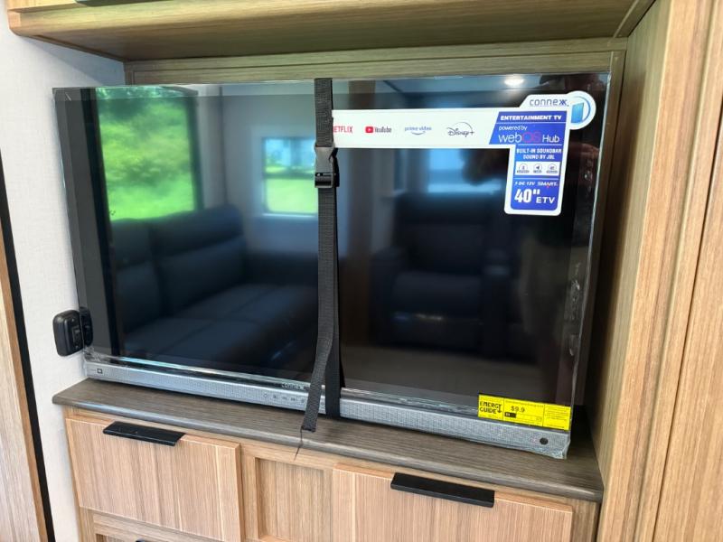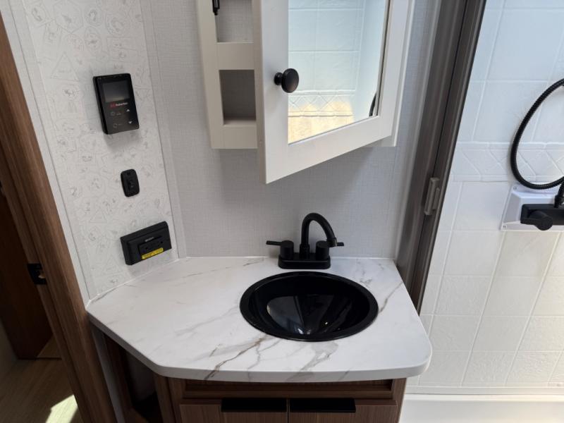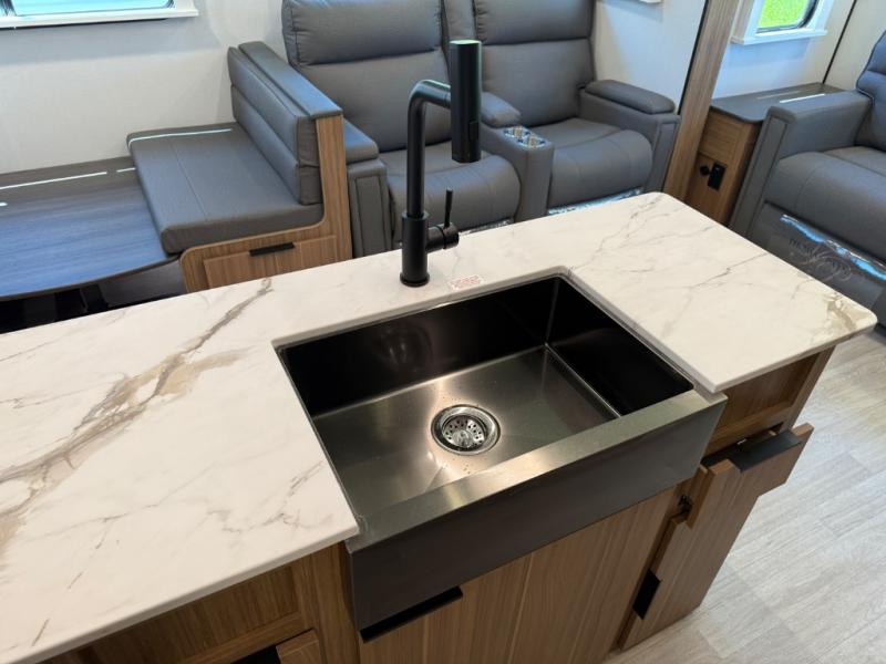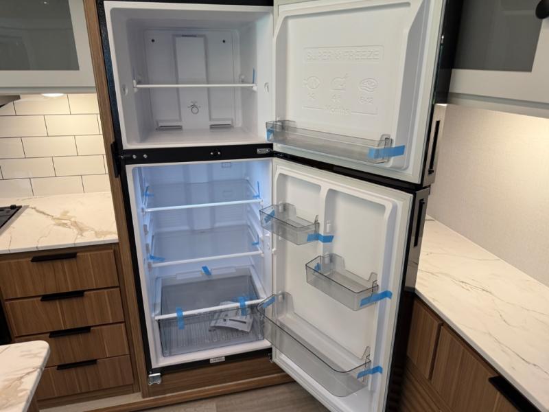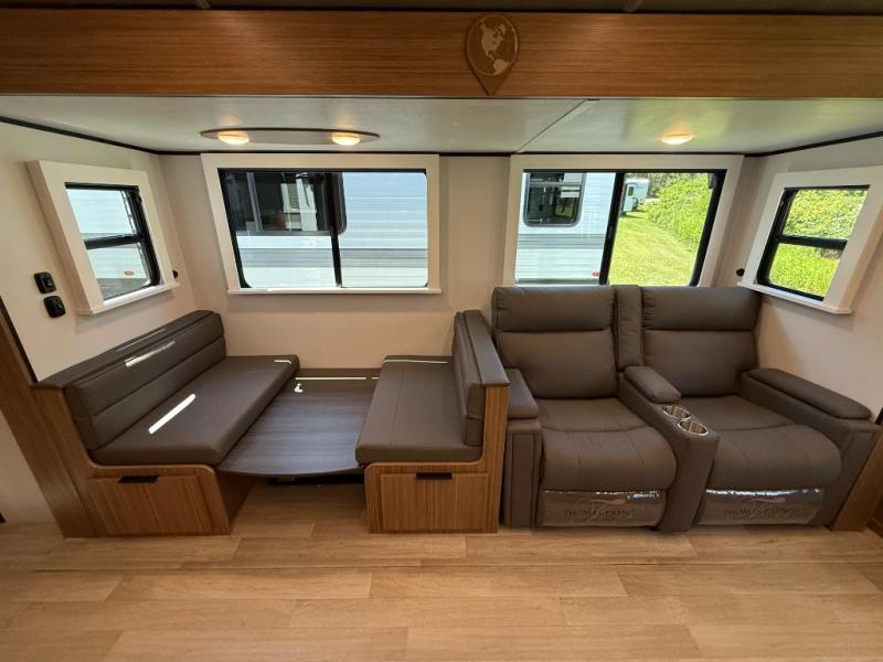 This is the travel trailer you've been searching for with a spacious interior, a front private bedroom, and a kitchen island for more counter space! Your crew can relax on the tri-fold sofa sleeper and luxury cinema theater seating, or play a game at the do-more dinette table. There is also an entertainment center and a fireplace to make this space feel more like home. A full kitchen, complete with a large pantry and 12V refrigerator will keep the chef of your group happy, and the full bath will let everyone clean up before bed. When it's time to call it a night, the front bedroom with a queen bed will be waiting for you, while your guests sleep on the sofa and dinette.