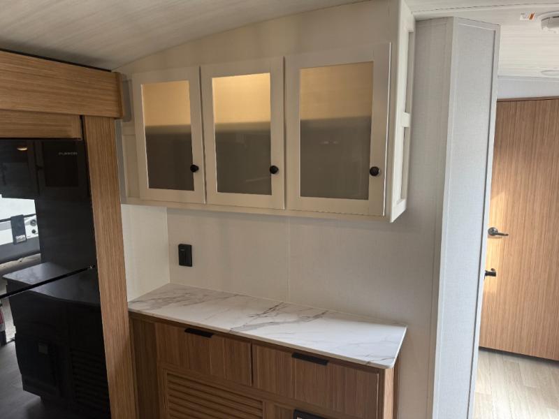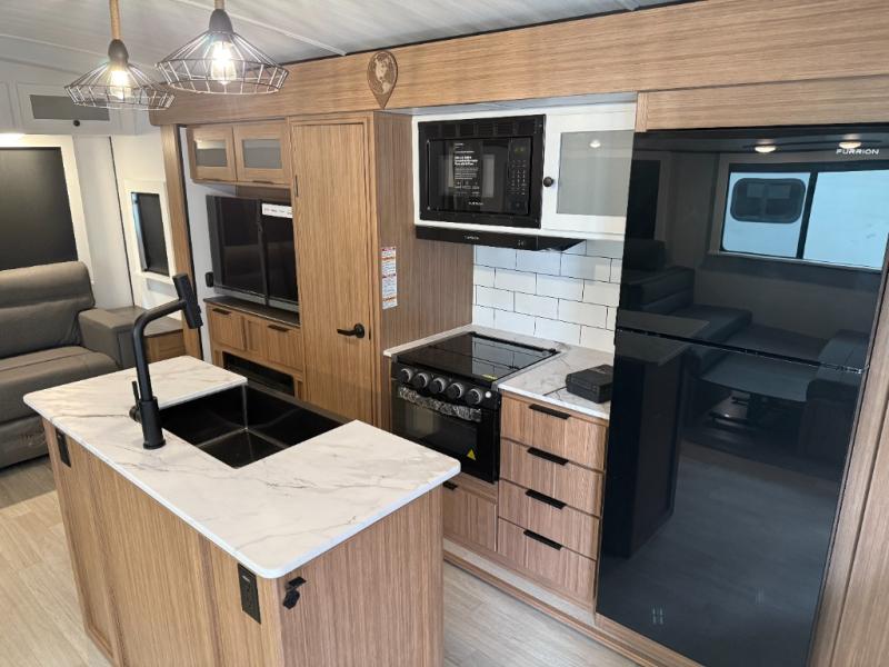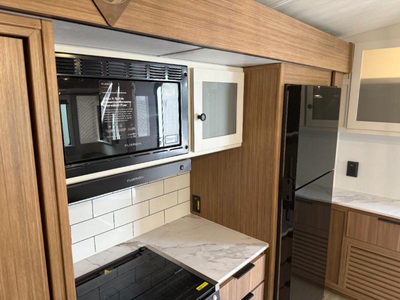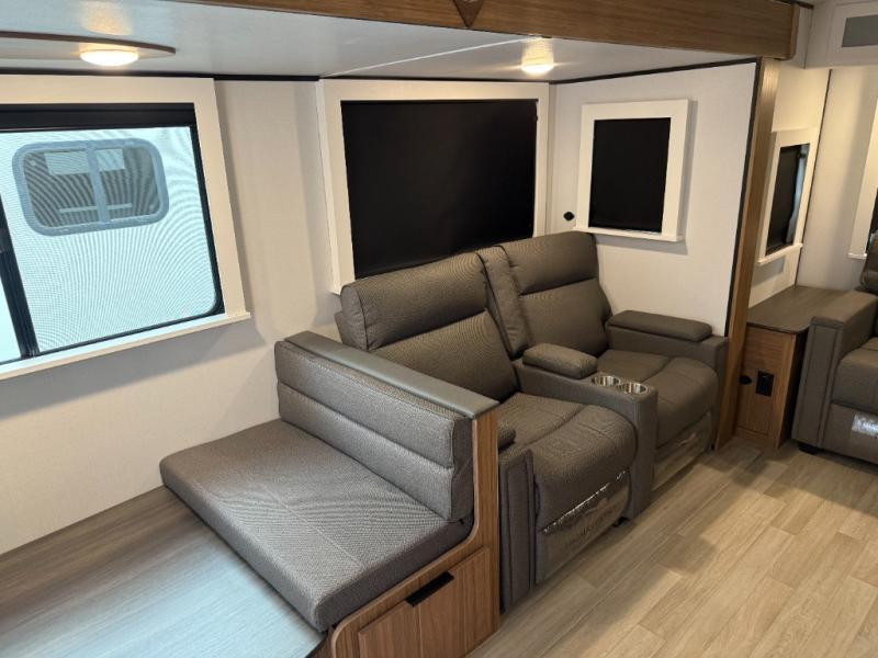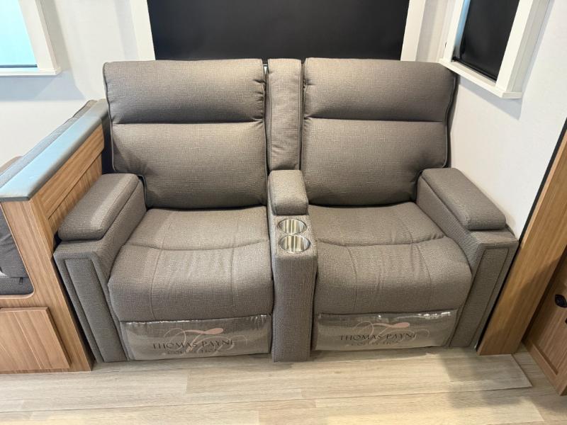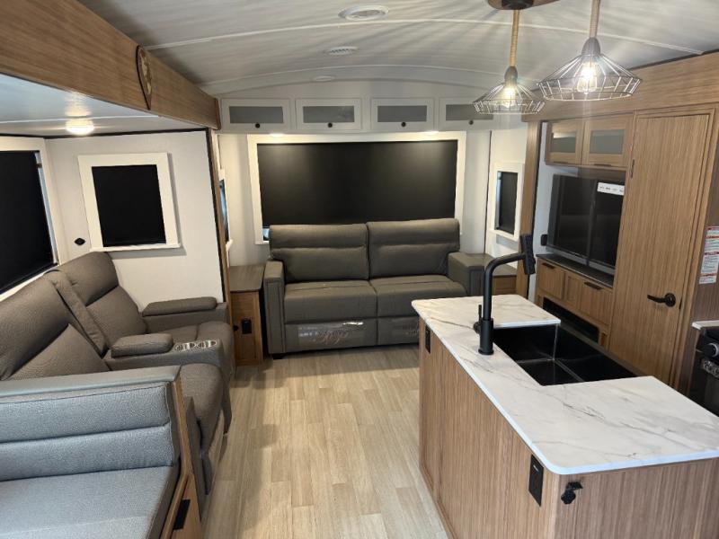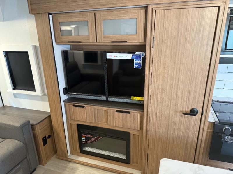 This is the travel trailer you've been searching for with a spacious interior, a front private bedroom, and a kitchen island for more counter space! Your crew can relax on the tri-fold sofa sleeper and luxury cinema theater seating, or play a game at the do-more dinette table. There is also an entertainment center and a fireplace to make this space feel more like home. A full kitchen, complete with a large pantry and 12V refrigerator will keep the chef of your group happy, and the full bath will let everyone clean up before bed. When it's time to call it a night, the front bedroom with a queen bed will be waiting for you, while your guests sleep on the sofa and dinette.