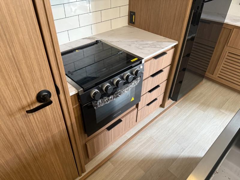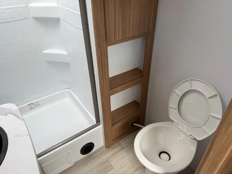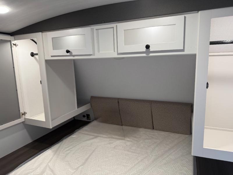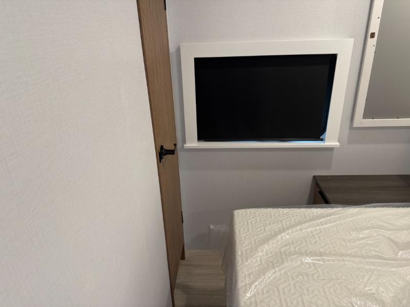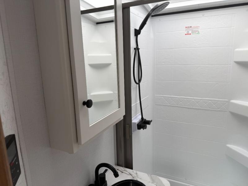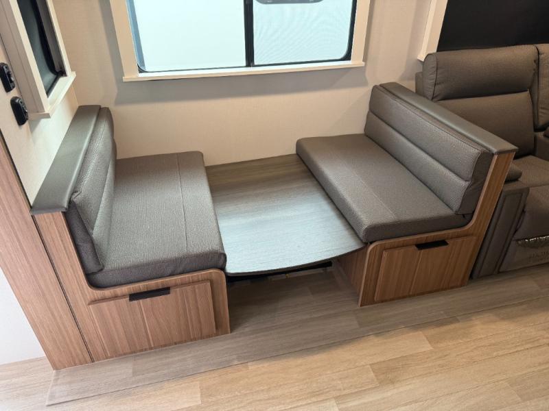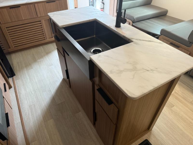This is the travel trailer you've been searching for with a spacious interior, a front private bedroom, and a kitchen island for more counter space! Your crew can relax on the tri-fold sofa sleeper and luxury cinema theater seating, or play a game at the do-more dinette table. There is also an entertainment center and a fireplace to make this space feel more like home. A full kitchen, complete with a large pantry and 12V refrigerator will keep the chef of your group happy, and the full bath will let everyone clean up before bed. When it's time to call it a night, the front bedroom with a queen bed will be waiting for you, while your guests sleep on the sofa and dinette.