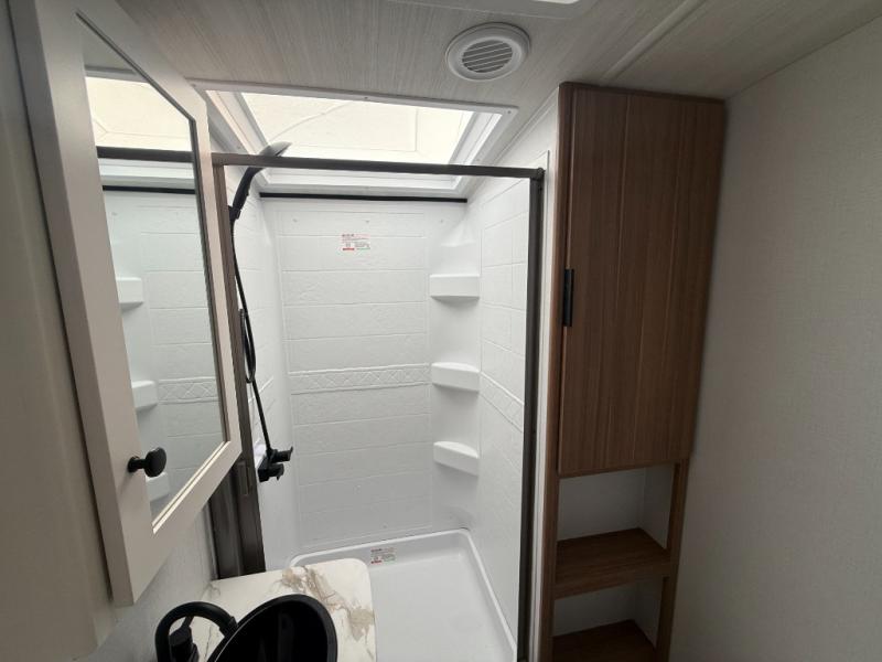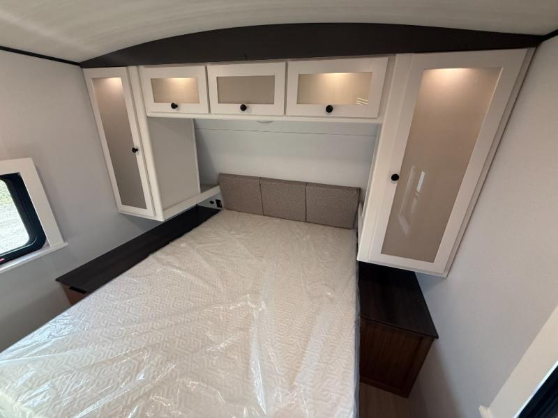 With any Keystone Passport Super Lite travel trailer you will enjoy lightweight towing and lots of interior comforts! The power tongue jack lets you hitch up at the drop of a hat, and the Dexter torsion axle rubber ride suspension will make towing easier than ever. You will appreciate having 4-point power stabilizer jacks for quick setup and an exterior convenience center to monitor tank levels. These trailers feature 5-sided aluminum construction, new premium aluminum wheels, a heated and enclosed underbelly, plus new composite solid entry steps. Inside, you'll enjoy seamless kitchen countertops, interior lights with a dimmer, a rainfall showerhead, and premium pull-down roller shades for added privacy.