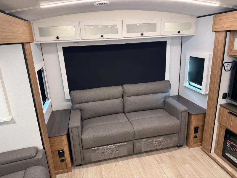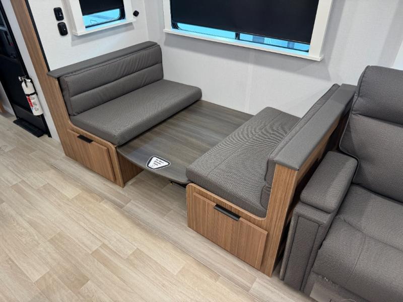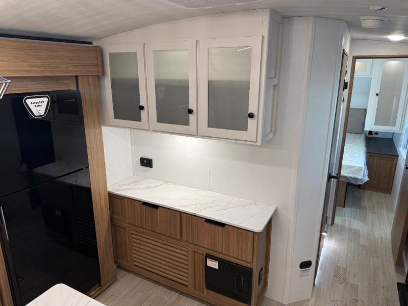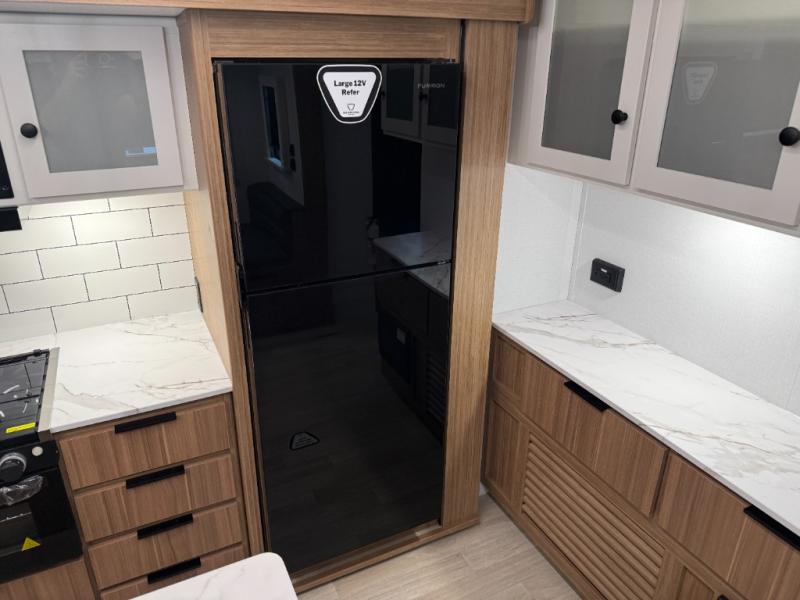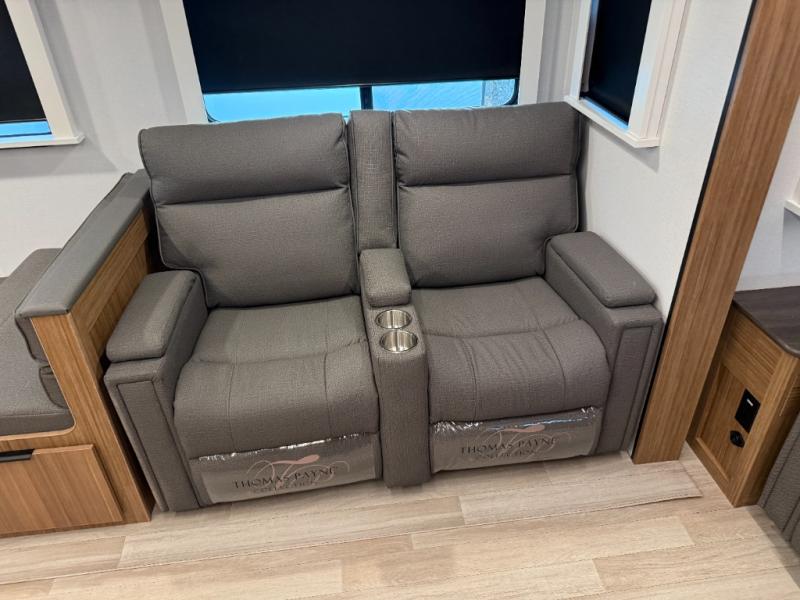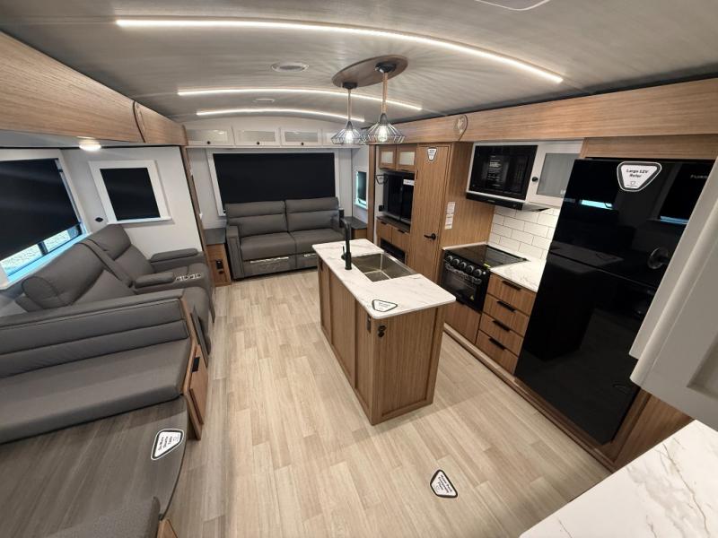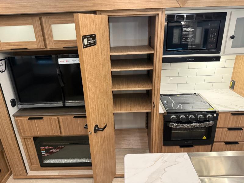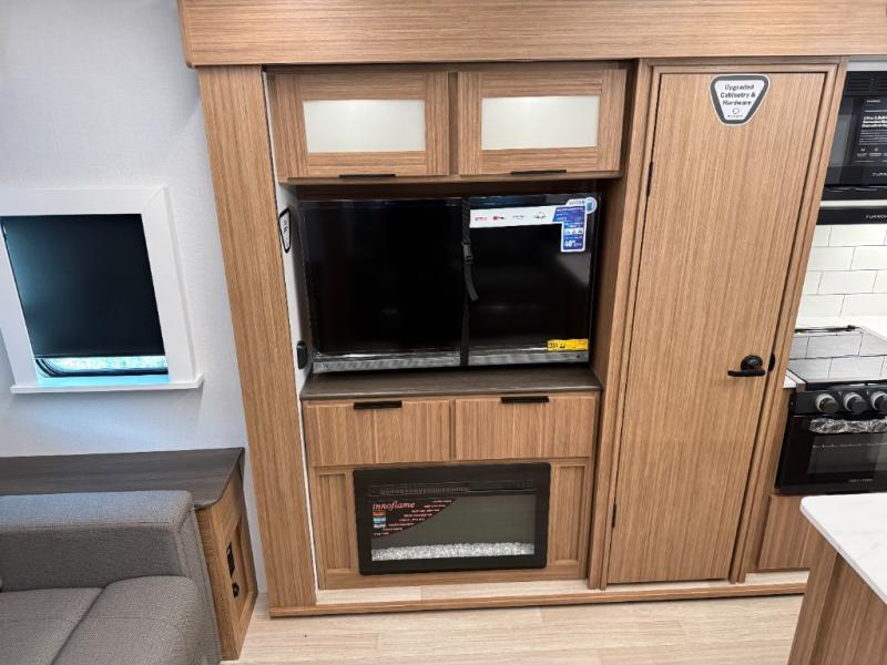 This is the travel trailer you've been searching for with a spacious interior, a front private bedroom, and a kitchen island for more counter space! Your crew can relax on the tri-fold sofa sleeper and luxury cinema theater seating, or play a game at the do-more dinette table. There is also an entertainment center and a fireplace to make this space feel more like home. A full kitchen, complete with a large pantry and 12V refrigerator will keep the chef of your group happy, and the full bath will let everyone clean up before bed. When it's time to call it a night, the front bedroom with a queen bed will be waiting for you, while your guests sleep on the sofa and dinette.
