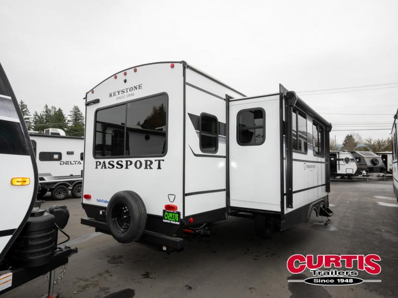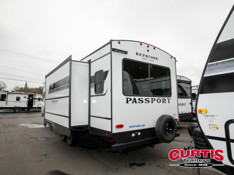 With any Keystone Passport Super Lite travel trailer you will enjoy lightweight towing and lots of interior comforts! The power tongue jack lets you hitch up at the drop of a hat, and the Dexter torsion axle rubber ride suspension will make towing easier than ever. You will appreciate having power stabilizer jacks for quick setup and an exterior convenience center to monitor tank levels. These trailers are constructed with a seamless, laminated and gel-coated filon exterior, 80% tinted safety glass windows, and a one-piece polypropylene underbelly. The interior will have you feeling right at home with residential durable Beauflor vinyl flooring, deluxe night shades, LED lighting throughout, and seamless kitchen countertops to name a few comforts.