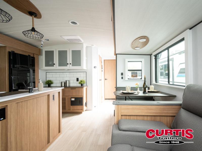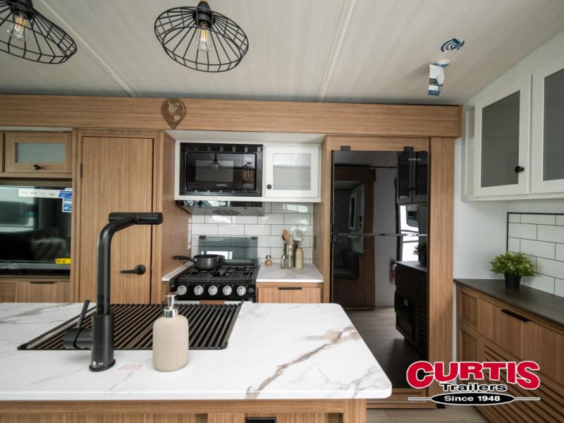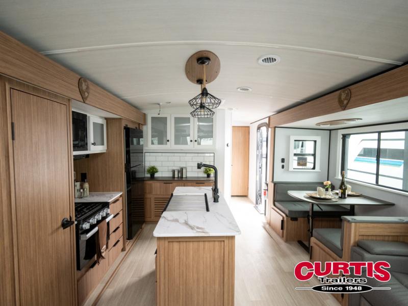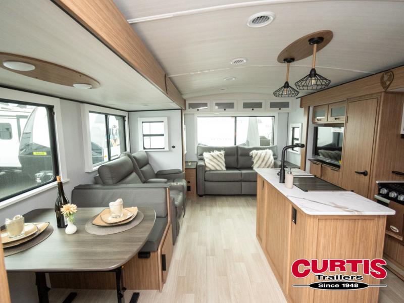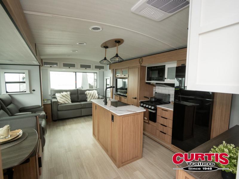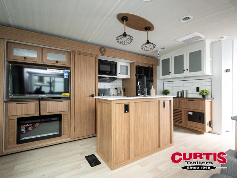 This is the travel trailer you've been searching for with a spacious interior, a front private bedroom, and a kitchen island for more counter space! Your crew can relax on the tri-fold sofa sleeper and luxury cinema theater seating, or play a game at the do-more dinette table. There is also an entertainment center and a fireplace to make this space feel more like home. A full kitchen, complete with a large pantry and 12V refrigerator will keep the chef of your group happy, and the full bath will let everyone clean up before bed. When it's time to call it a night, the front bedroom with a queen bed will be waiting for you, while your guests sleep on the sofa and dinette.