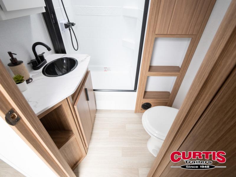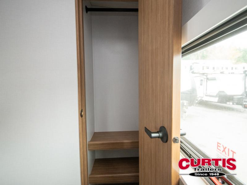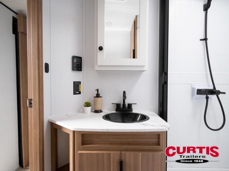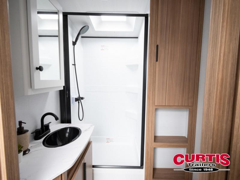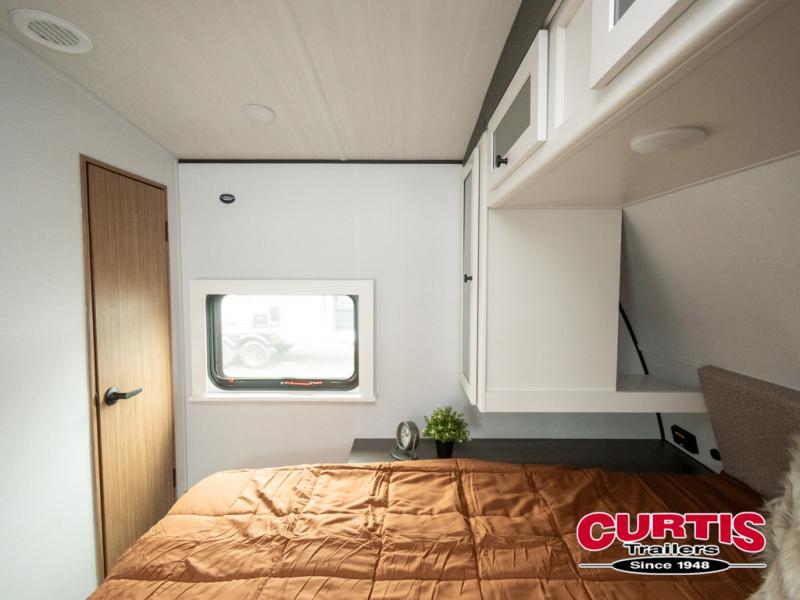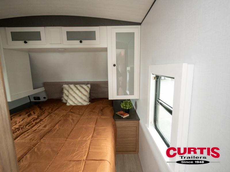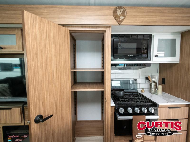 This is the travel trailer you've been searching for with a spacious interior, a front private bedroom, and a kitchen island for more counter space! Your crew can relax on the tri-fold sofa sleeper and luxury cinema theater seating, or play a game at the do-more dinette table. There is also an entertainment center and a fireplace to make this space feel more like home. A full kitchen, complete with a large pantry and 12V refrigerator will keep the chef of your group happy, and the full bath will let everyone clean up before bed. When it's time to call it a night, the front bedroom with a queen bed will be waiting for you, while your guests sleep on the sofa and dinette.
