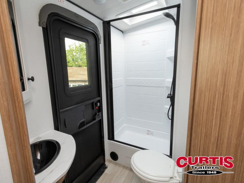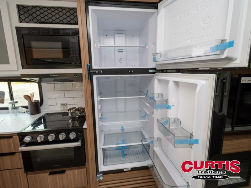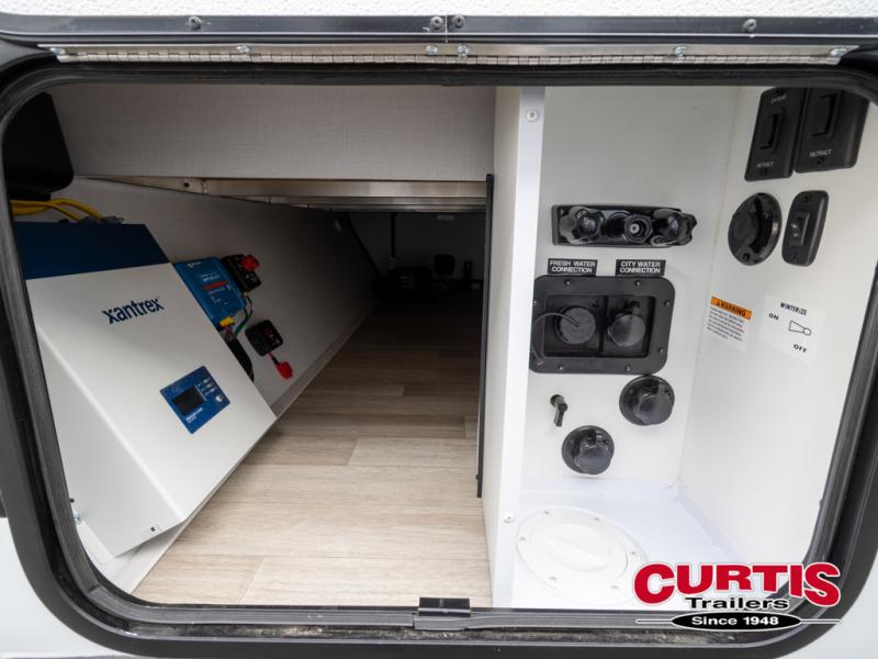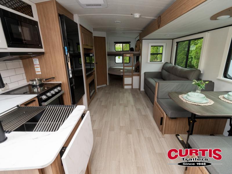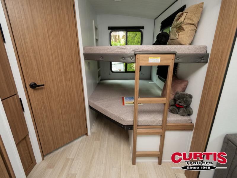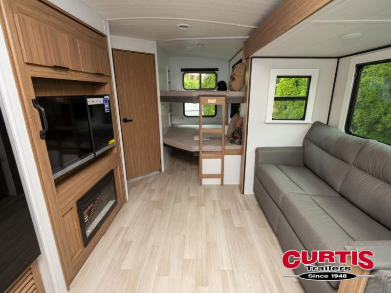 Camping at your favorite campground in this bunkhouse model will be just what the doctor ordered! One of the bunks is a flip-up bunk for added storage, and the full bath with its own exterior entry door is close by for easy nighttime use. The combined living area and kitchen is made spacious by the large slide out, and here you can relax on the tri-fold sofa and do-more dinette. There is also an entertainment center with a fireplace to make this space feel a little more like home. The chef of your group can choose to cook indoors or outdoors on the exterior kitchen with a griddle, and there is a 21' awning for shade. This unit also includes a front private bedroom with a queen bed and dual wardrobes to keep your things tidy.