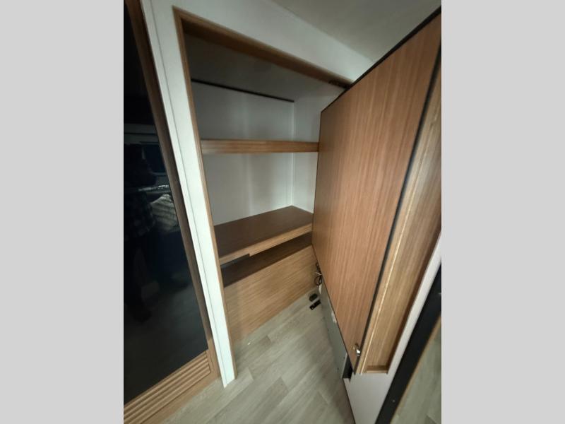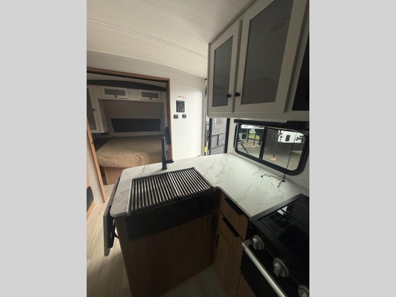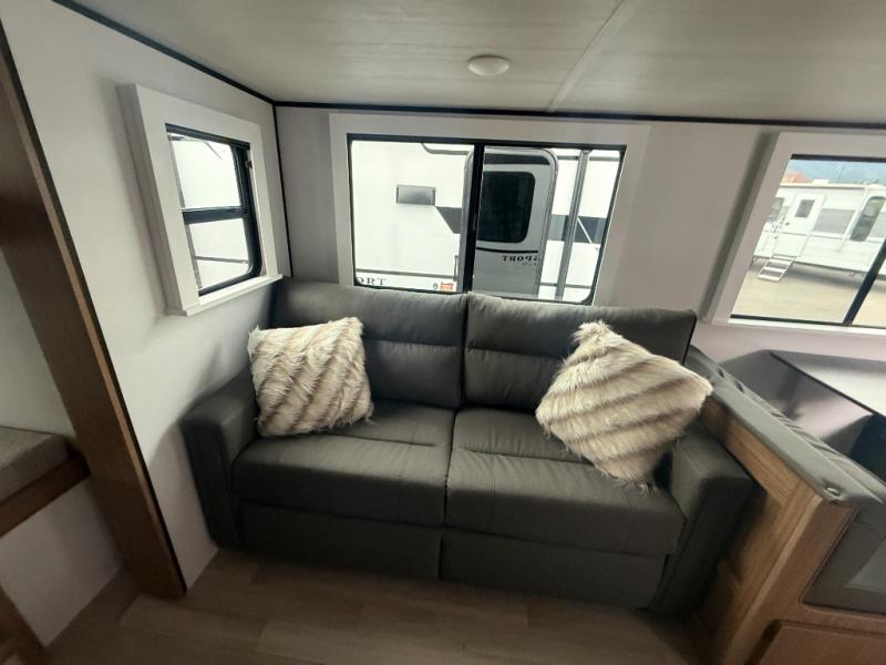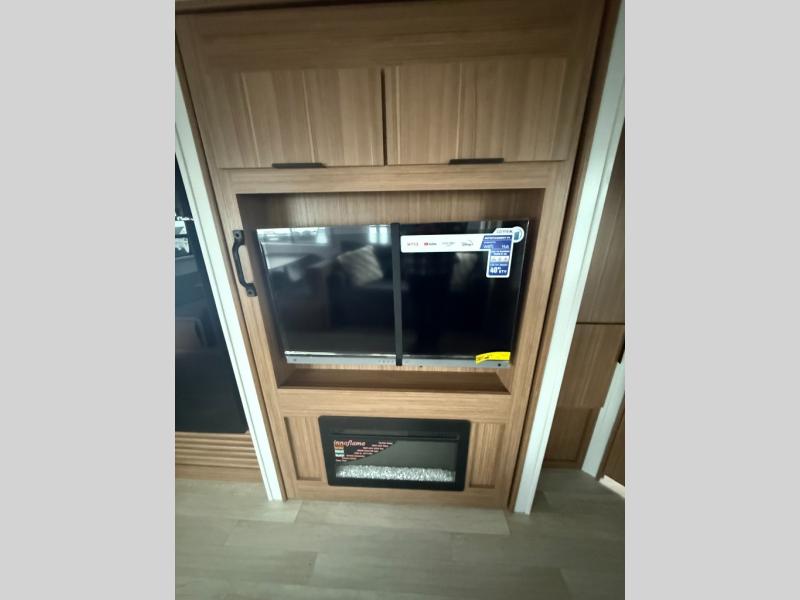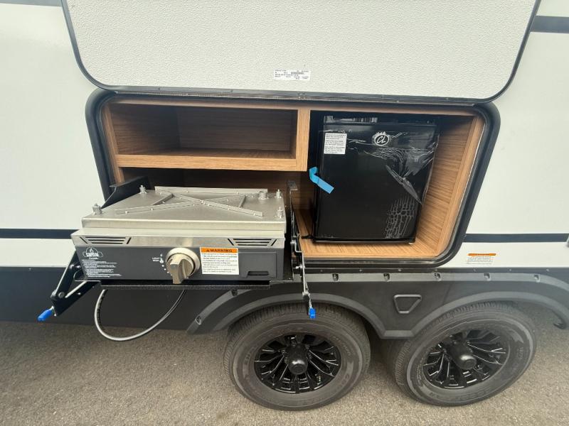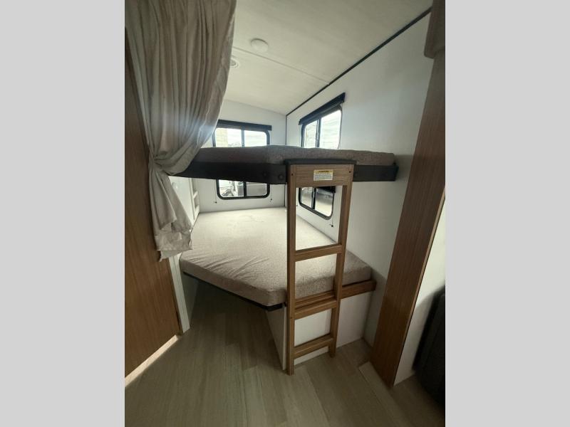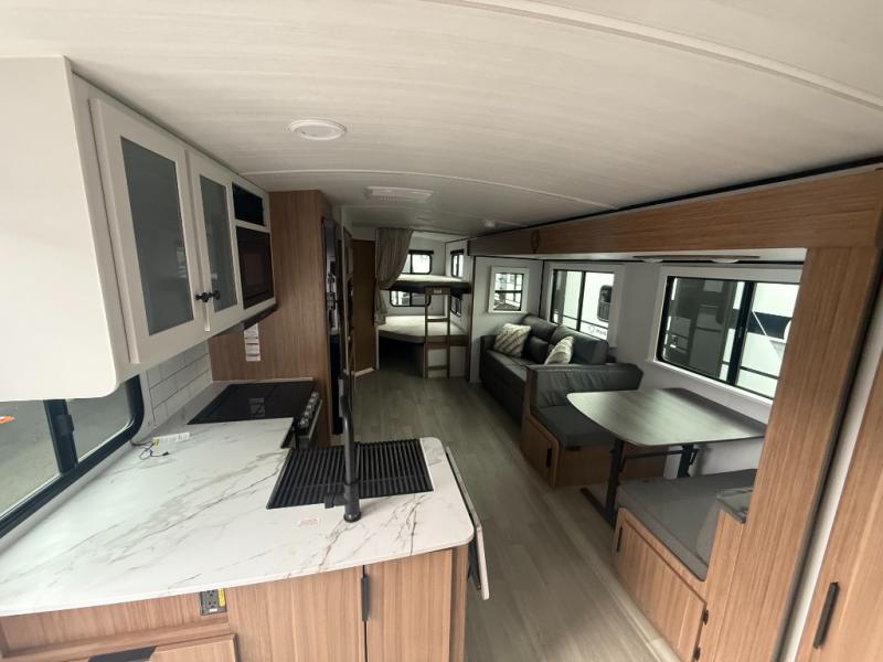 Camping at your favorite campground in this bunkhouse model will be just what the doctor ordered! One of the bunks is a flip-up bunk for added storage, and the full bath with its own exterior entry door is close by for easy nighttime use. The combined living area and kitchen is made spacious by the large slide out, and here you can relax on the tri-fold sofa and do-more dinette. There is also an entertainment center with a fireplace to make this space feel a little more like home. The chef of your group can choose to cook indoors or outdoors on the exterior kitchen with a griddle, and there is a 21' awning for shade. This unit also includes a front private bedroom with a queen bed and dual wardrobes to keep your things tidy.