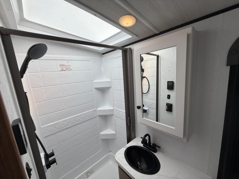 If you're looking for a travel trailer with more interior space and a large sleeping capacity, this is the one! The rear bunkhouse includes quad bunks with flip-up bottom bunks for added space when they're not in use. There are also two wardrobes/closets here and an entertainment center if you want to add a TV. While your guests enjoy this space, you'll have the front private bedroom all to yourselves with a queen bed, dual nightstands, and dual wardrobes to keep your clothes organized. Everyone can meet in the middle living area and kitchen to dine around the U-shaped do-more dinette table or relax on the tri-fold sofa sleeper. There is a full kitchen with a flip-up countertop for more prep space, and the pantry will be perfect for snacks. This unit also includes a full bath with one of the dual entry doors for added convenience!