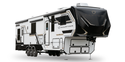 Experience a breath of fresh air with one of these Keystone RV Raptor fifth wheel toy haulers! Their rugged construction consists of a one-piece Alpha Super Flex TPO roof membrane, Dyna Span floor decking, and 5,000 lb. frame-welded tie- downs to keep your toys in place as you travel. Some unexpected conveniences you will appreciate include an Omni-Chill A/C system to keep you cool on those hot summer days, a Furrion backup camera, MaxTurn™ technology with a Helux™ pin box, and a Generation 3 iN-Command smart automation system with Global Connect to make life easier. There is also designer style vinyl flooring throughout, along with hardwood ceiling treatment with LED accent lighting, beach wood and white cabinetry, and many more interior comforts!