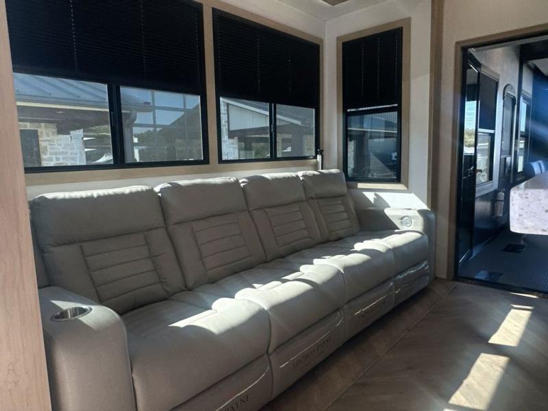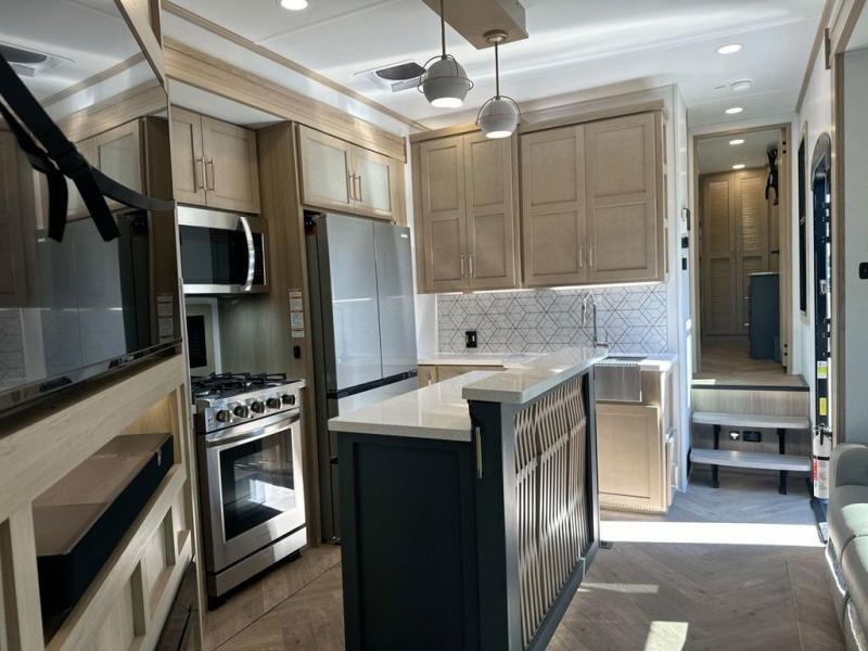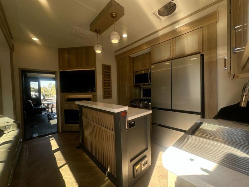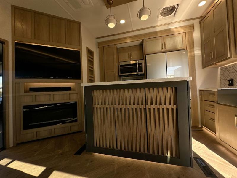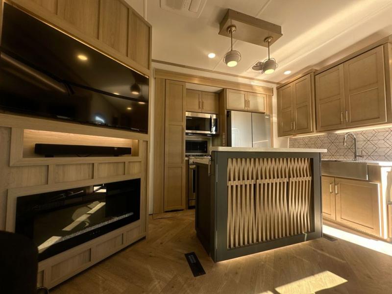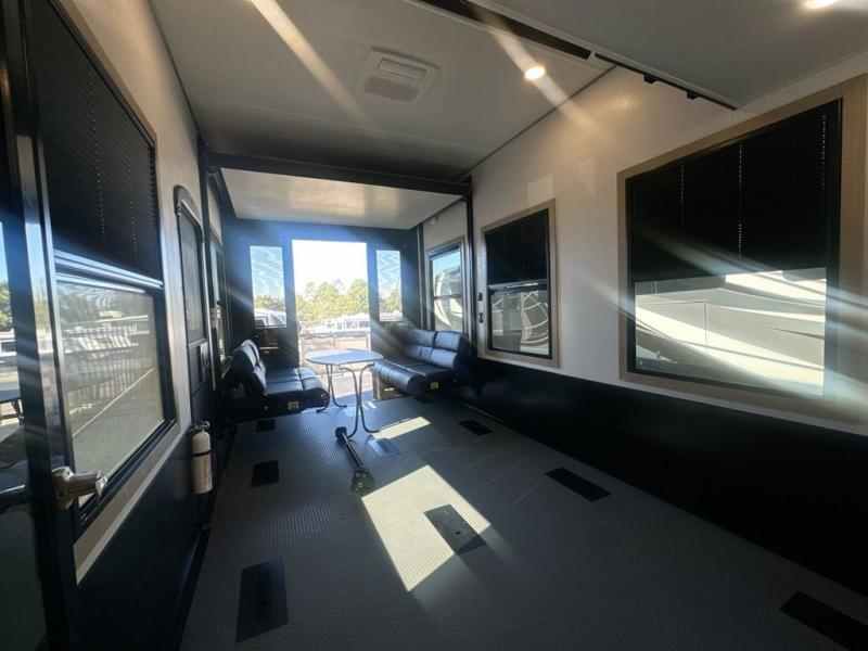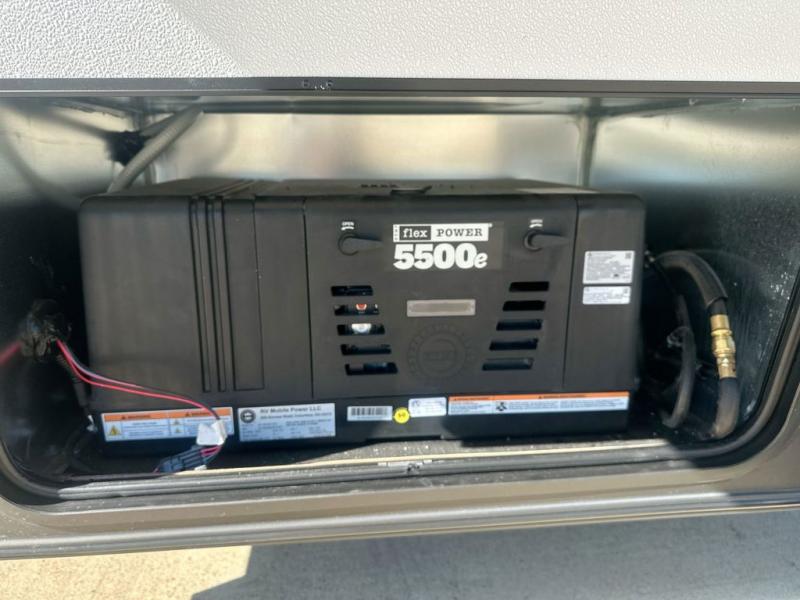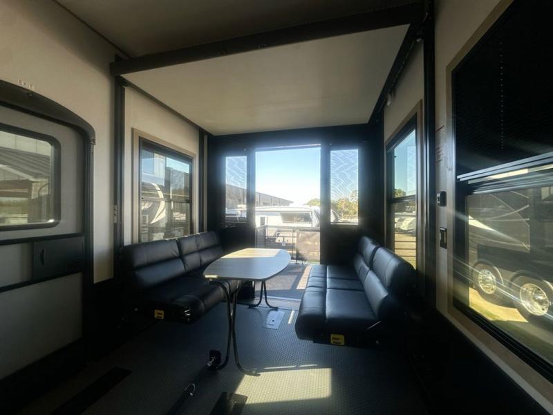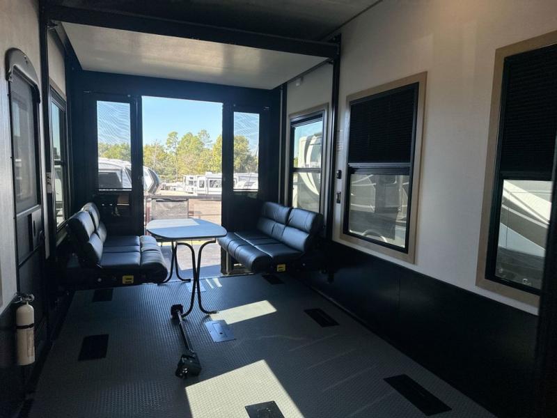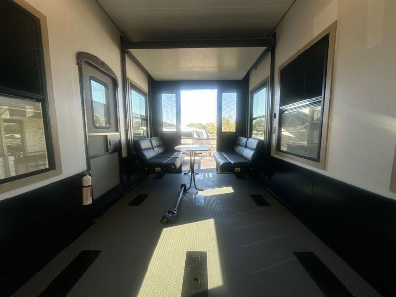 You will have everything you need for a comfortable camping trip and then some with this toy hauler! Load your toys into the 16' garage area with the Lippert Power Play motorized ramp door and secure them with 5,000 lb. frame welded tie-downs. The garage also has an electric bed above dual opposing sofas with a loft with a twin bed and a half bathroom. Create your best meals with the four-burner cooktop and enjoy the company of others sitting at the kitchen island with three bar stools while you prepare it. Relax in true comfort on the 4-seat recliner across from the entertainment center with a fireplace. When you're ready to wind down your nights, take a hot shower in the full bathroom then head directly into the front private bedroom which features a king bed suite with a large front wardrobe for clothing storage, and washer/dryer prep in case you wish to add appliances so you can wash your clothes while you are away!
