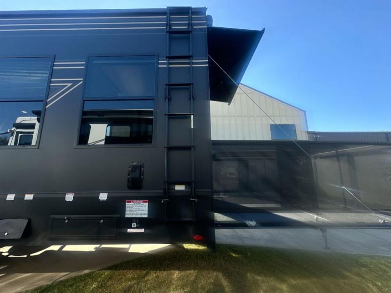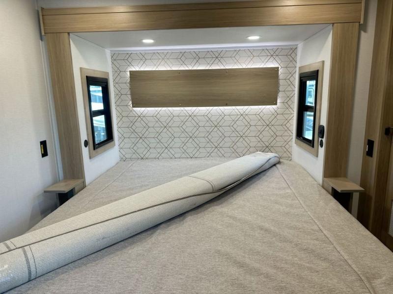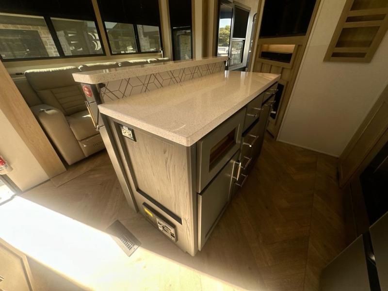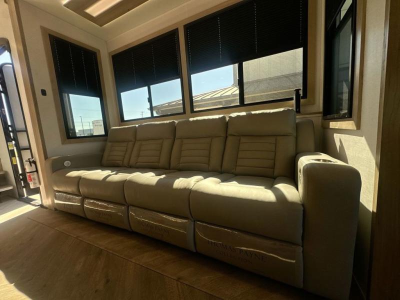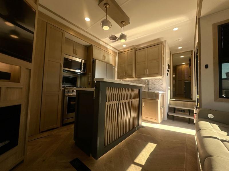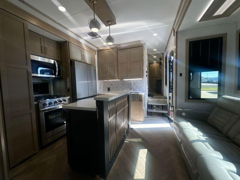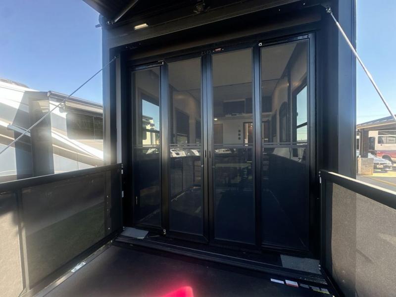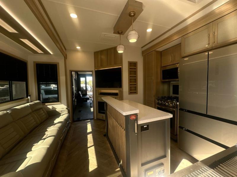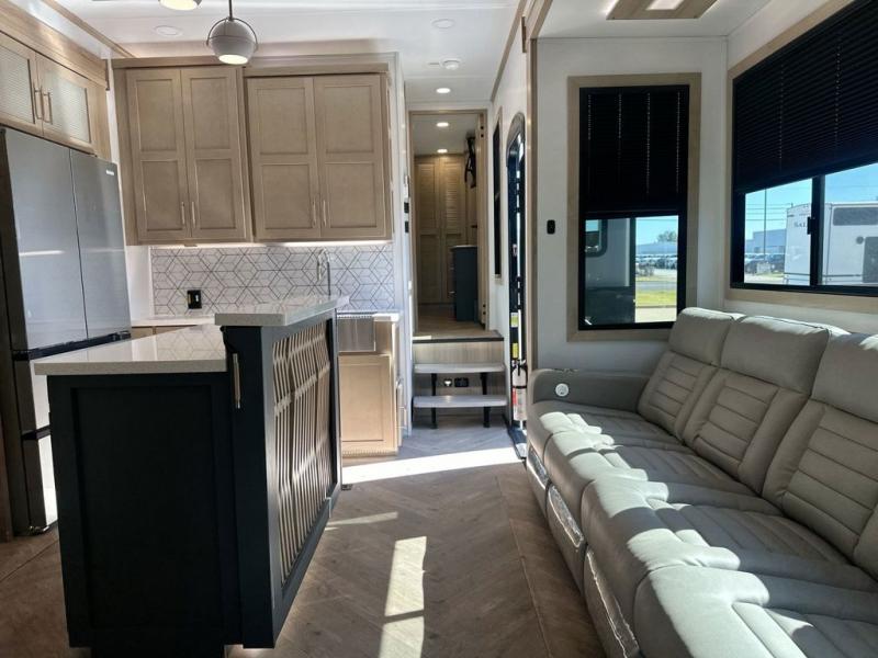 You will have everything you need for a comfortable camping trip and then some with this toy hauler! Load your toys into the 16' garage area with the Lippert Power Play motorized ramp door and secure them with 5,000 lb. frame welded tie-downs. The garage also has an electric bed above dual opposing sofas with a loft with a twin bed and a half bathroom. Create your best meals with the four-burner cooktop and enjoy the company of others sitting at the kitchen island with three bar stools while you prepare it. Relax in true comfort on the 4-seat recliner across from the entertainment center with a fireplace. When you're ready to wind down your nights, take a hot shower in the full bathroom then head directly into the front private bedroom which features a king bed suite with a large front wardrobe for clothing storage, and washer/dryer prep in case you wish to add appliances so you can wash your clothes while you are away!