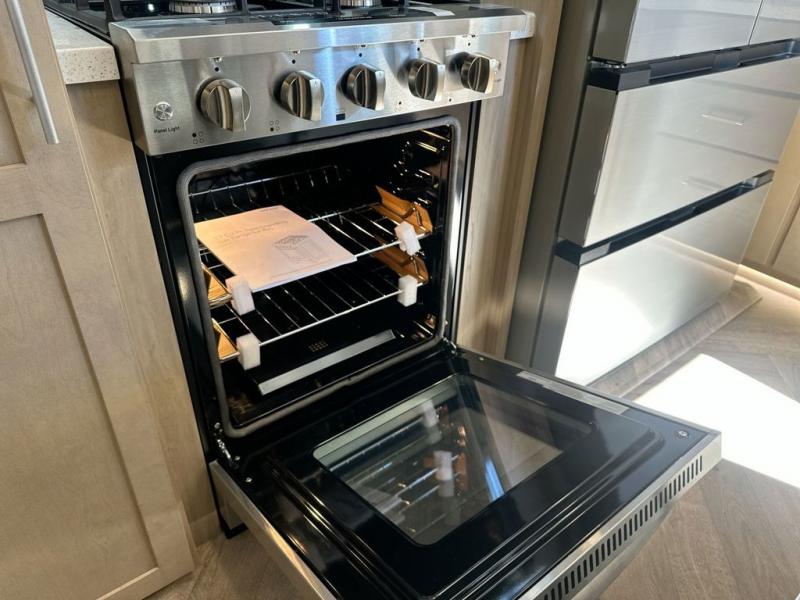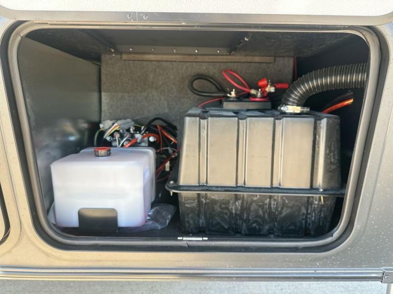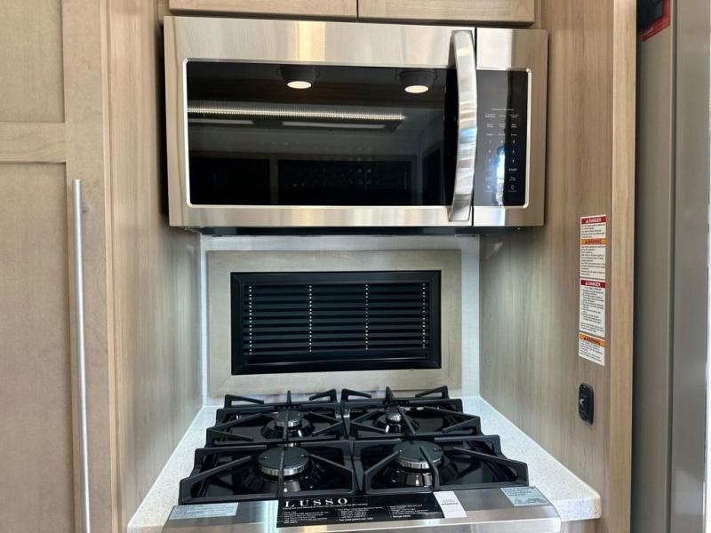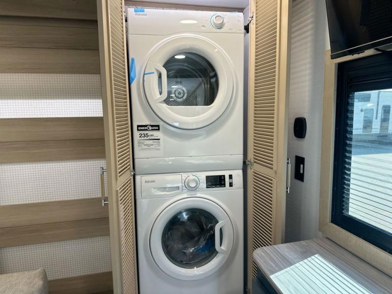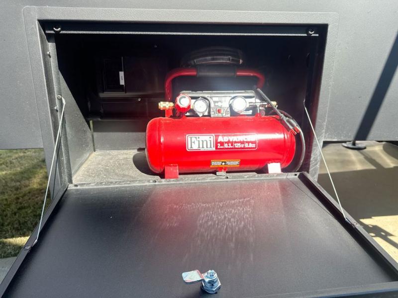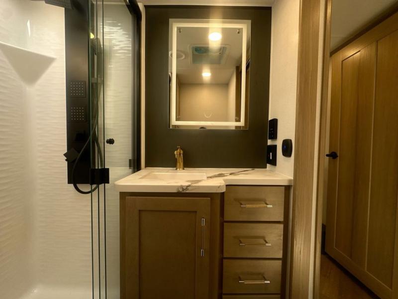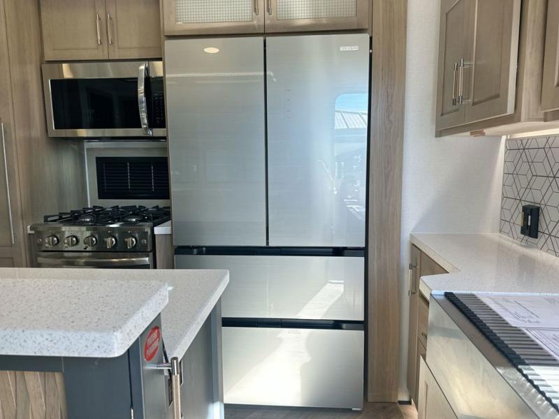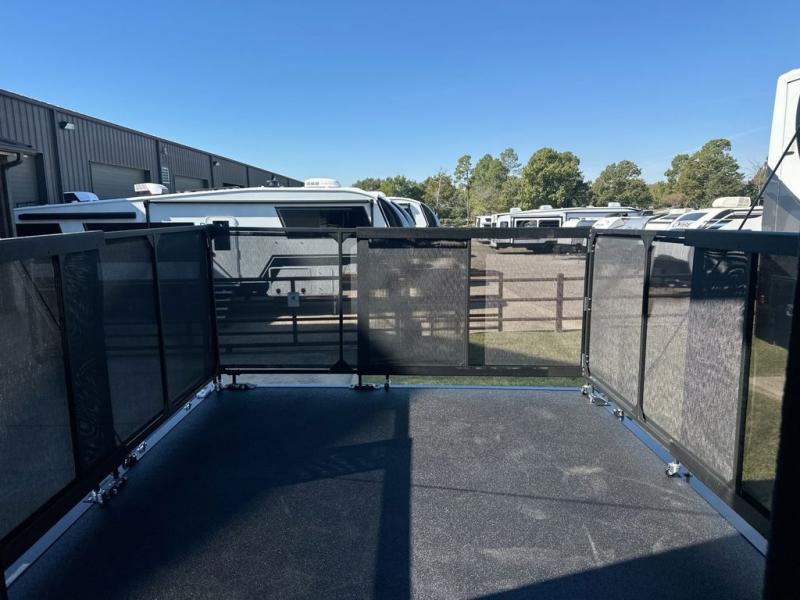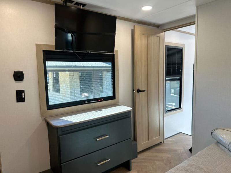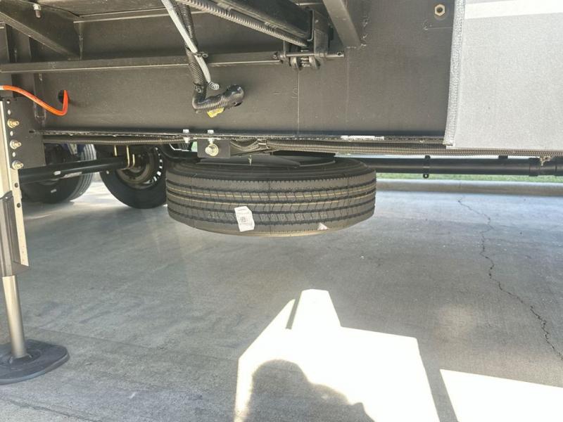 You will have everything you need for a comfortable camping trip and then some with this toy hauler! Load your toys into the 16' garage area with the Lippert Power Play motorized ramp door and secure them with 5,000 lb. frame welded tie-downs. The garage also has an electric bed above dual opposing sofas with a loft with a twin bed and a half bathroom. Create your best meals with the four-burner cooktop and enjoy the company of others sitting at the kitchen island with three bar stools while you prepare it. Relax in true comfort on the 4-seat recliner across from the entertainment center with a fireplace. When you're ready to wind down your nights, take a hot shower in the full bathroom then head directly into the front private bedroom which features a king bed suite with a large front wardrobe for clothing storage, and washer/dryer prep in case you wish to add appliances so you can wash your clothes while you are away!