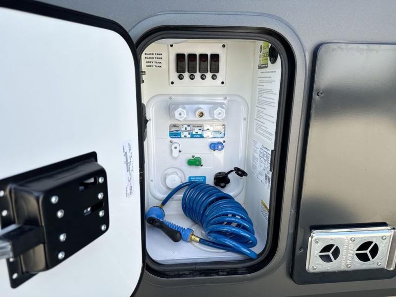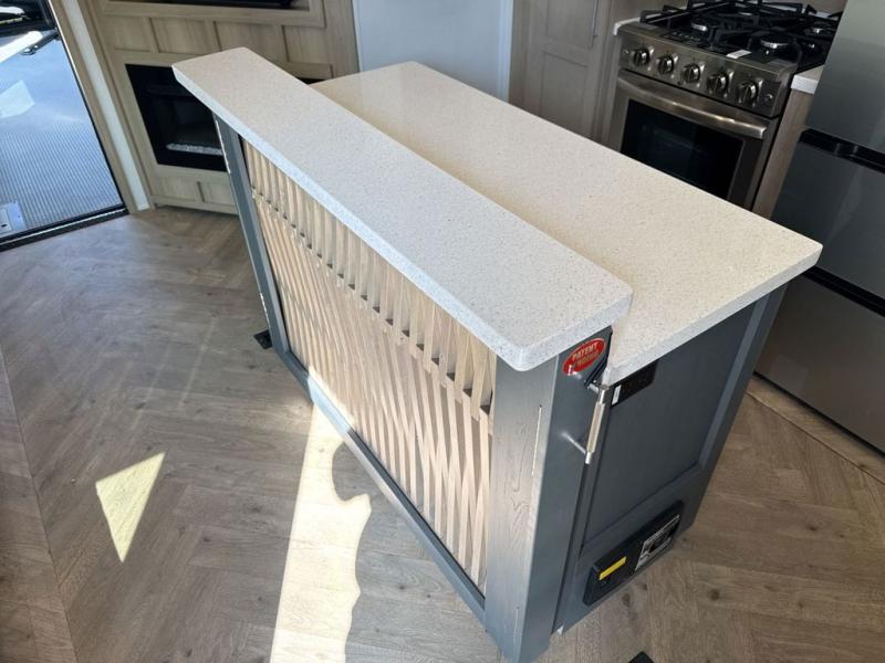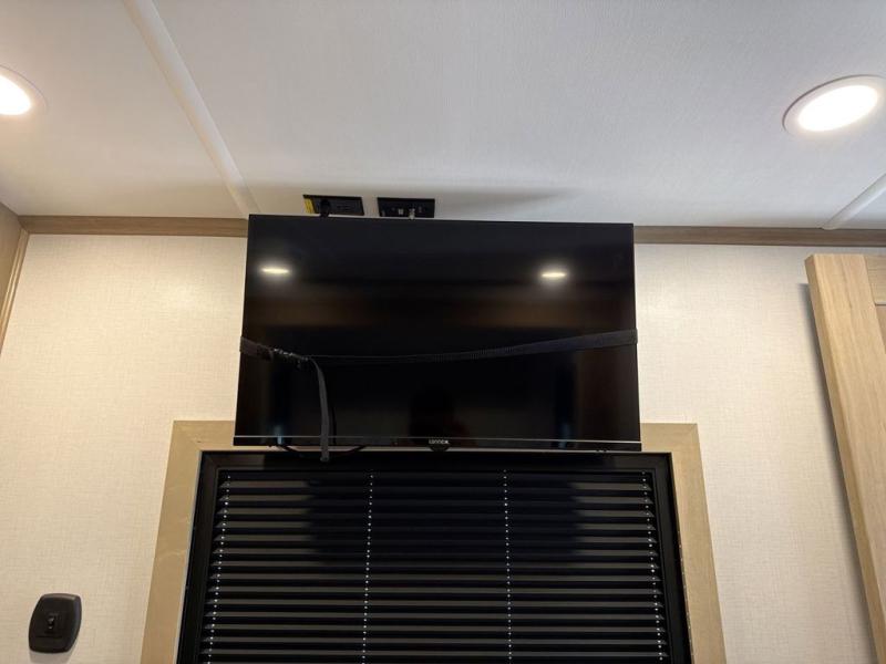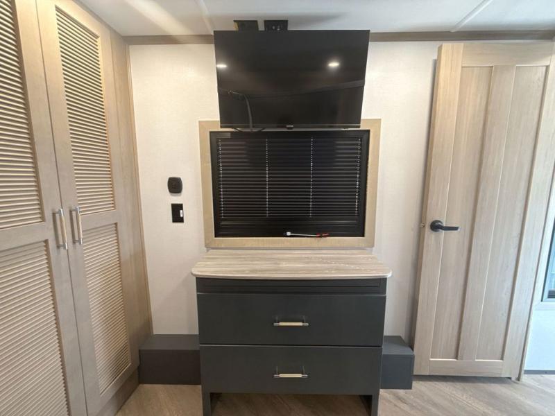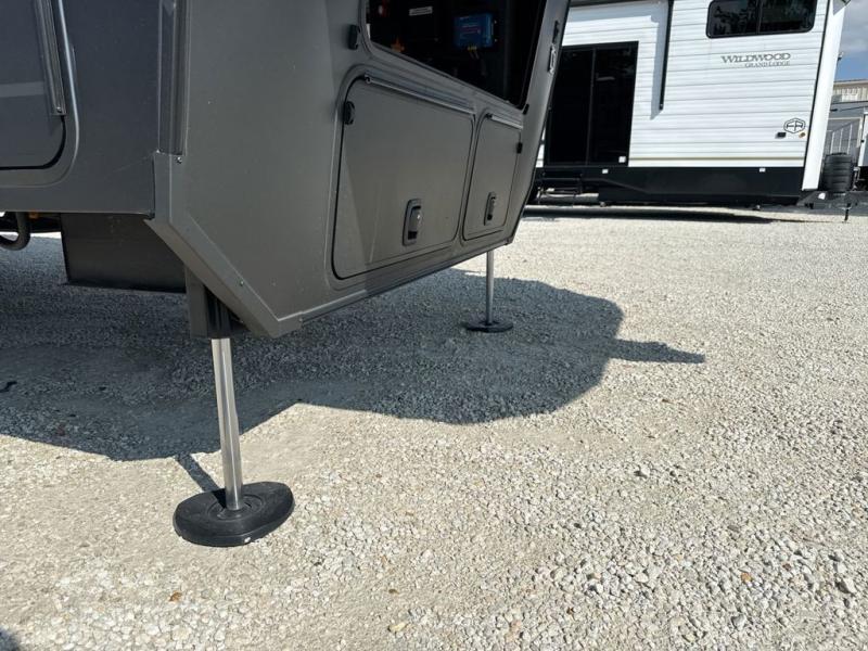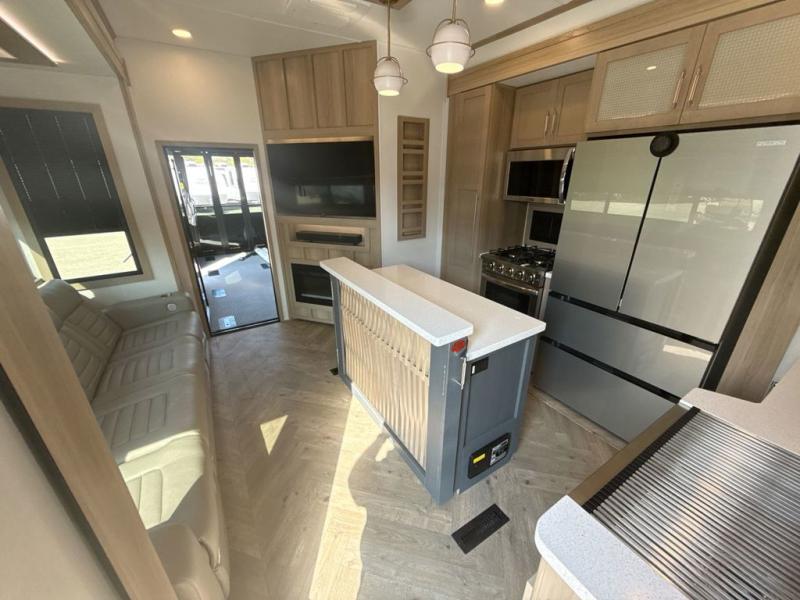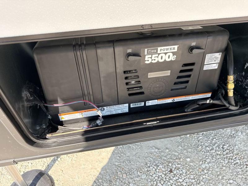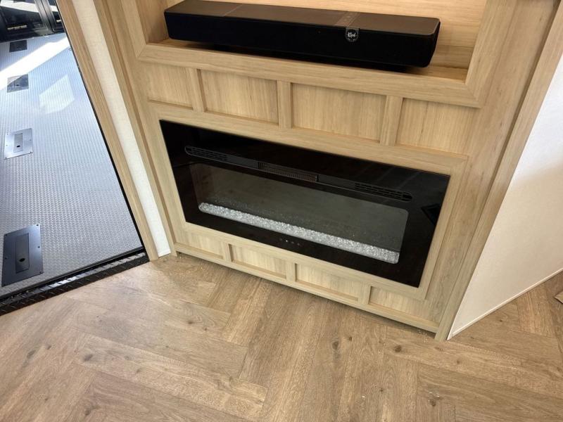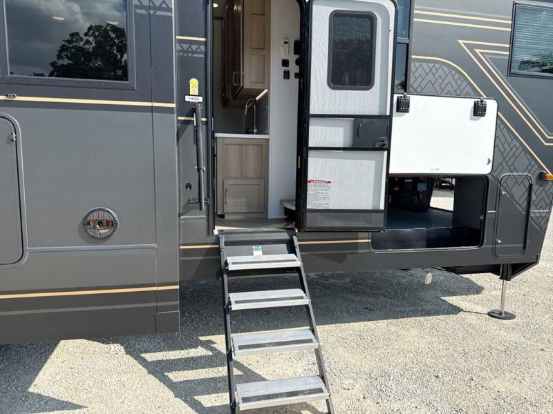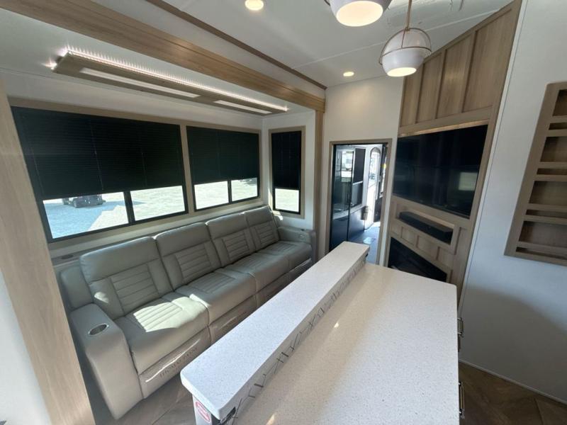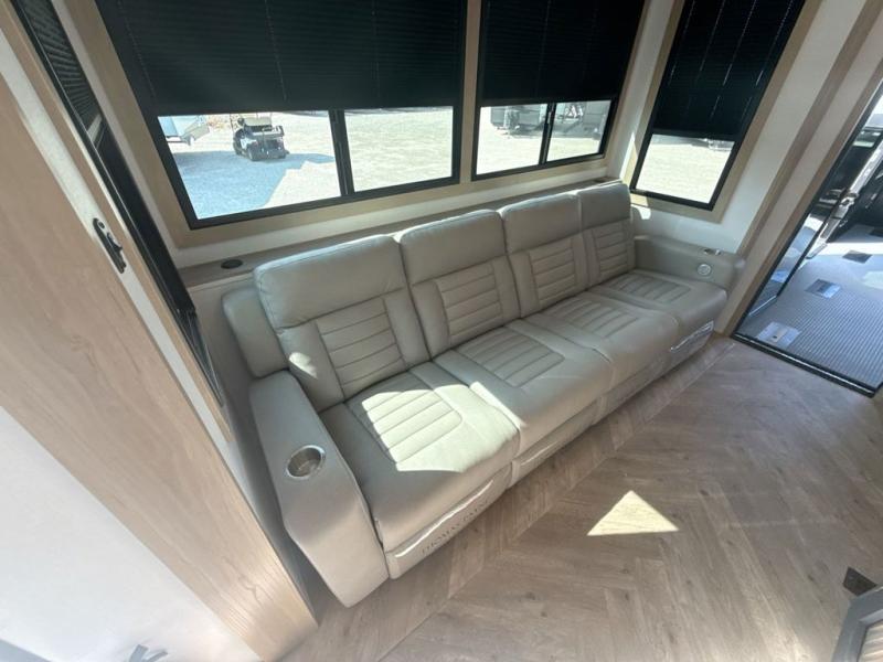 You will have everything you need for a comfortable camping trip and then some with this toy hauler! Load your toys into the 16' garage area with the Lippert Power Play motorized ramp door and secure them with 5,000 lb. frame welded tie-downs. The garage also has an electric bed above dual opposing sofas with a loft with a twin bed and a half bathroom. Create your best meals with the four-burner cooktop and enjoy the company of others sitting at the kitchen island with three bar stools while you prepare it. Relax in true comfort on the 4-seat recliner across from the entertainment center with a fireplace. When you're ready to wind down your nights, take a hot shower in the full bathroom then head directly into the front private bedroom which features a king bed suite with a large front wardrobe for clothing storage, and washer/dryer prep in case you wish to add appliances so you can wash your clothes while you are away!