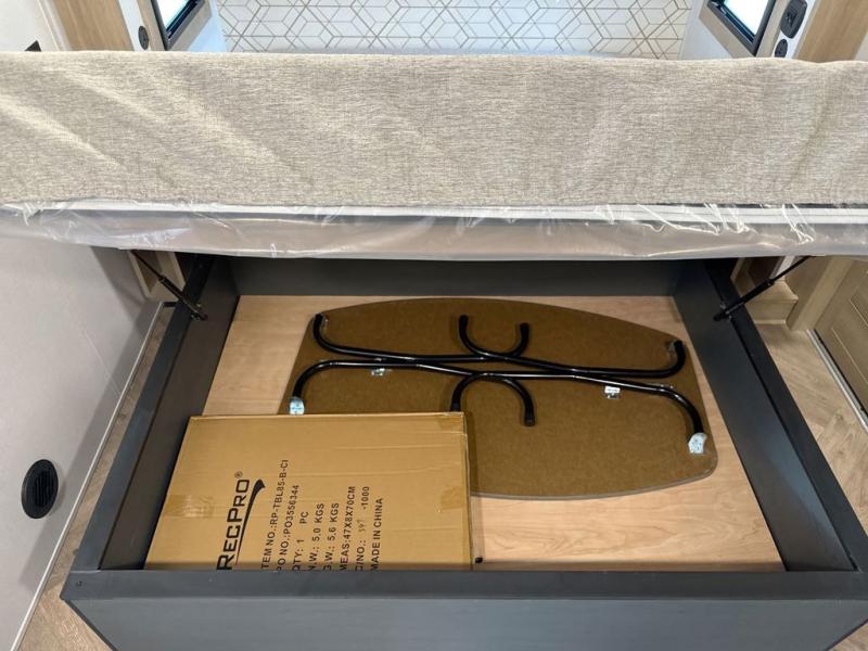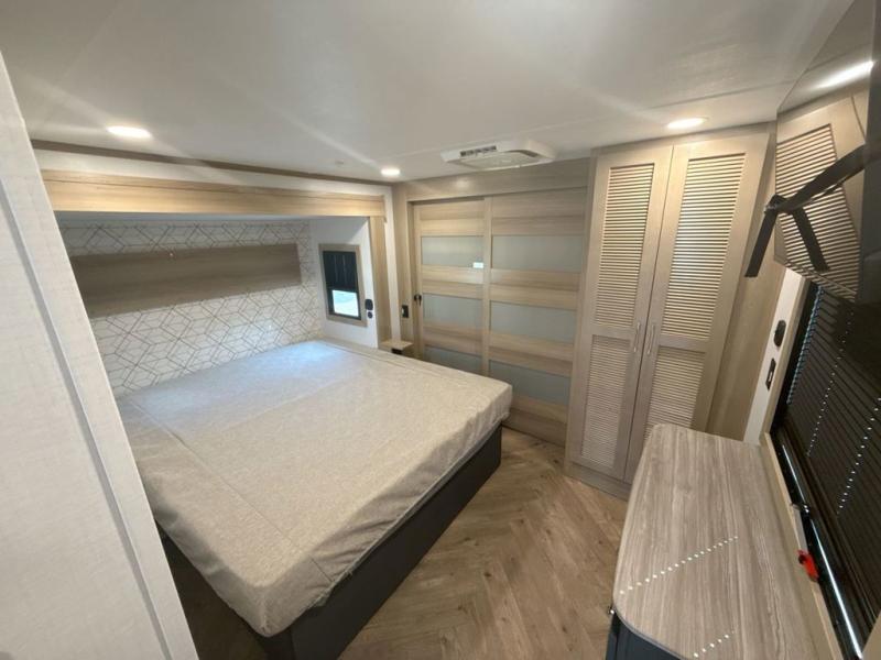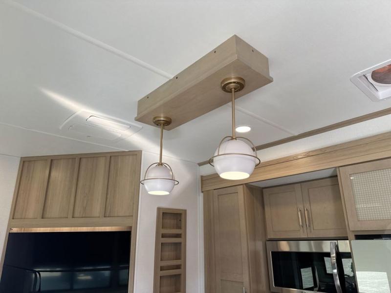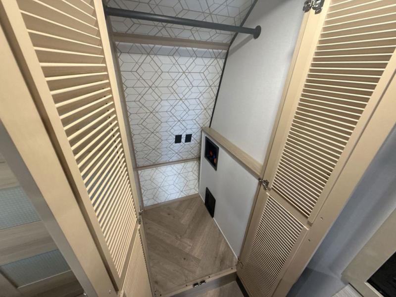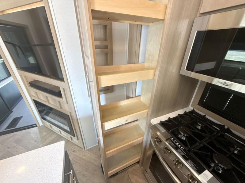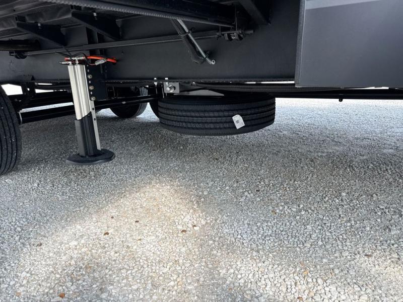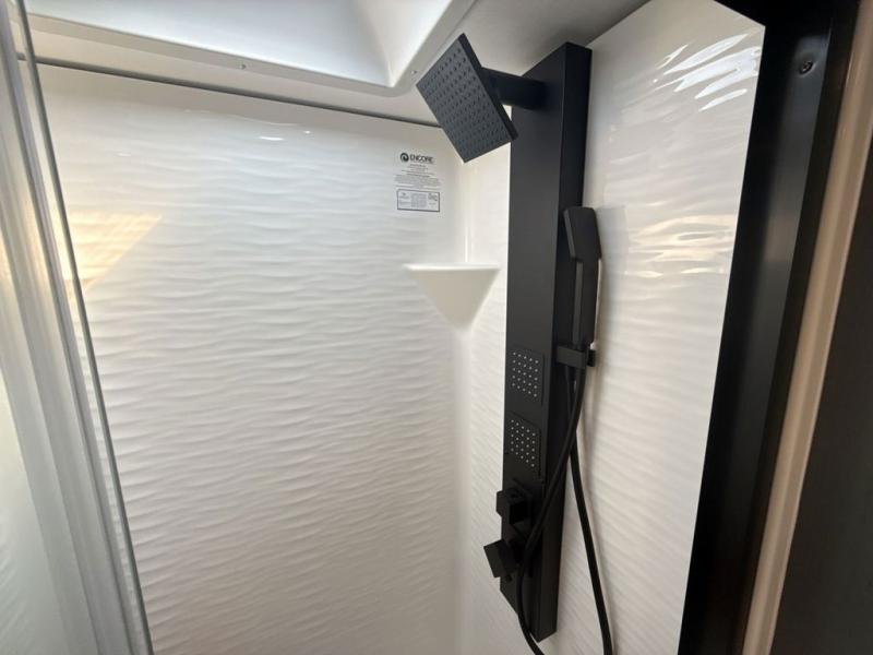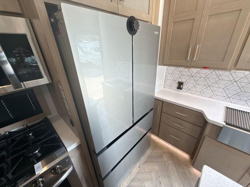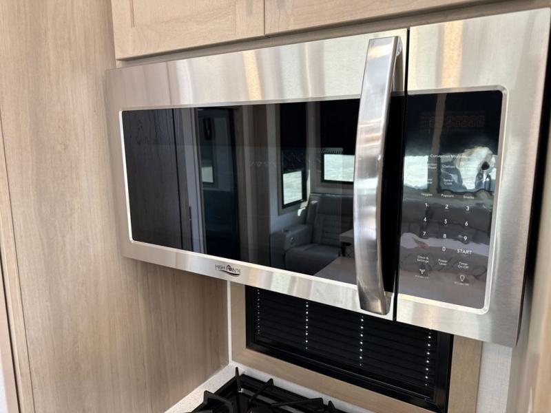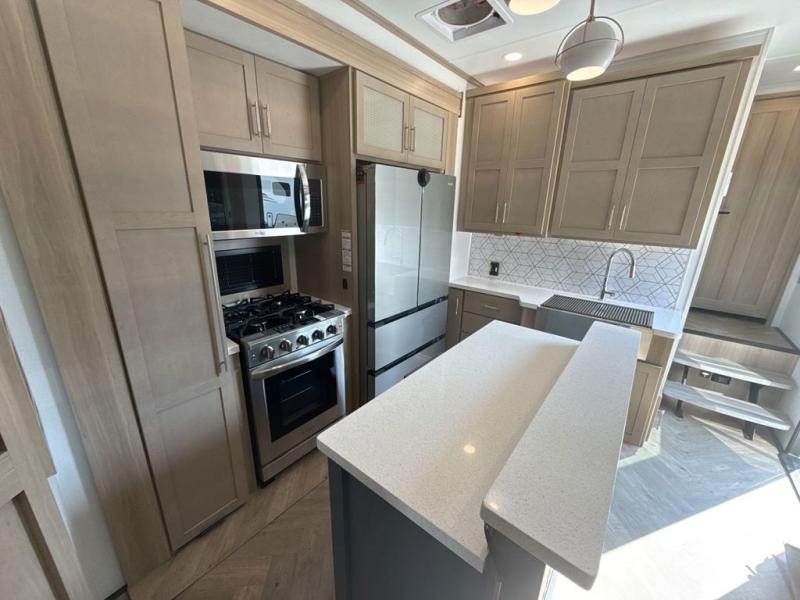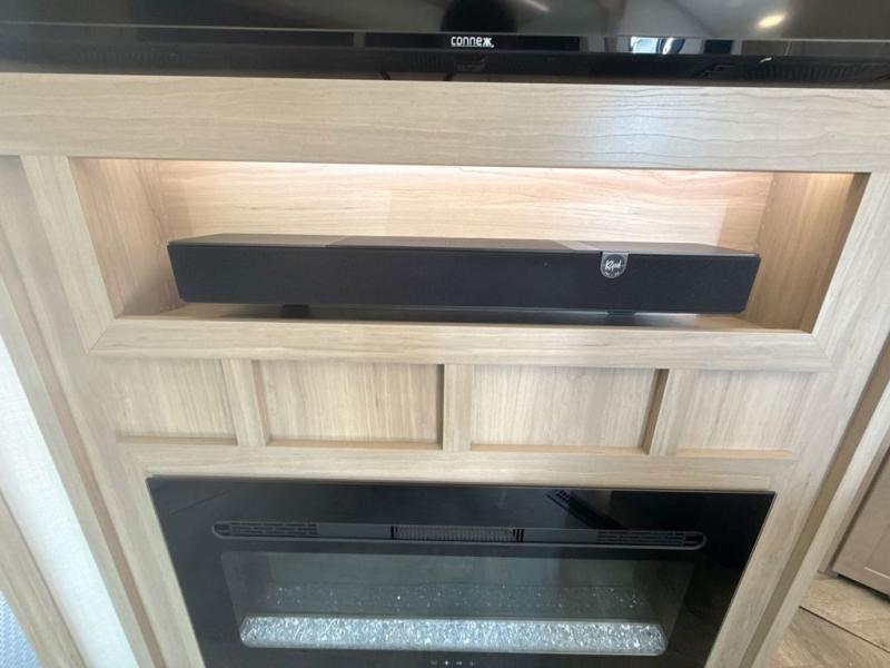 You will have everything you need for a comfortable camping trip and then some with this toy hauler! Load your toys into the 16' garage area with the Lippert Power Play motorized ramp door and secure them with 5,000 lb. frame welded tie-downs. The garage also has an electric bed above dual opposing sofas with a loft with a twin bed and a half bathroom. Create your best meals with the four-burner cooktop and enjoy the company of others sitting at the kitchen island with three bar stools while you prepare it. Relax in true comfort on the 4-seat recliner across from the entertainment center with a fireplace. When you're ready to wind down your nights, take a hot shower in the full bathroom then head directly into the front private bedroom which features a king bed suite with a large front wardrobe for clothing storage, and washer/dryer prep in case you wish to add appliances so you can wash your clothes while you are away!