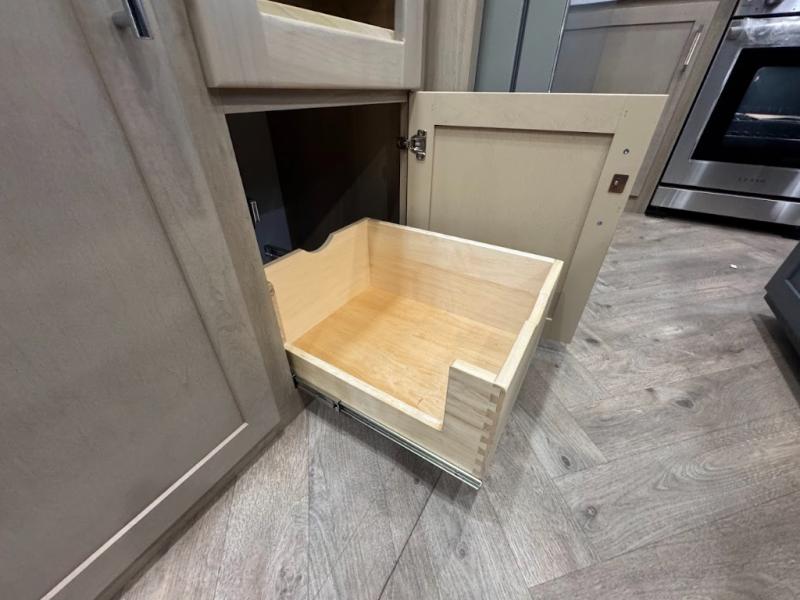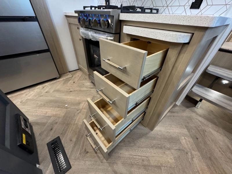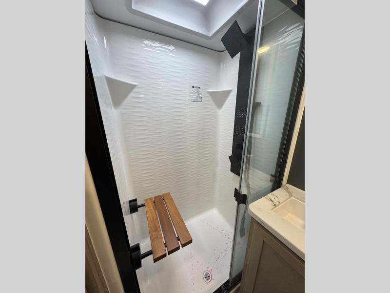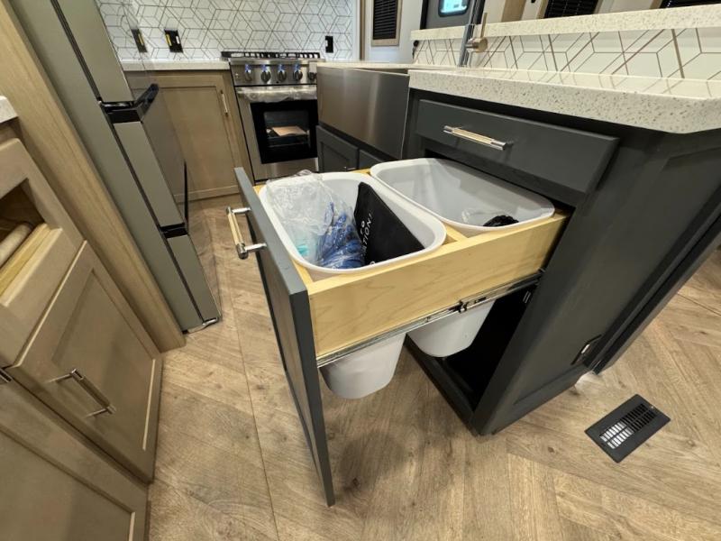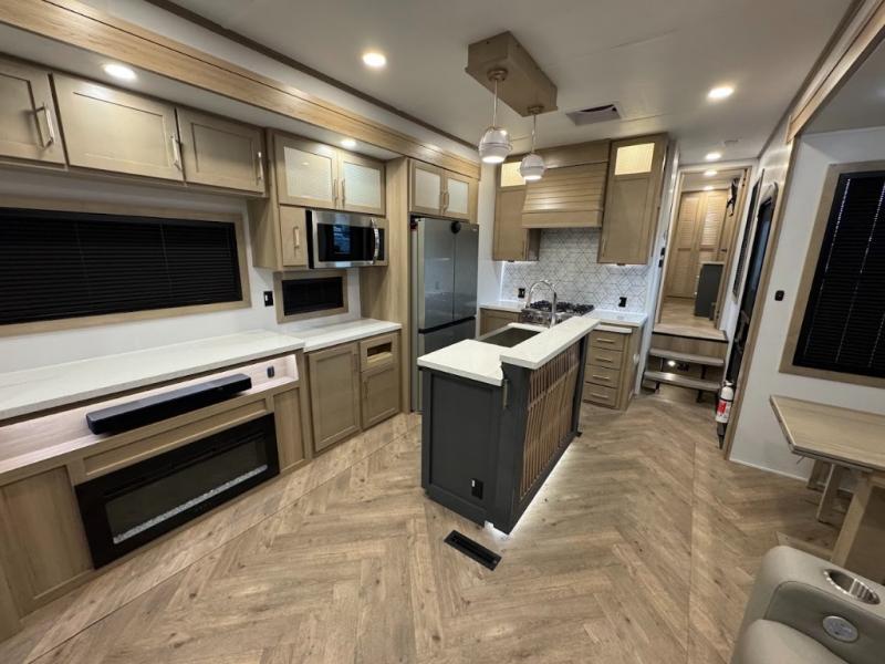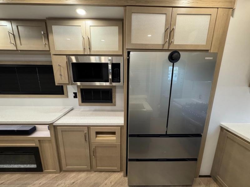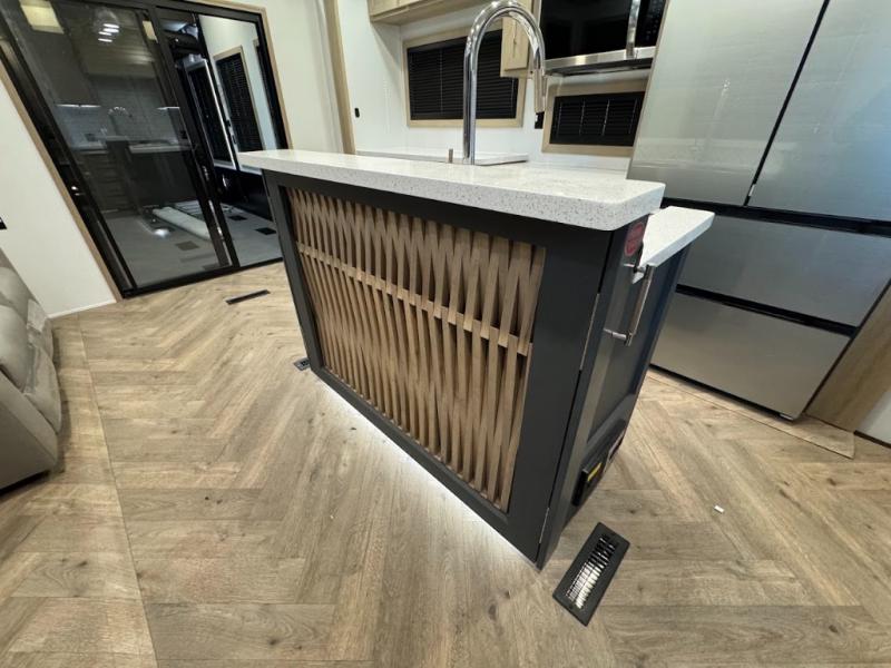 With a 15' garage area, you can bring your favorite off-road toys in this toy hauler! The exclusive ramp door with backup camera makes it easy to load them up and once you have arrived you can set up the dual opposing sofas, the electric bed above them, and the loft with a twin bed, plus there is even one of the dual entry doors to the unit. While the chef is preparing dinner on the Lasus 24" range and oven, three others can sit at the kitchen island with raised countertop and three folding bar stools or at the dinette table to play a game or simply socialize all together. When mother nature is raining on your parade, relax on the reclining theater seating with lumbar and tilting headrest, and enjoy the entertainment center with fireplace and 50" Smart LED TV. The front private bedroom will have you feeling right at home with a king bed slide, a large wardrobe with an area next to it prepped for a washer and dryer, a dresser with hidden storage, and a LED Smart TV. The full bathroom has a 42" x 30" shower with a seat to freshen up in each morning!