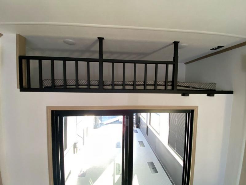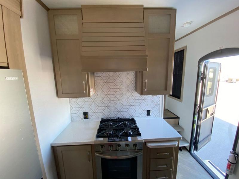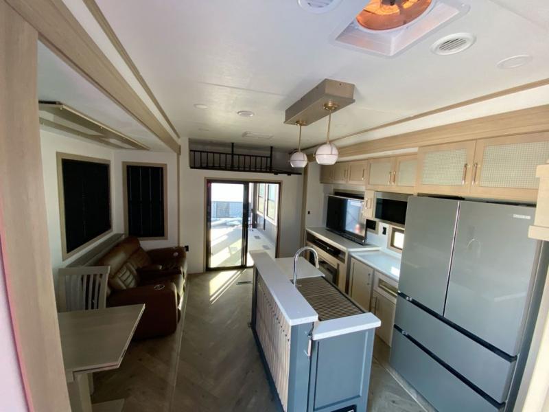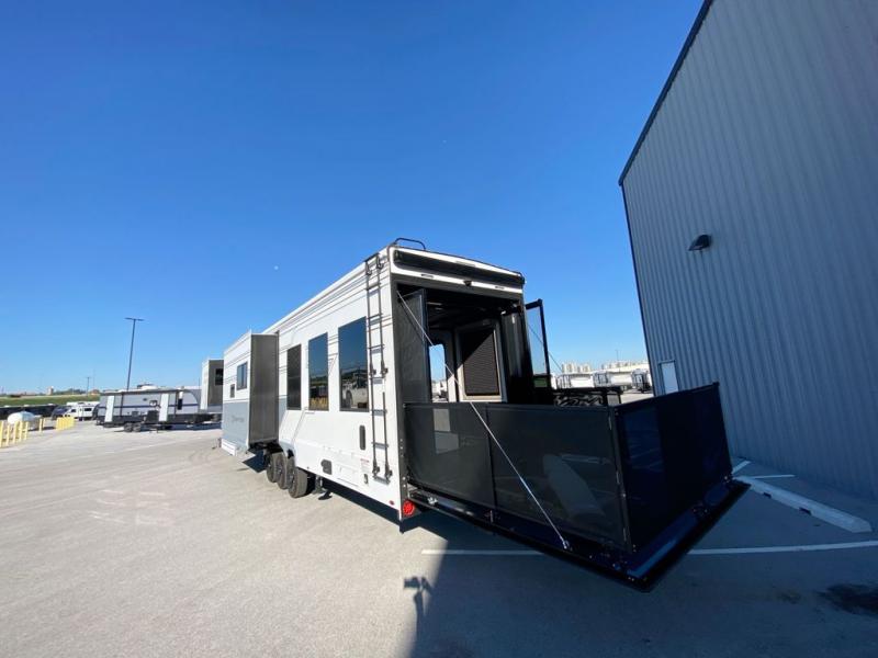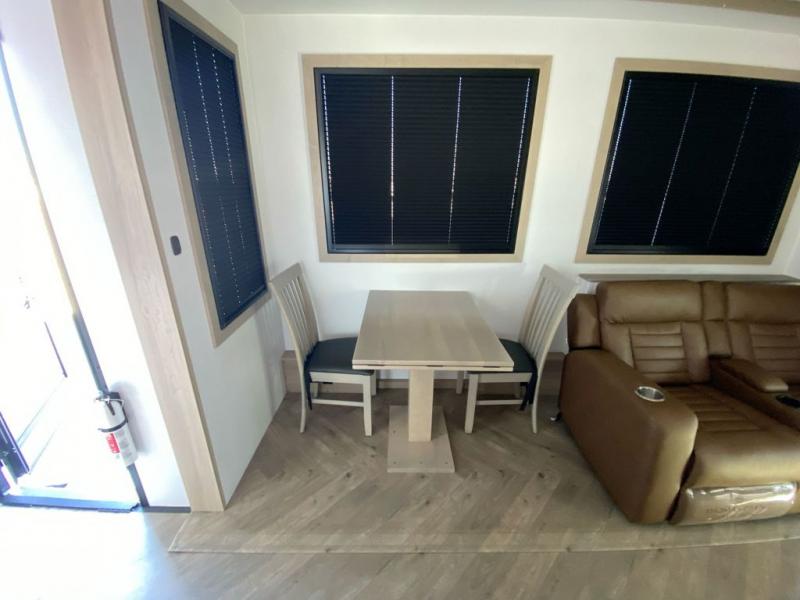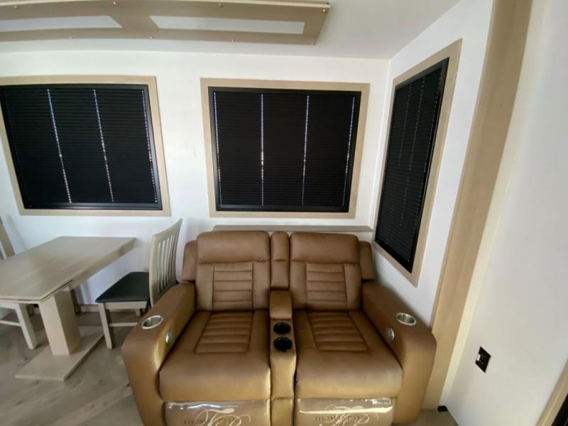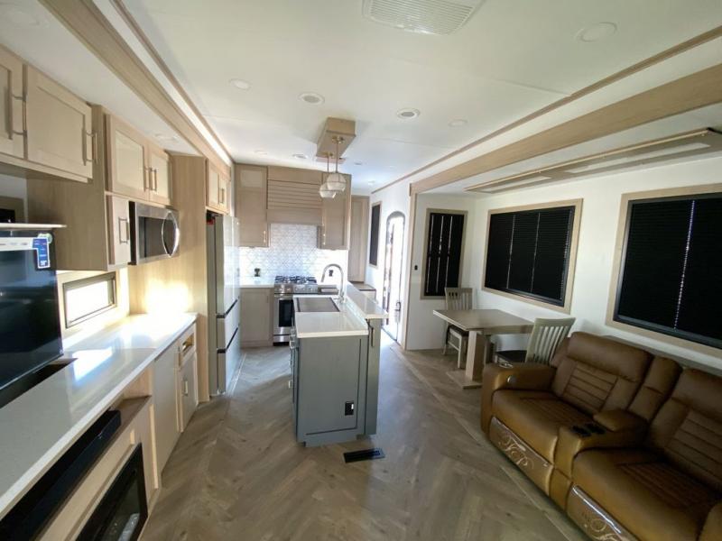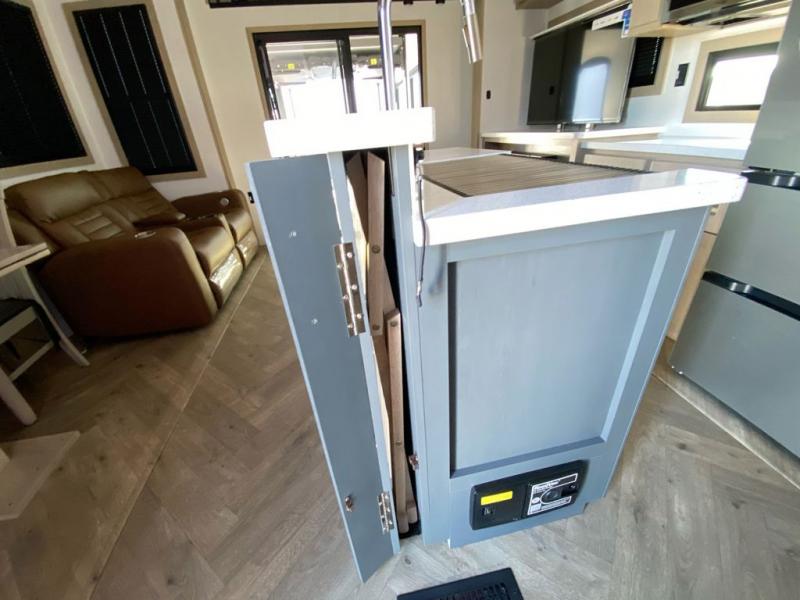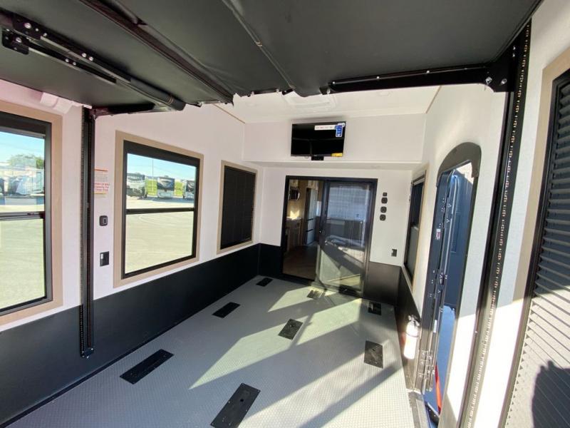 With a 15' garage area, you can bring your favorite off-road toys in this toy hauler! The exclusive ramp door with backup camera makes it easy to load them up and once you have arrived you can set up the dual opposing sofas, the electric bed above them, and the loft with a twin bed, plus there is even one of the dual entry doors to the unit. While the chef is preparing dinner on the Lasus 24" range and oven, three others can sit at the kitchen island with raised countertop and three folding bar stools or at the dinette table to play a game or simply socialize all together. When mother nature is raining on your parade, relax on the reclining theater seating with lumbar and tilting headrest, and enjoy the entertainment center with fireplace and 50" Smart LED TV. The front private bedroom will have you feeling right at home with a king bed slide, a large wardrobe with an area next to it prepped for a washer and dryer, a dresser with hidden storage, and a LED Smart TV. The full bathroom has a 42" x 30" shower with a seat to freshen up in each morning!