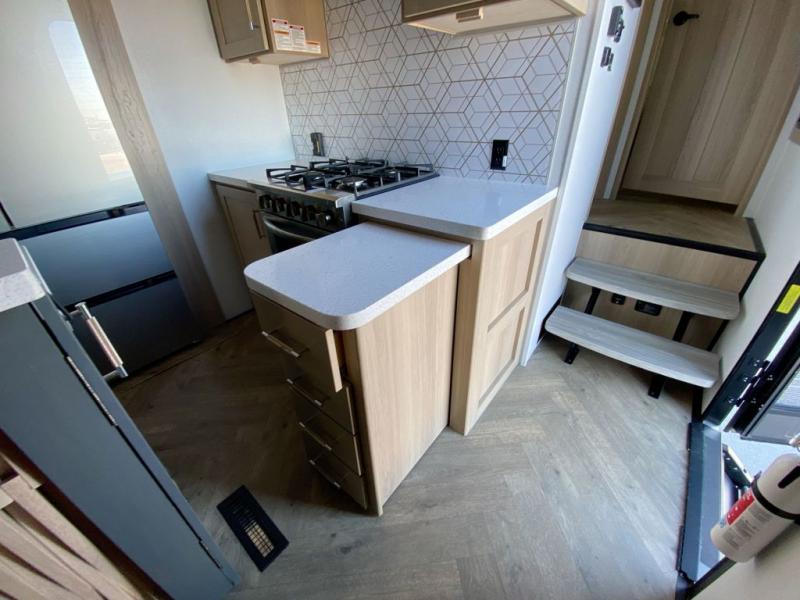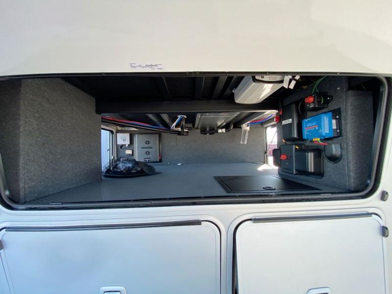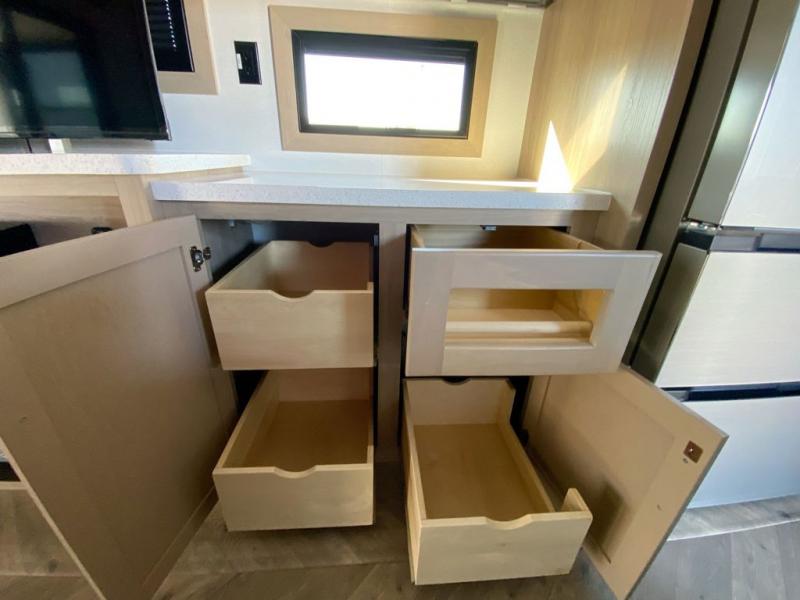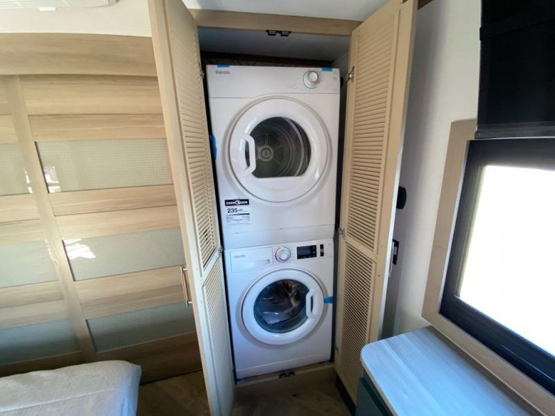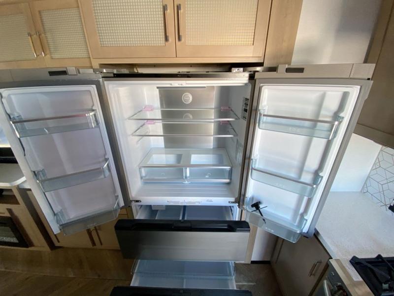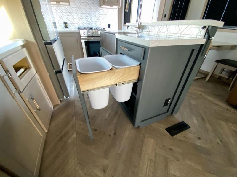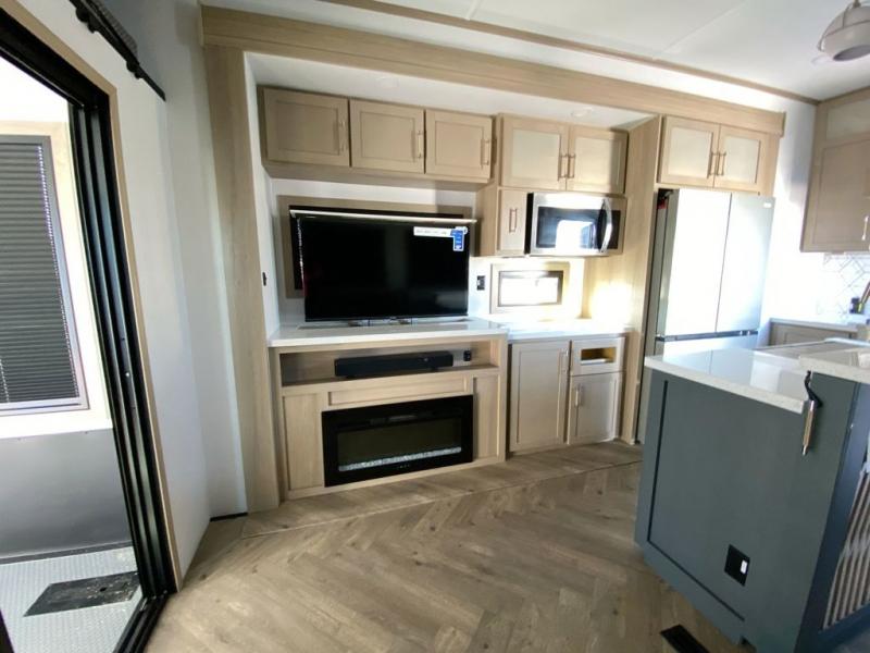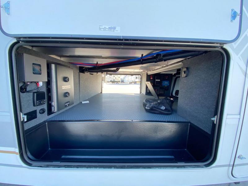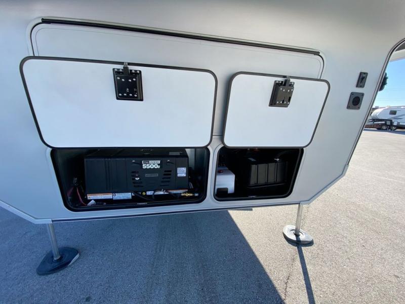 With a 15' garage area, you can bring your favorite off-road toys in this toy hauler! The exclusive ramp door with backup camera makes it easy to load them up and once you have arrived you can set up the dual opposing sofas, the electric bed above them, and the loft with a twin bed, plus there is even one of the dual entry doors to the unit. While the chef is preparing dinner on the Lasus 24" range and oven, three others can sit at the kitchen island with raised countertop and three folding bar stools or at the dinette table to play a game or simply socialize all together. When mother nature is raining on your parade, relax on the reclining theater seating with lumbar and tilting headrest, and enjoy the entertainment center with fireplace and 50" Smart LED TV. The front private bedroom will have you feeling right at home with a king bed slide, a large wardrobe with an area next to it prepped for a washer and dryer, a dresser with hidden storage, and a LED Smart TV. The full bathroom has a 42" x 30" shower with a seat to freshen up in each morning!