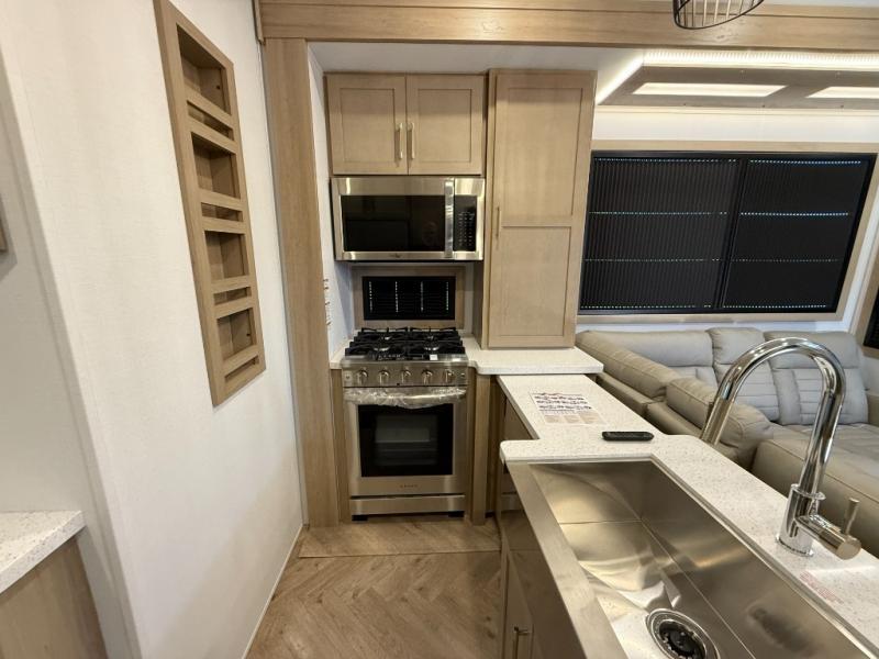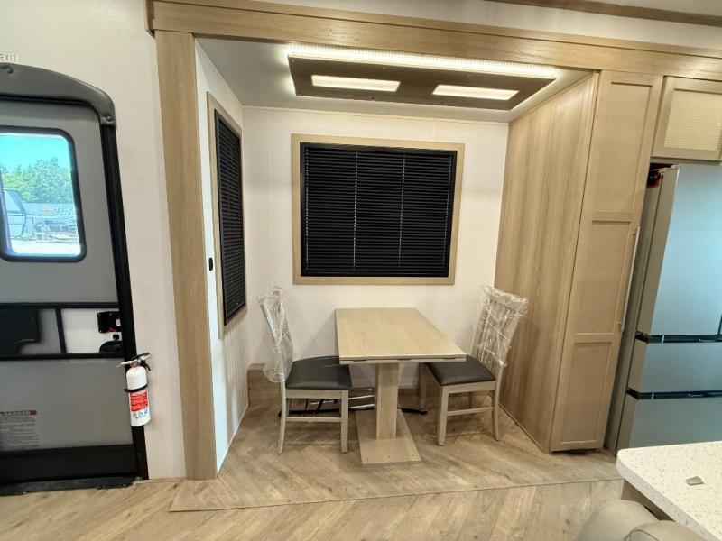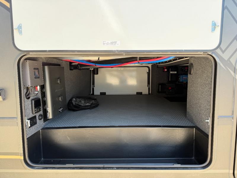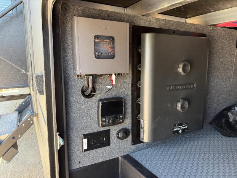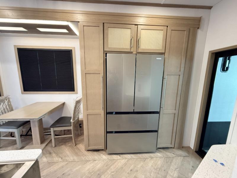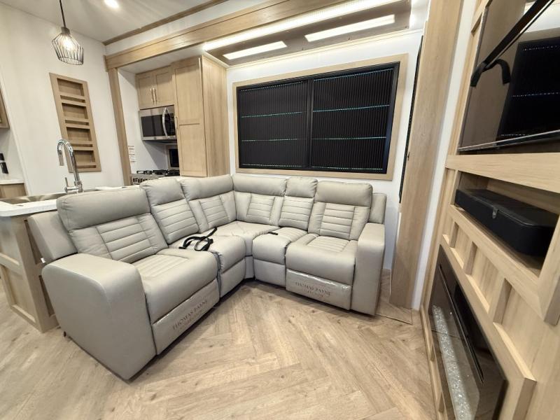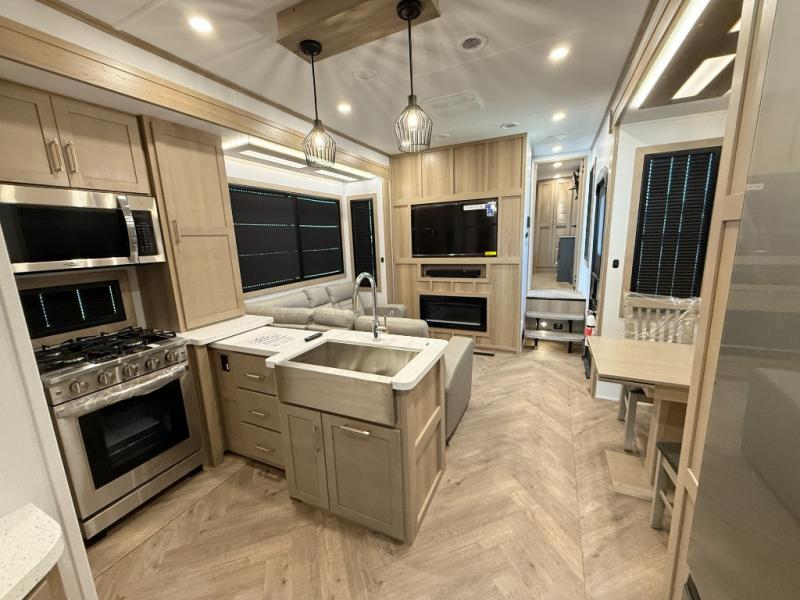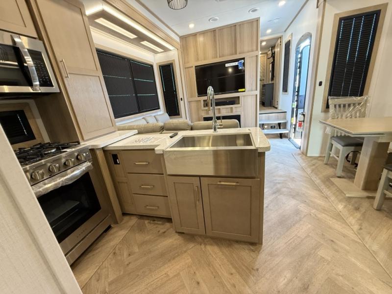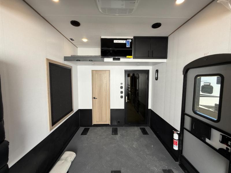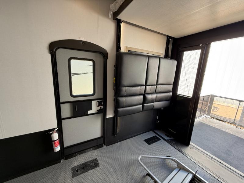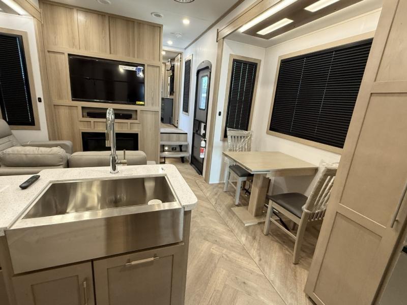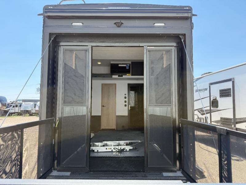 There's room for everyone in this toy hauler! The front private bedroom has a king bed slide for more interior space, a Smart LED TV, a front large wardrobe, plus washer and dryer prep. With two full bathrooms, it will be easy for everyone to get the mud rinsed out of their hair after a fun time on the trails. Start each morning off with a belly full of eggs cooked on the four-burner range and cinnamon rolls baked in the 24" stainless steel oven. Grab a cold cup of orange juice from the 20-cu. ft. 12-volt refrigerator and enjoy it along with the eggs at the dinette table or in the 13' 6" garage on one of the dual opposing sofas with table in between. The L-shaped sofa is conveniently across from the entertainment center with a 50" Smart LED TV and fireplace. As you head into the 13' 6" garage area, you will notice a loft with twin bed, an electric bed above the opposing sofas, Adjust-A-Track frame welded tie-downs, a full bathroom, and one of the dual entry doors to the unit!