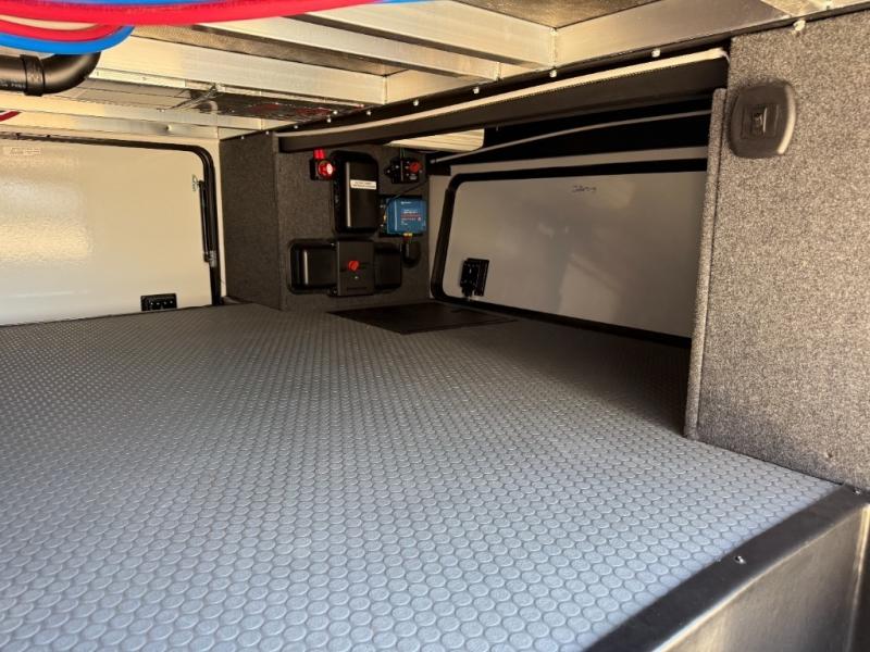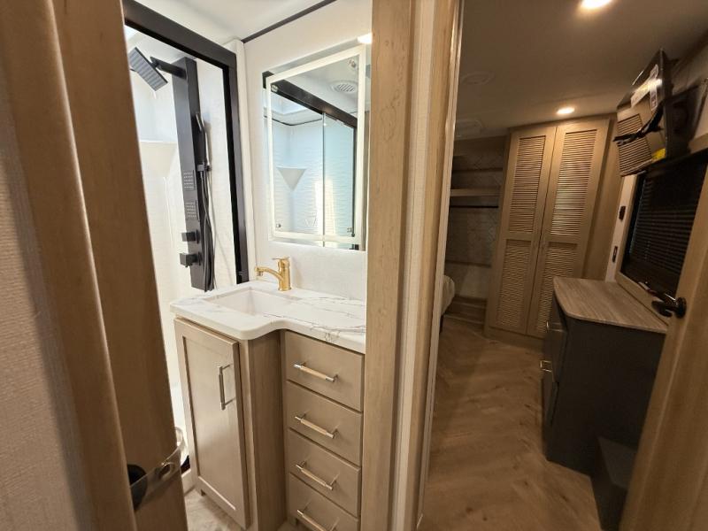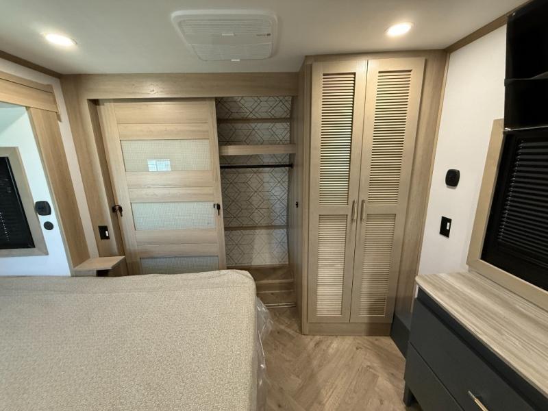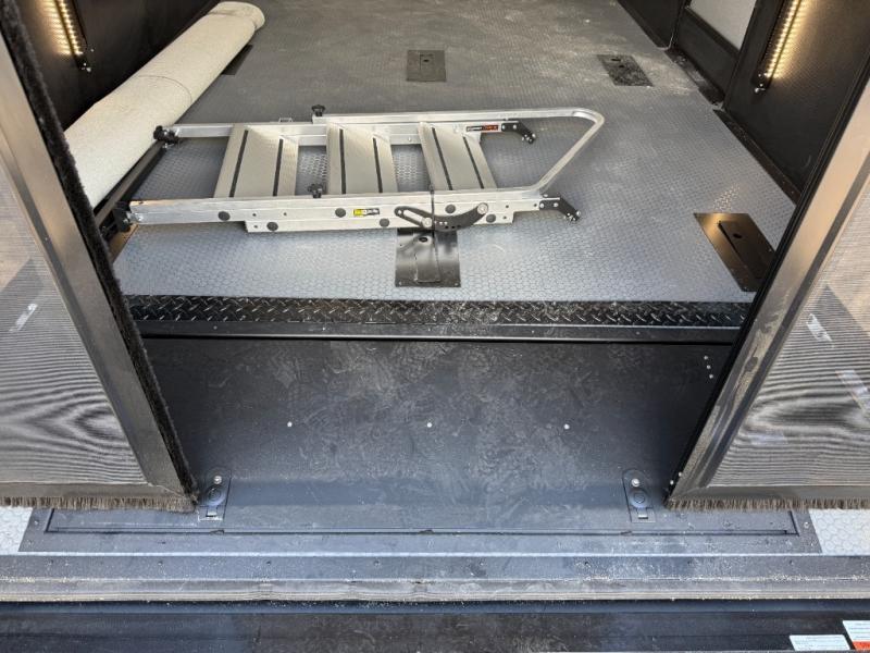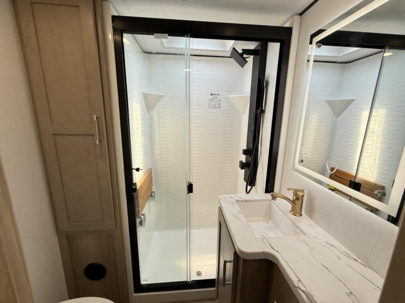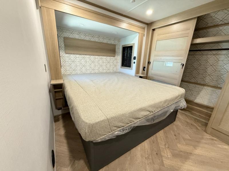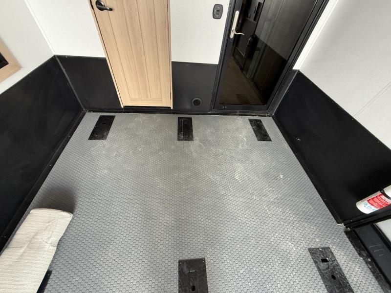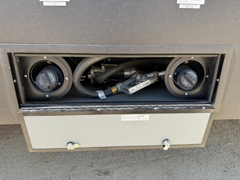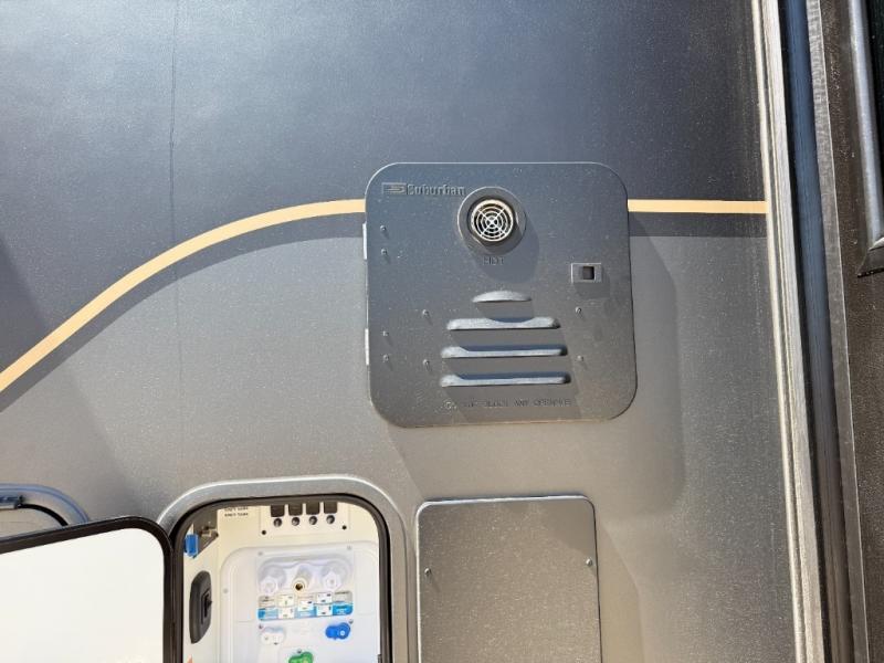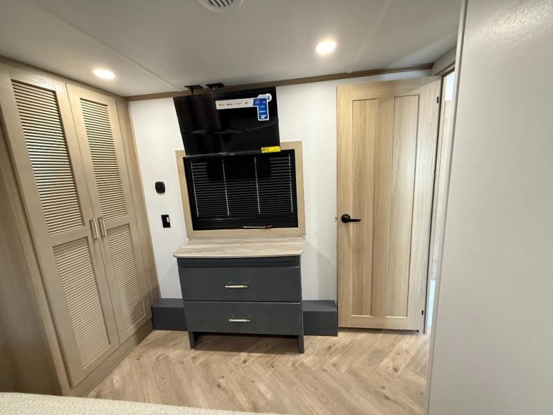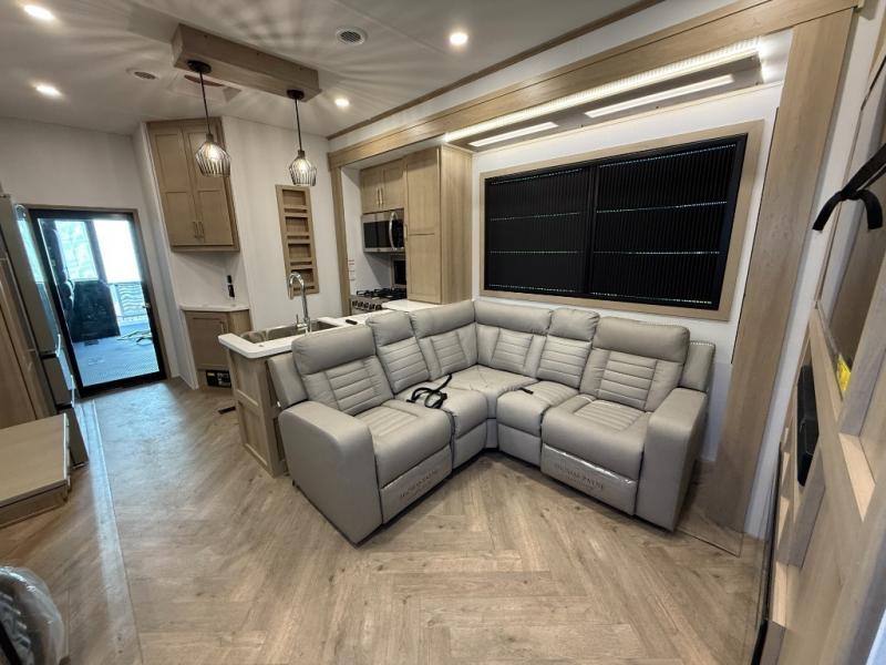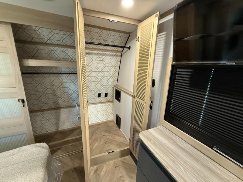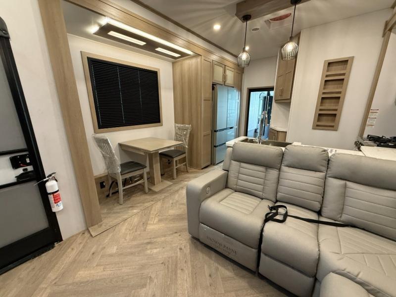 There's room for everyone in this toy hauler! The front private bedroom has a king bed slide for more interior space, a Smart LED TV, a front large wardrobe, plus washer and dryer prep. With two full bathrooms, it will be easy for everyone to get the mud rinsed out of their hair after a fun time on the trails. Start each morning off with a belly full of eggs cooked on the four-burner range and cinnamon rolls baked in the 24" stainless steel oven. Grab a cold cup of orange juice from the 20-cu. ft. 12-volt refrigerator and enjoy it along with the eggs at the dinette table or in the 13' 6" garage on one of the dual opposing sofas with table in between. The L-shaped sofa is conveniently across from the entertainment center with a 50" Smart LED TV and fireplace. As you head into the 13' 6" garage area, you will notice a loft with twin bed, an electric bed above the opposing sofas, Adjust-A-Track frame welded tie-downs, a full bathroom, and one of the dual entry doors to the unit!