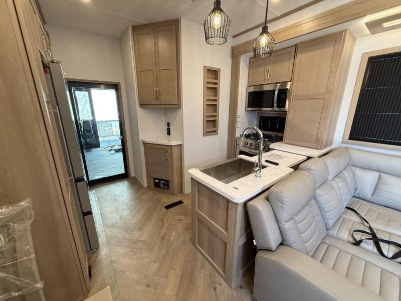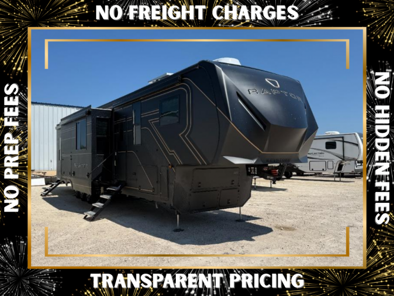 Experience a breath of fresh air with one of these Keystone RV Raptor fifth wheel toy haulers! Their rugged construction consists of a one-piece Alpha Super Flex TPO roof membrane, Dyna Span floor decking, and 5,000 lb. frame-welded tie- downs to keep your toys in place as you travel. Some unexpected conveniences you will appreciate include an Omni-Chill A/C system to keep you cool on those hot summer days, a Furrion backup camera, MaxTurn™ technology with a Helux™ pin box, and a Generation 3 iN-Command smart automation system with Global Connect to make life easier. There is also designer style vinyl flooring throughout, along with new ceiling treatment with LED accent lighting, beach wood and white cabinetry, and many more interior comforts!