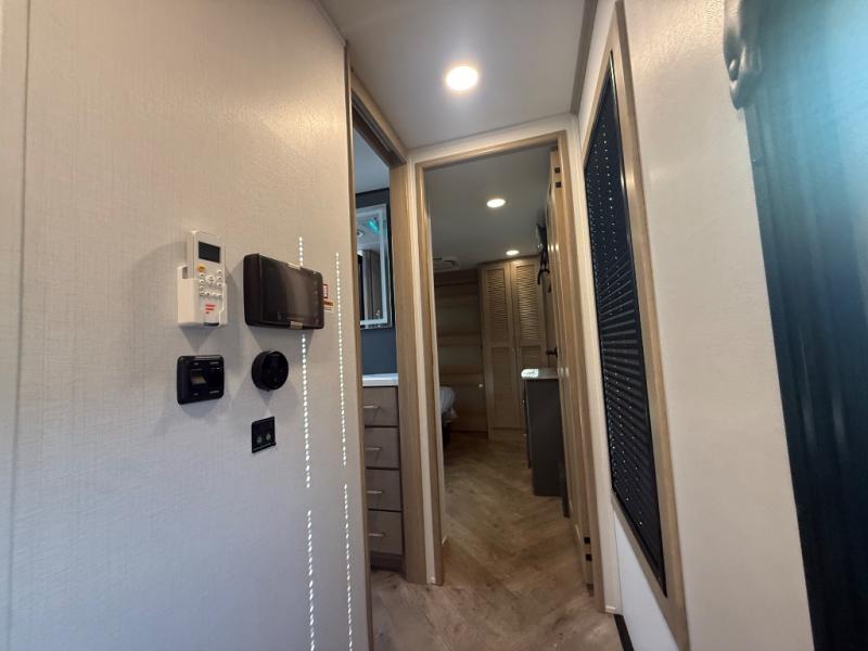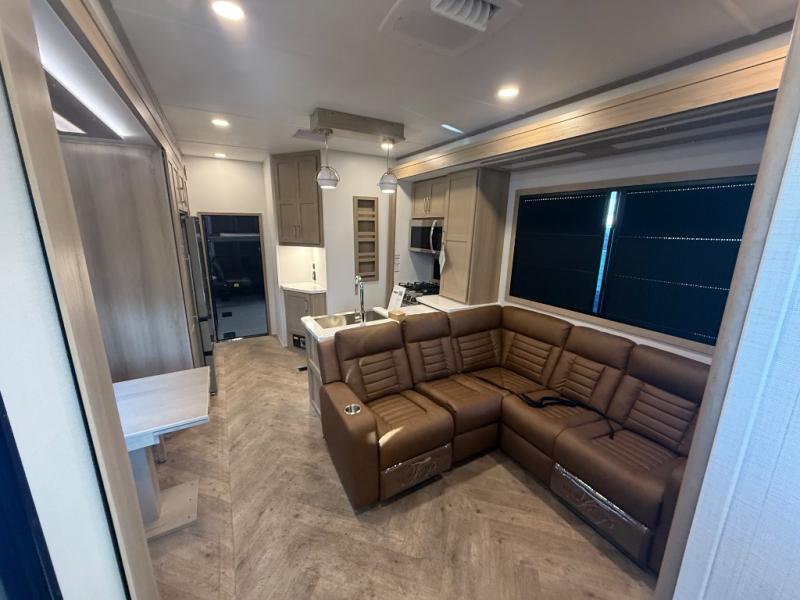Experience a breath of fresh air with one of these Keystone RV Raptor fifth wheel toy haulers! Their rugged construction consists of a one-piece Alpha Super Flex TPO roof membrane, Dyna Span floor decking, and 5,000 lb. frame-welded tie- downs to keep your toys in place as you travel. Some unexpected conveniences you will appreciate include an Omni-Chill A/C system to keep you cool on those hot summer days, a Furrion backup camera, MaxTurn™ technology with a Helux™ pin box, and a Generation 3 iN-Command smart automation system with Global Connect to make life easier. There is also designer style vinyl flooring throughout, along with new ceiling treatment with LED accent lighting, beach wood and white cabinetry, and many more interior comforts!