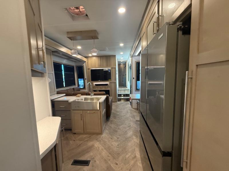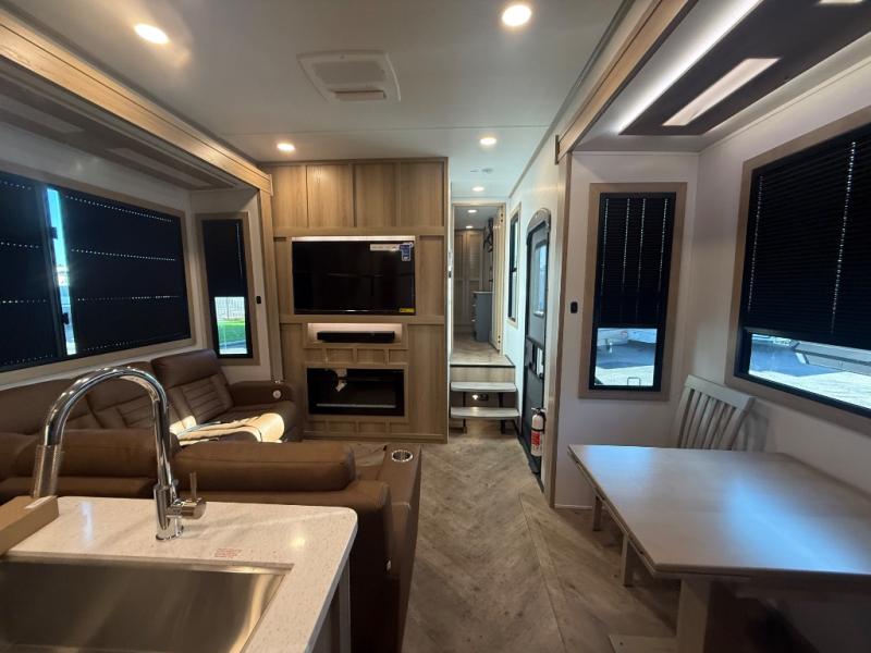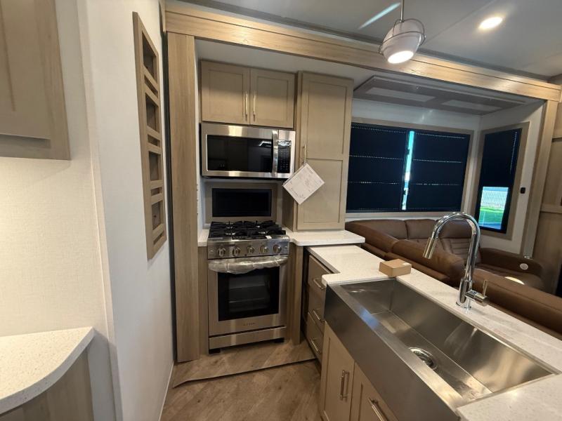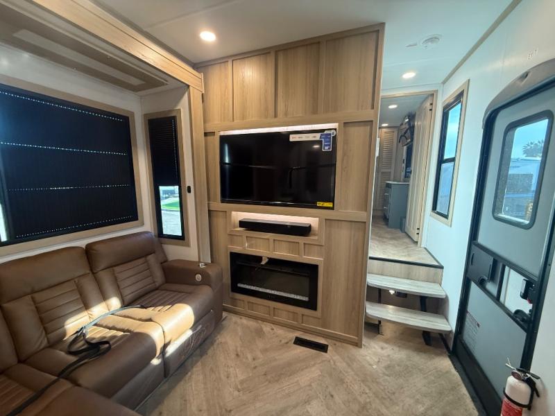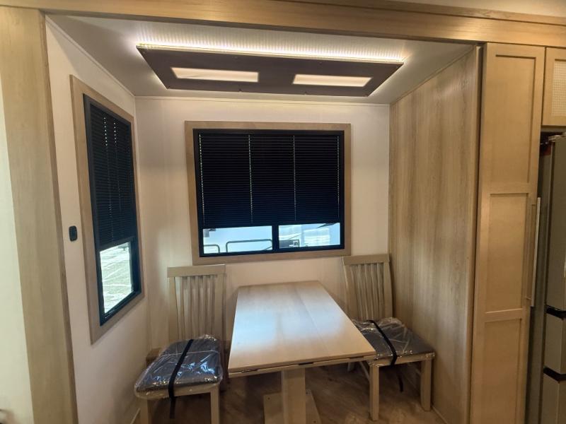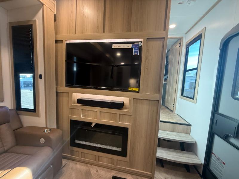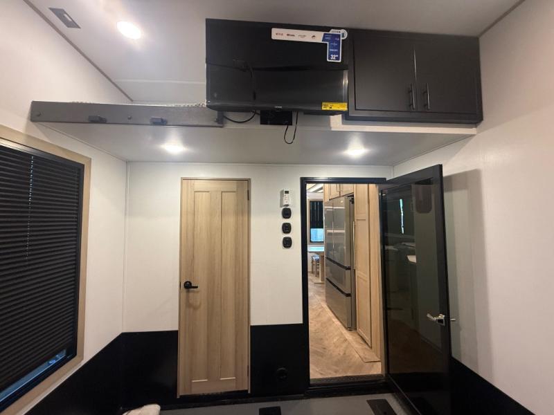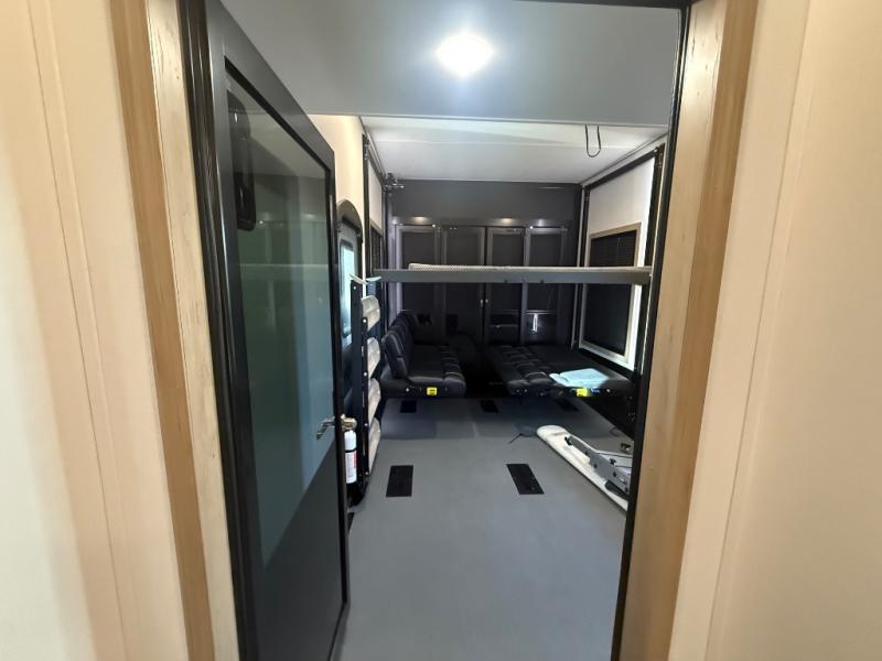 There's room for everyone in this toy hauler! The front private bedroom has a king bed slide for more interior space, a Smart LED TV, a front large wardrobe, plus washer and dryer prep. With two full bathrooms, it will be easy for everyone to get the mud rinsed out of their hair after a fun time on the trails. Start each morning off with a belly full of eggs cooked on the four-burner range and cinnamon rolls baked in the 24" stainless steel oven. Grab a cold cup of orange juice from the 20-cu. ft. 12-volt refrigerator and enjoy it along with the eggs at the dinette table or in the 13' 6" garage on one of the dual opposing sofas with table in between. The L-shaped sofa is conveniently across from the entertainment center with a 50" Smart LED TV and fireplace. As you head into the 13' 6" garage area, you will notice a loft with twin bed, an electric bed above the opposing sofas, Adjust-A-Track frame welded tie-downs, a full bathroom, and one of the dual entry doors to the unit!