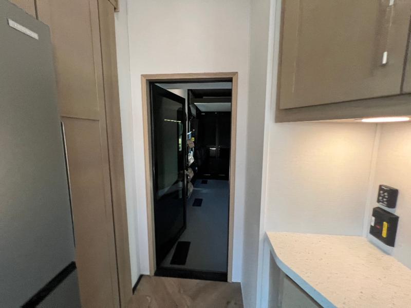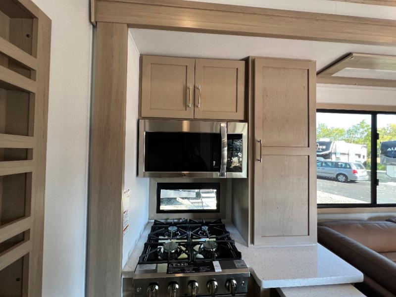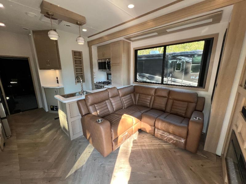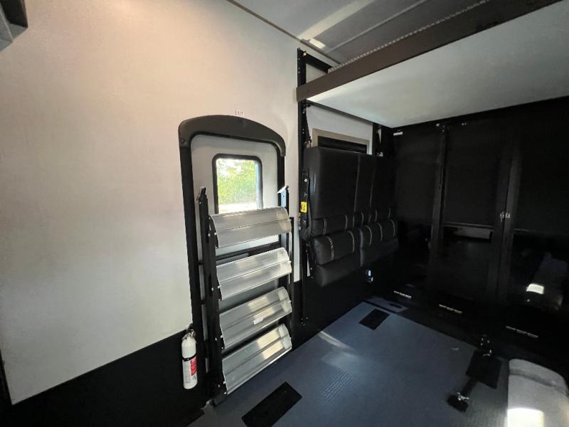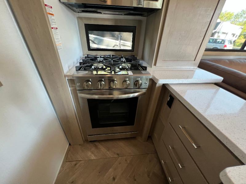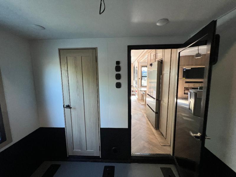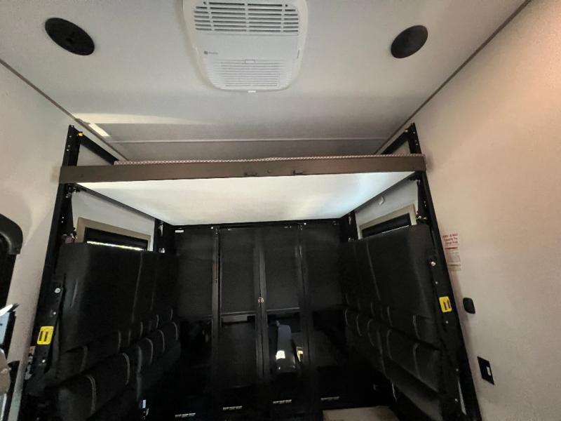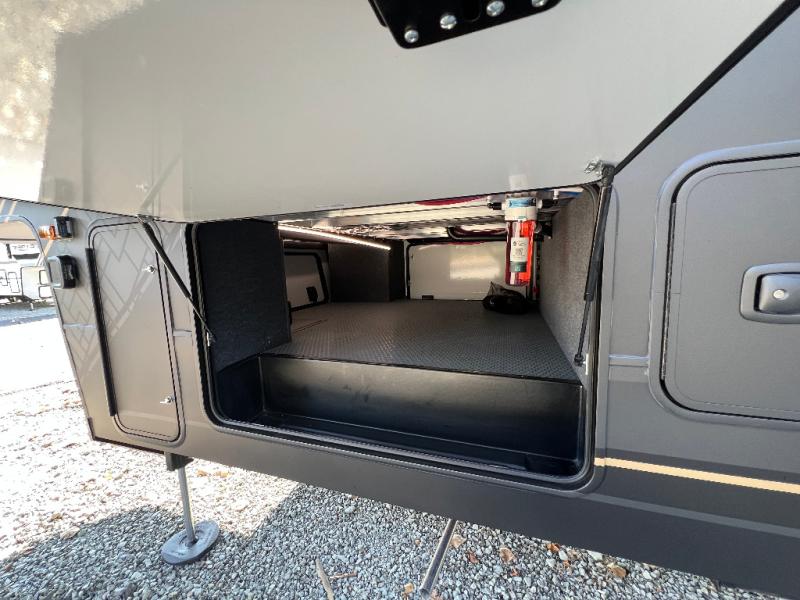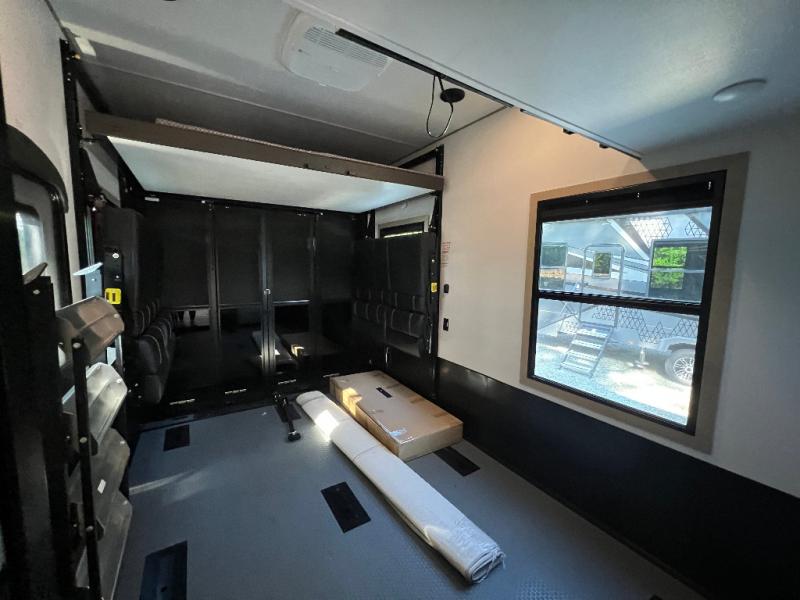 There's room for everyone in this toy hauler! The front private bedroom has a king bed slide for more interior space, a Smart LED TV, a front large wardrobe, plus washer and dryer prep. With two full bathrooms, it will be easy for everyone to get the mud rinsed out of their hair after a fun time on the trails. Start each morning off with a belly full of eggs cooked on the four-burner range and cinnamon rolls baked in the 24" stainless steel oven. Grab a cold cup of orange juice from the 20-cu. ft. 12-volt refrigerator and enjoy it along with the eggs at the dinette table or in the 13' 6" garage on one of the dual opposing sofas with table in between. The L-shaped sofa is conveniently across from the entertainment center with a 50" Smart LED TV and fireplace. As you head into the 13' 6" garage area, you will notice a loft with twin bed, an electric bed above the opposing sofas, Adjust-A-Track frame welded tie-downs, a full bathroom, and one of the dual entry doors to the unit!
