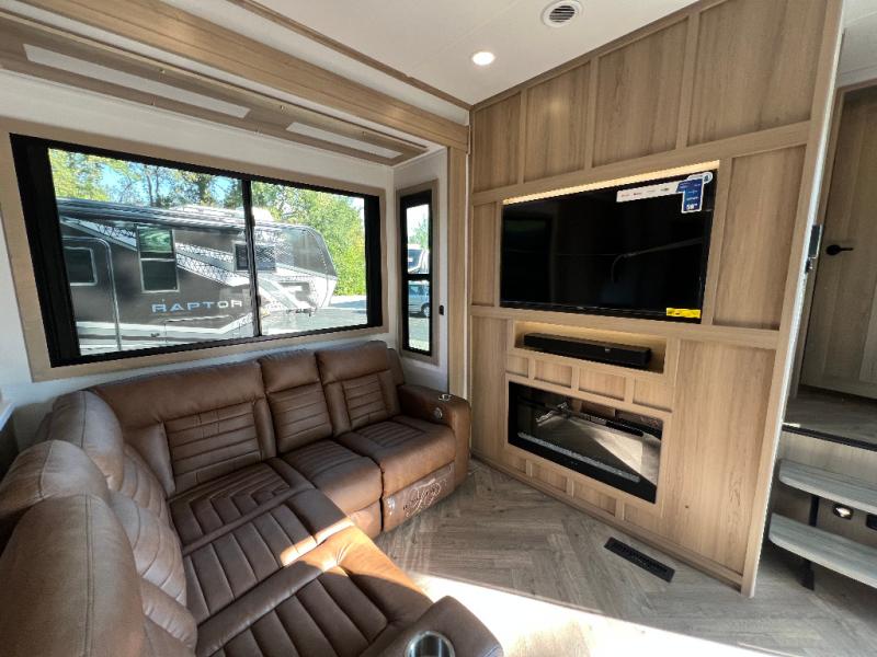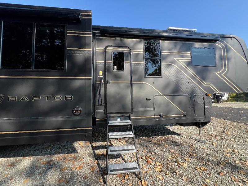 Experience a breath of fresh air with one of these Keystone RV Raptor fifth wheel toy haulers! Their rugged construction consists of a one-piece Alpha Super Flex TPO roof membrane, Dyna Span floor decking, and 5,000 lb. frame-welded tie- downs to keep your toys in place as you travel. Some unexpected conveniences you will appreciate include an Omni-Chill A/C system to keep you cool on those hot summer days, a Furrion backup camera, MaxTurn™ technology with a Helux™ pin box, and a Generation 3 iN-Command smart automation system with Global Connect to make life easier. There is also designer style vinyl flooring throughout, along with new ceiling treatment with LED accent lighting, beach wood and white cabinetry, and many more interior comforts!