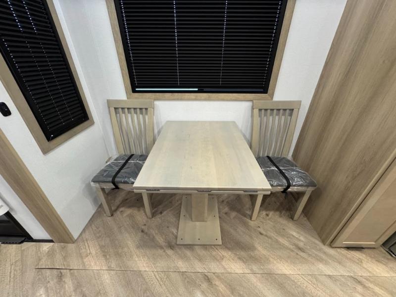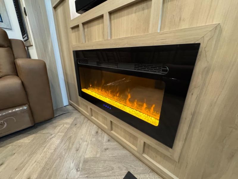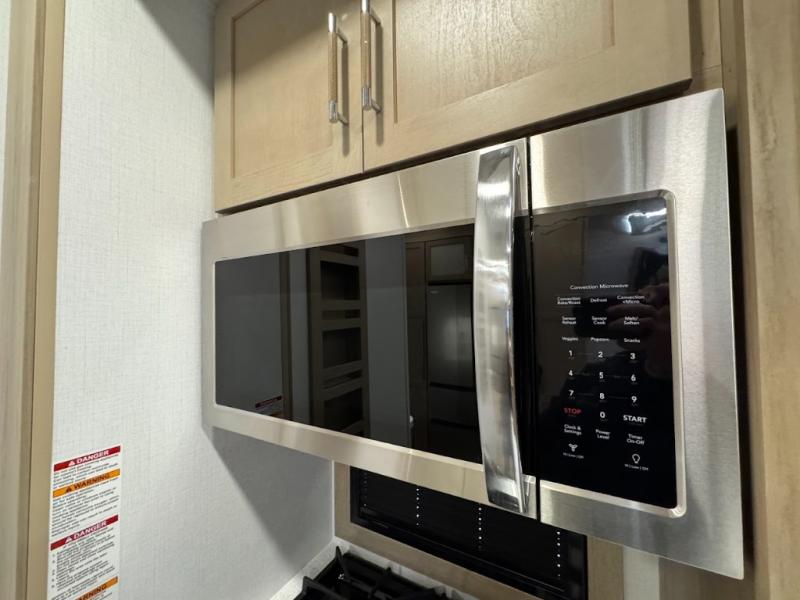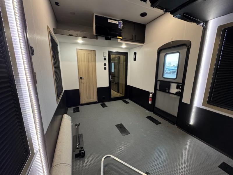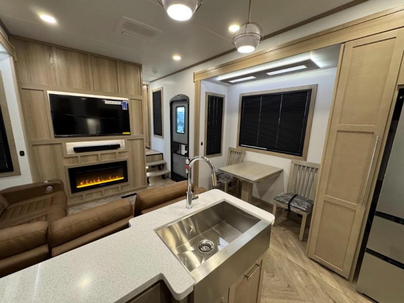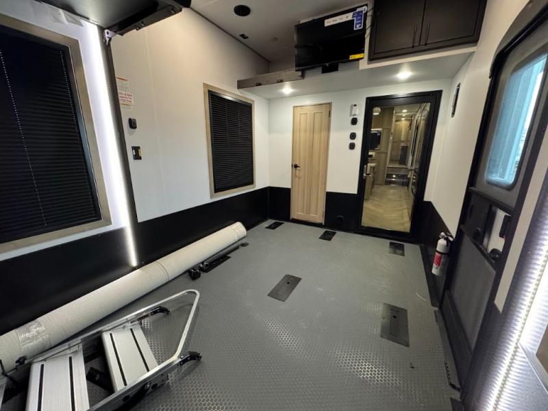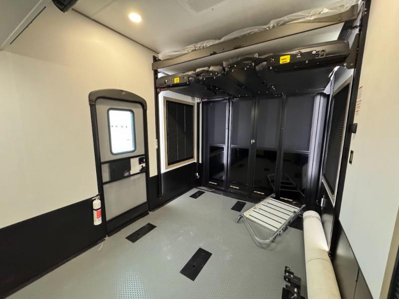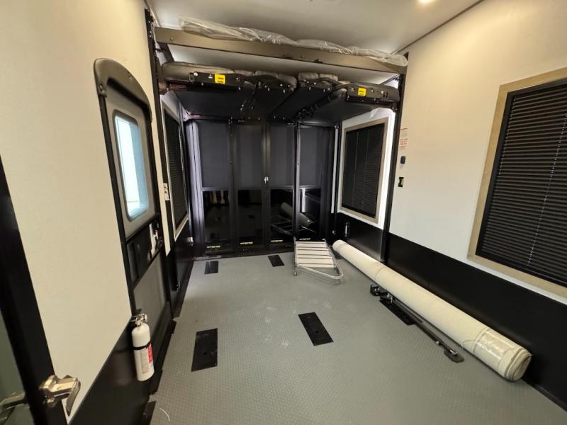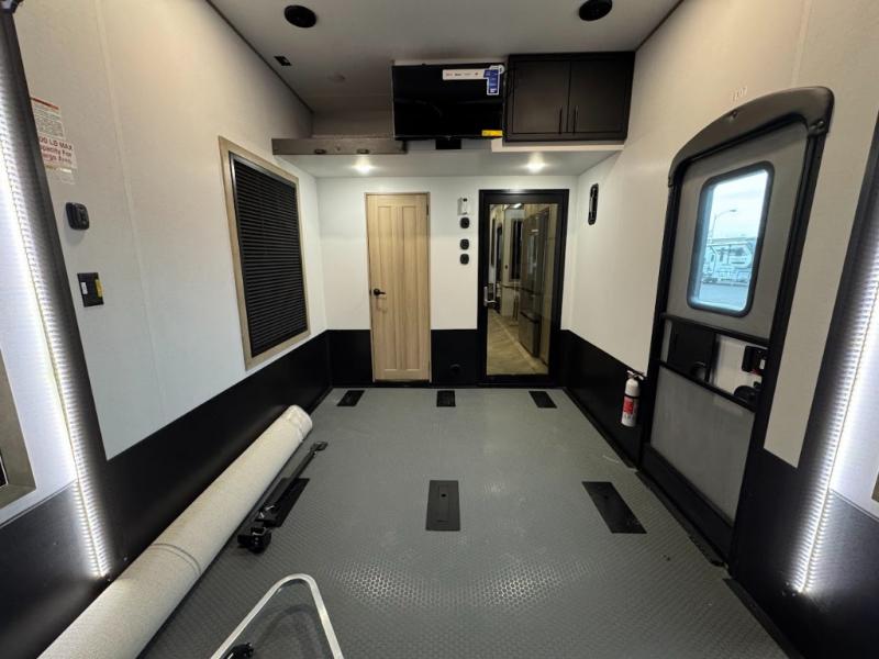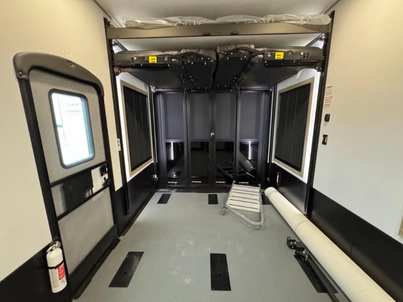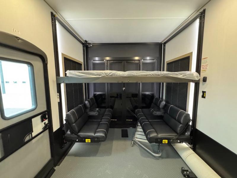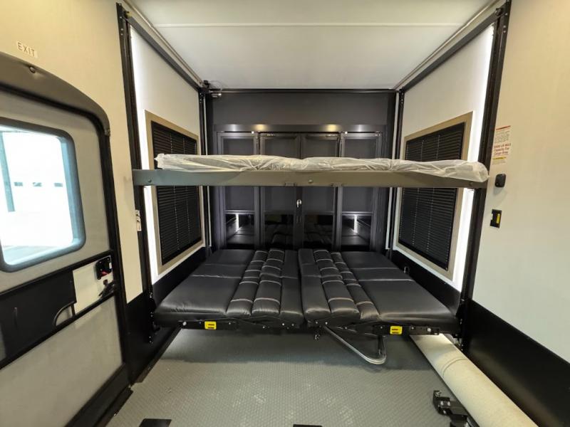 There's room for everyone in this toy hauler! The front private bedroom has a king bed slide for more interior space, a Smart LED TV, a front large wardrobe, plus washer and dryer prep. With two full bathrooms, it will be easy for everyone to get the mud rinsed out of their hair after a fun time on the trails. Start each morning off with a belly full of eggs cooked on the four-burner range and cinnamon rolls baked in the 24" stainless steel oven. Grab a cold cup of orange juice from the 20-cu. ft. 12-volt refrigerator and enjoy it along with the eggs at the dinette table or in the 13' 6" garage on one of the dual opposing sofas with table in between. The L-shaped sofa is conveniently across from the entertainment center with a 50" Smart LED TV and fireplace. As you head into the 13' 6" garage area, you will notice a loft with twin bed, an electric bed above the opposing sofas, Adjust-A-Track frame welded tie-downs, a full bathroom, and one of the dual entry doors to the unit!
