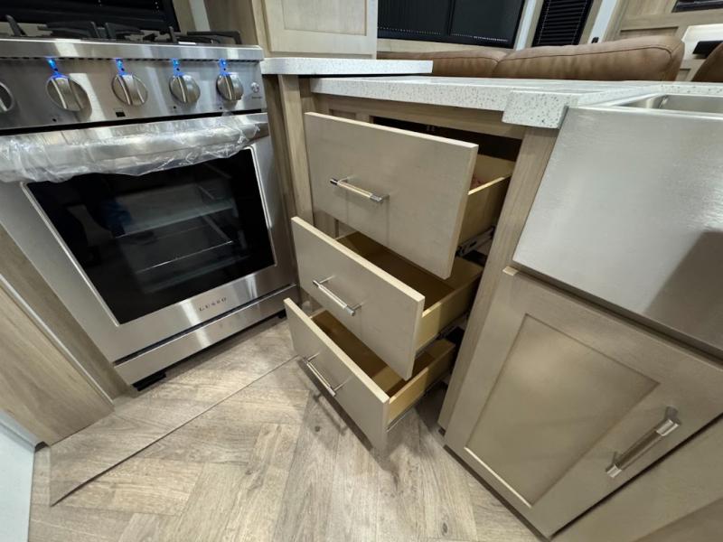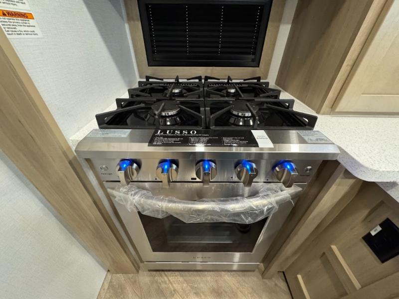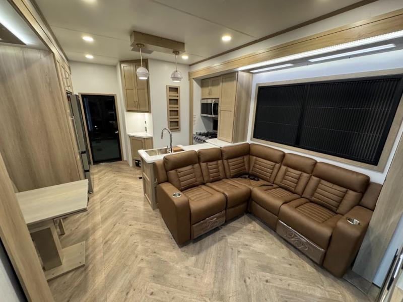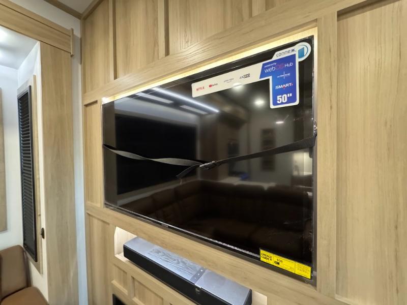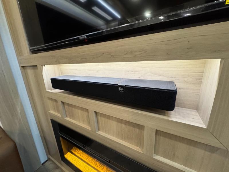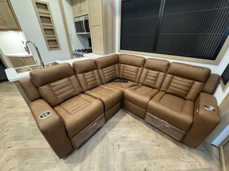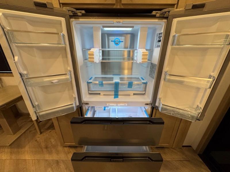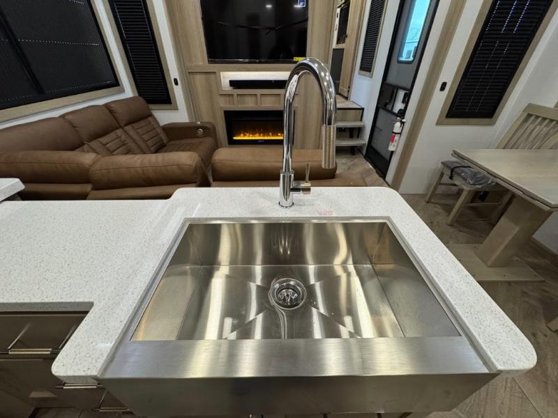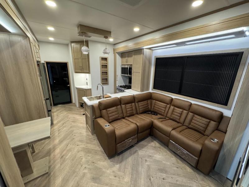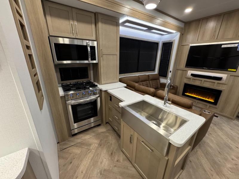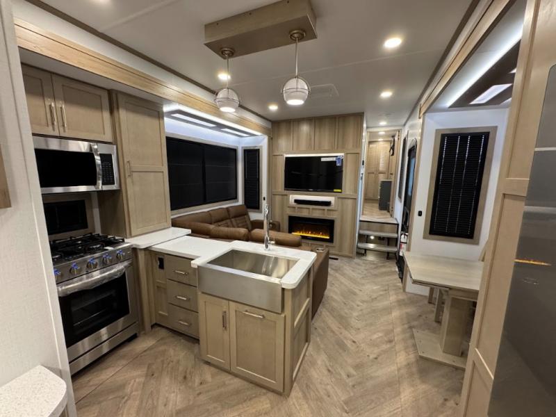 There's room for everyone in this toy hauler! The front private bedroom has a king bed slide for more interior space, a Smart LED TV, a front large wardrobe, plus washer and dryer prep. With two full bathrooms, it will be easy for everyone to get the mud rinsed out of their hair after a fun time on the trails. Start each morning off with a belly full of eggs cooked on the four-burner range and cinnamon rolls baked in the 24" stainless steel oven. Grab a cold cup of orange juice from the 20-cu. ft. 12-volt refrigerator and enjoy it along with the eggs at the dinette table or in the 13' 6" garage on one of the dual opposing sofas with table in between. The L-shaped sofa is conveniently across from the entertainment center with a 50" Smart LED TV and fireplace. As you head into the 13' 6" garage area, you will notice a loft with twin bed, an electric bed above the opposing sofas, Adjust-A-Track frame welded tie-downs, a full bathroom, and one of the dual entry doors to the unit!