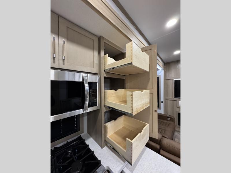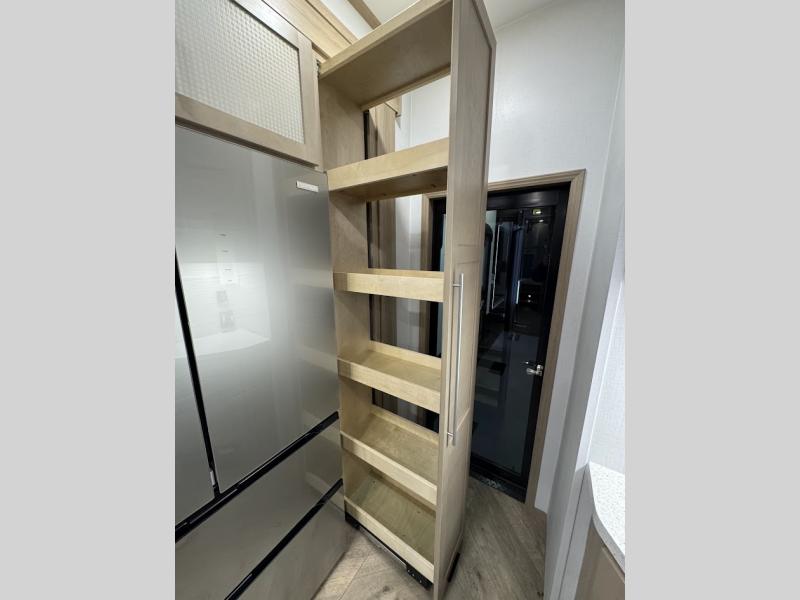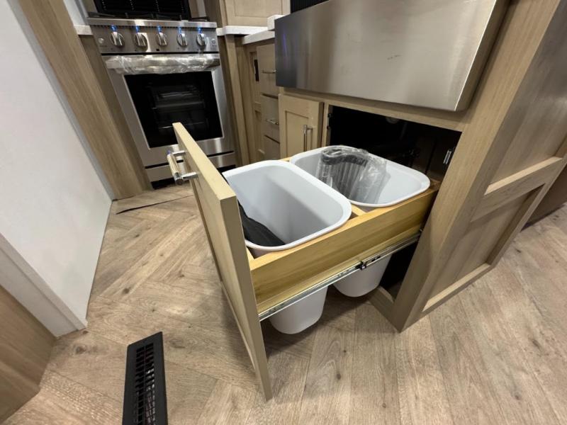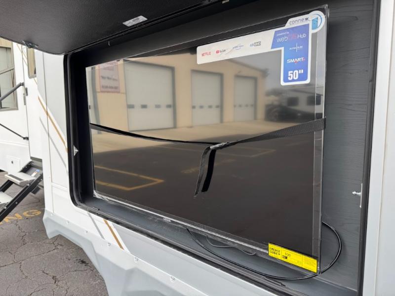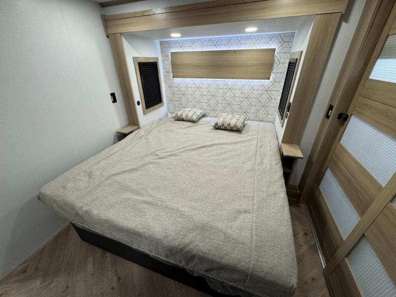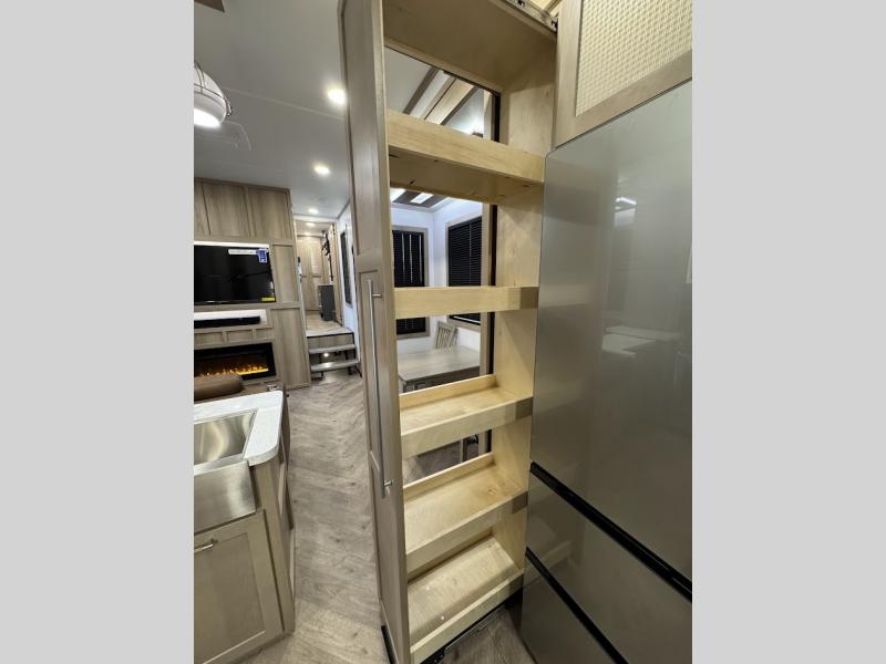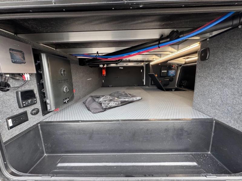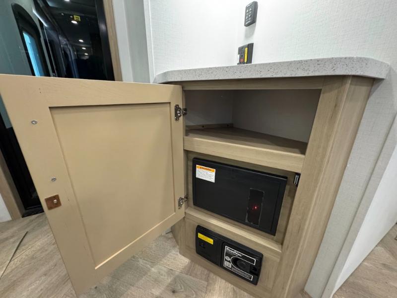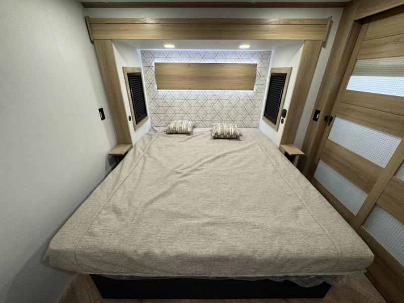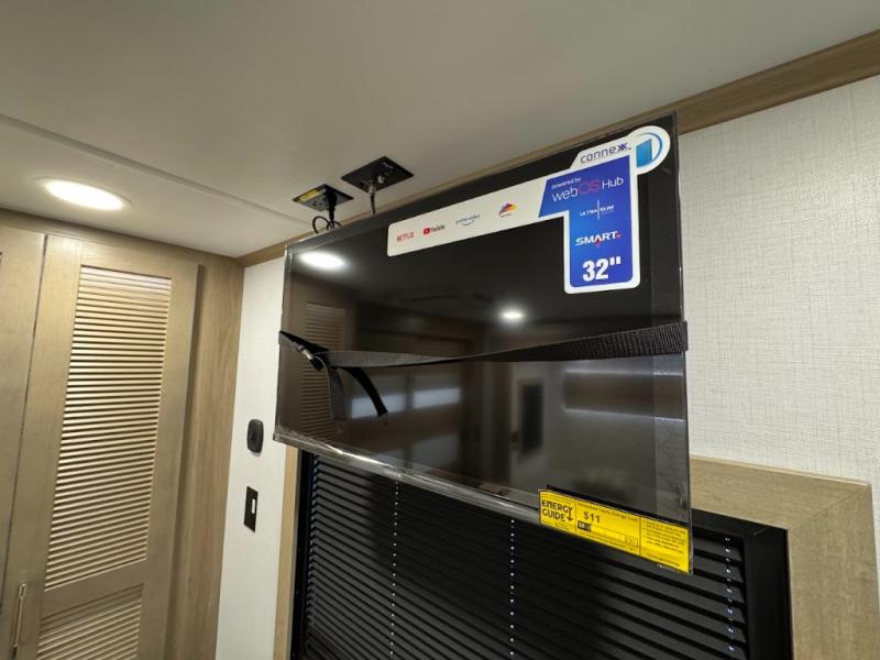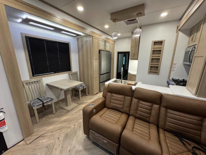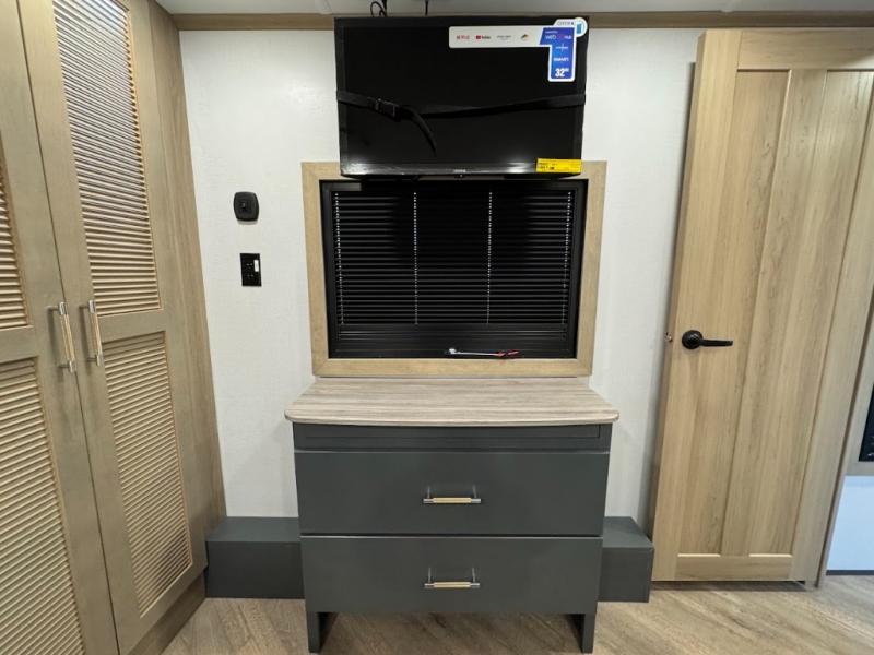 There's room for everyone in this toy hauler! The front private bedroom has a king bed slide for more interior space, a Smart LED TV, a front large wardrobe, plus washer and dryer prep. With two full bathrooms, it will be easy for everyone to get the mud rinsed out of their hair after a fun time on the trails. Start each morning off with a belly full of eggs cooked on the four-burner range and cinnamon rolls baked in the 24" stainless steel oven. Grab a cold cup of orange juice from the 20-cu. ft. 12-volt refrigerator and enjoy it along with the eggs at the dinette table or in the 13' 6" garage on one of the dual opposing sofas with table in between. The L-shaped sofa is conveniently across from the entertainment center with a 50" Smart LED TV and fireplace. As you head into the 13' 6" garage area, you will notice a loft with twin bed, an electric bed above the opposing sofas, Adjust-A-Track frame welded tie-downs, a full bathroom, and one of the dual entry doors to the unit!