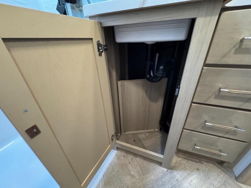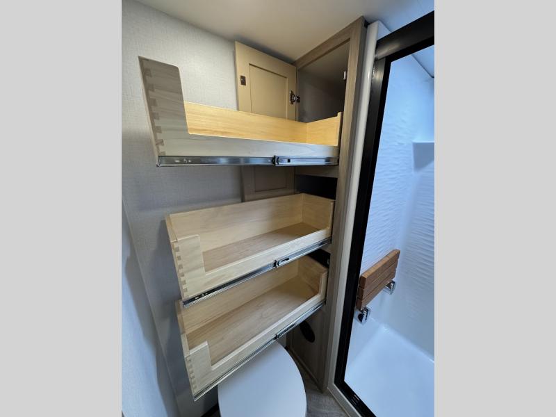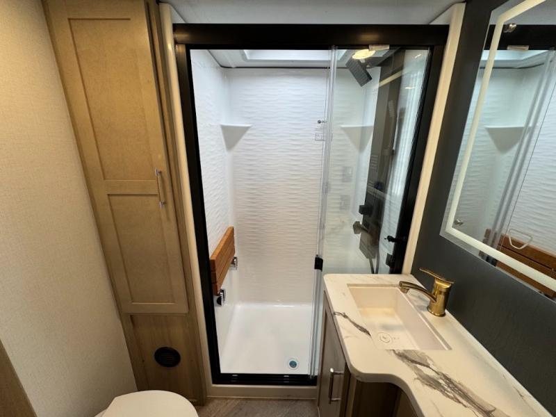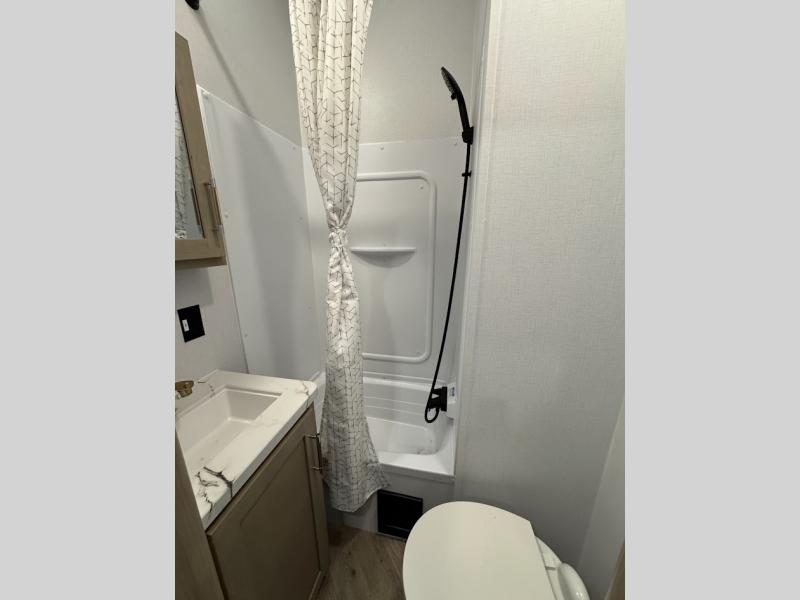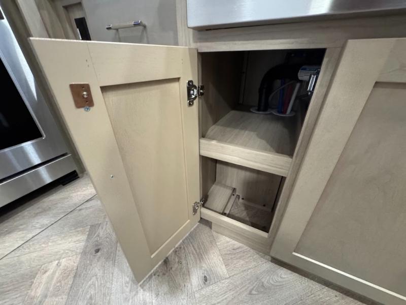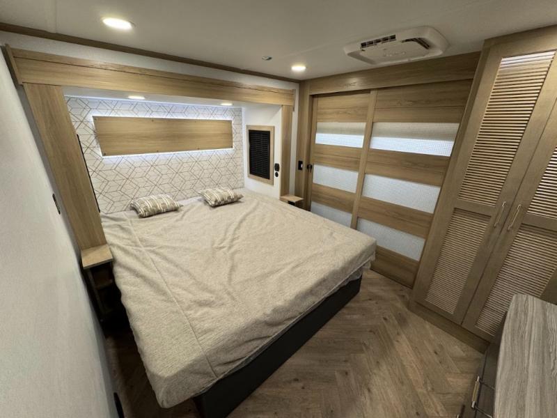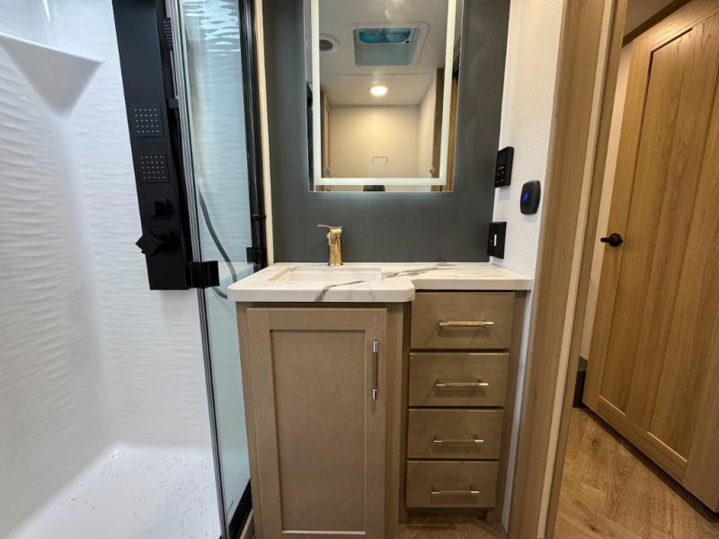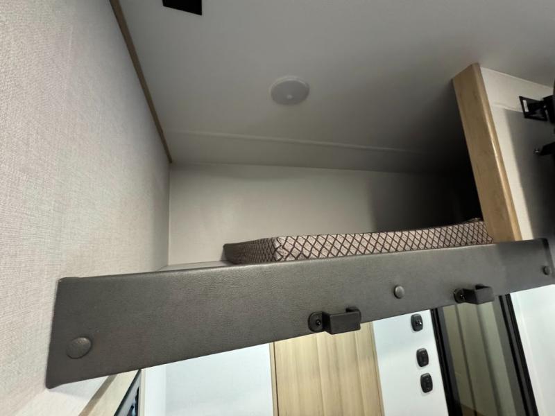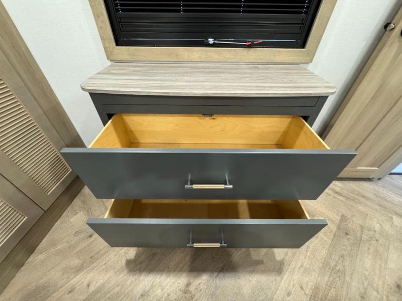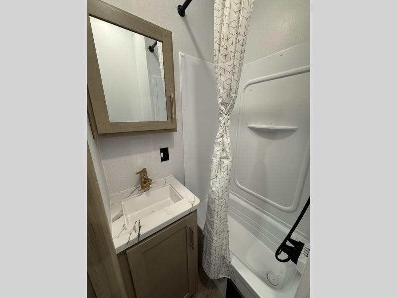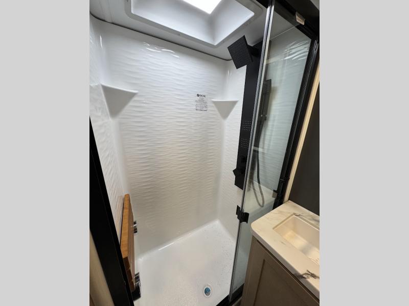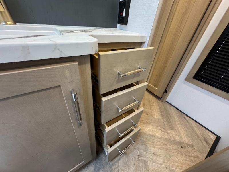 There's room for everyone in this toy hauler! The front private bedroom has a king bed slide for more interior space, a Smart LED TV, a front large wardrobe, plus washer and dryer prep. With two full bathrooms, it will be easy for everyone to get the mud rinsed out of their hair after a fun time on the trails. Start each morning off with a belly full of eggs cooked on the four-burner range and cinnamon rolls baked in the 24" stainless steel oven. Grab a cold cup of orange juice from the 20-cu. ft. 12-volt refrigerator and enjoy it along with the eggs at the dinette table or in the 13' 6" garage on one of the dual opposing sofas with table in between. The L-shaped sofa is conveniently across from the entertainment center with a 50" Smart LED TV and fireplace. As you head into the 13' 6" garage area, you will notice a loft with twin bed, an electric bed above the opposing sofas, Adjust-A-Track frame welded tie-downs, a full bathroom, and one of the dual entry doors to the unit!