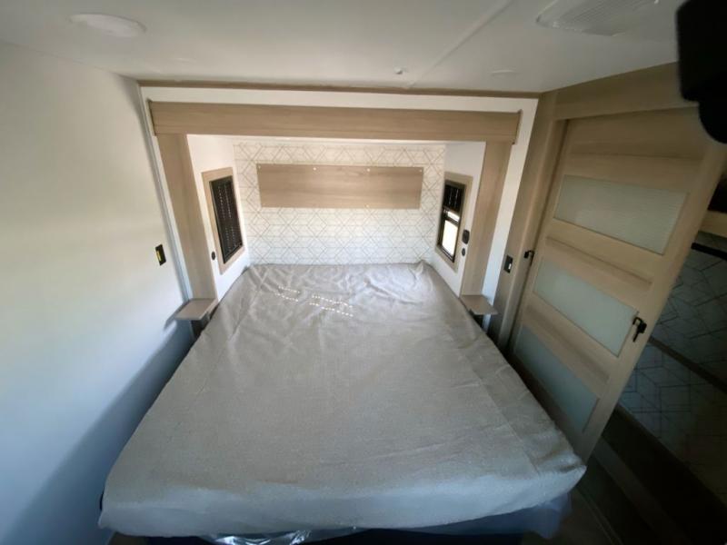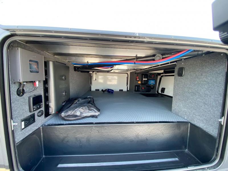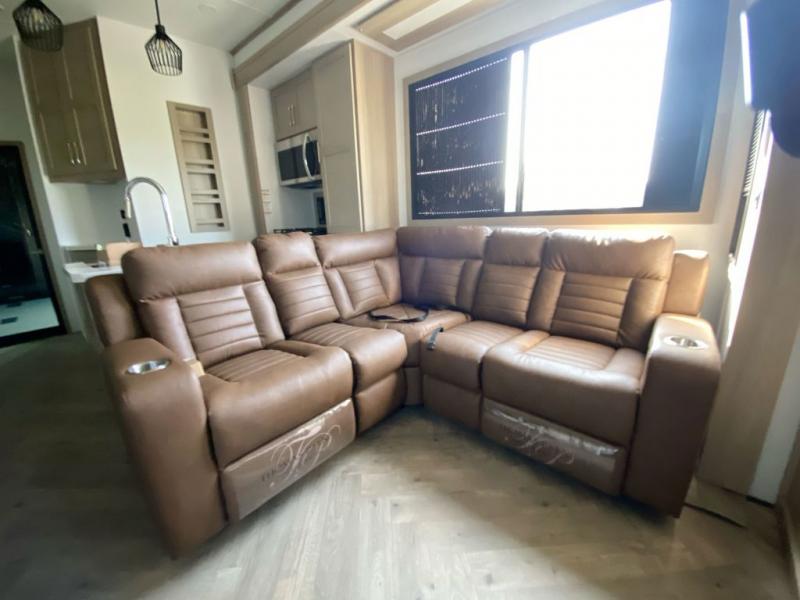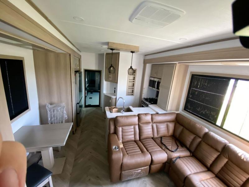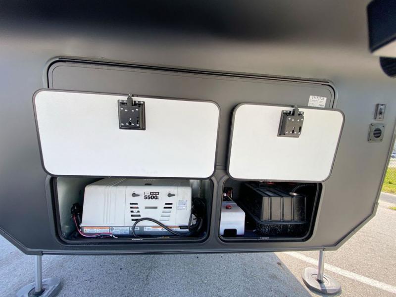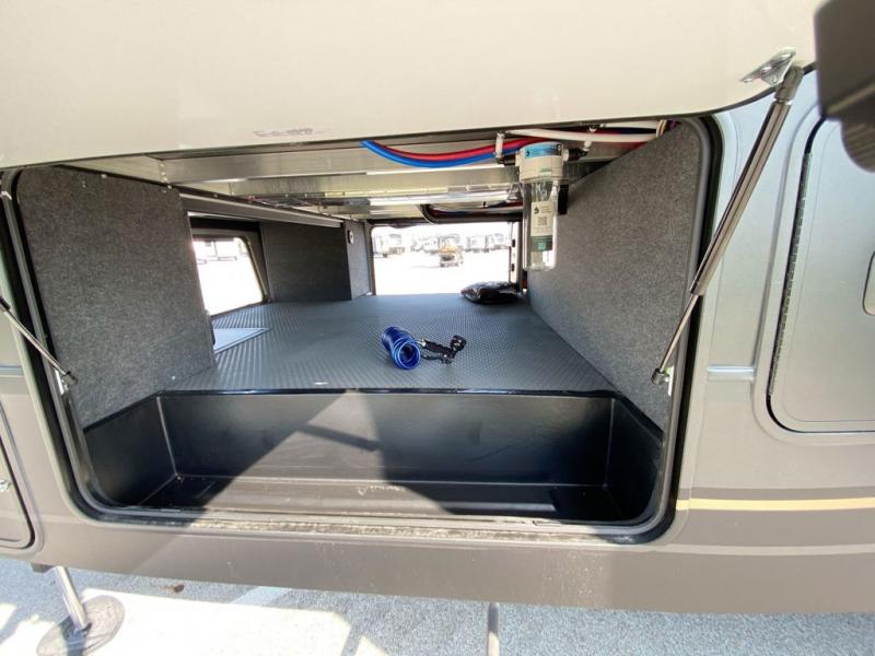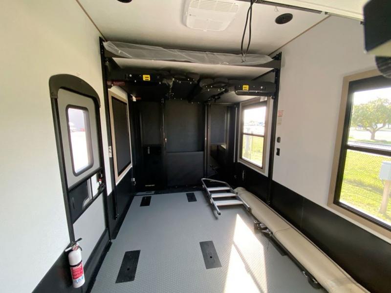 There's room for everyone in this toy hauler! The front private bedroom has a king bed slide for more interior space, a Smart LED TV, a front large wardrobe, plus washer and dryer prep. With two full bathrooms, it will be easy for everyone to get the mud rinsed out of their hair after a fun time on the trails. Start each morning off with a belly full of eggs cooked on the four-burner range and cinnamon rolls baked in the 24" stainless steel oven. Grab a cold cup of orange juice from the 20-cu. ft. 12-volt refrigerator and enjoy it along with the eggs at the dinette table or in the 13' 6" garage on one of the dual opposing sofas with table in between. The L-shaped sofa is conveniently across from the entertainment center with a 50" Smart LED TV and fireplace. As you head into the 13' 6" garage area, you will notice a loft with twin bed, an electric bed above the opposing sofas, Adjust-A-Track frame welded tie-downs, a full bathroom, and one of the dual entry doors to the unit!