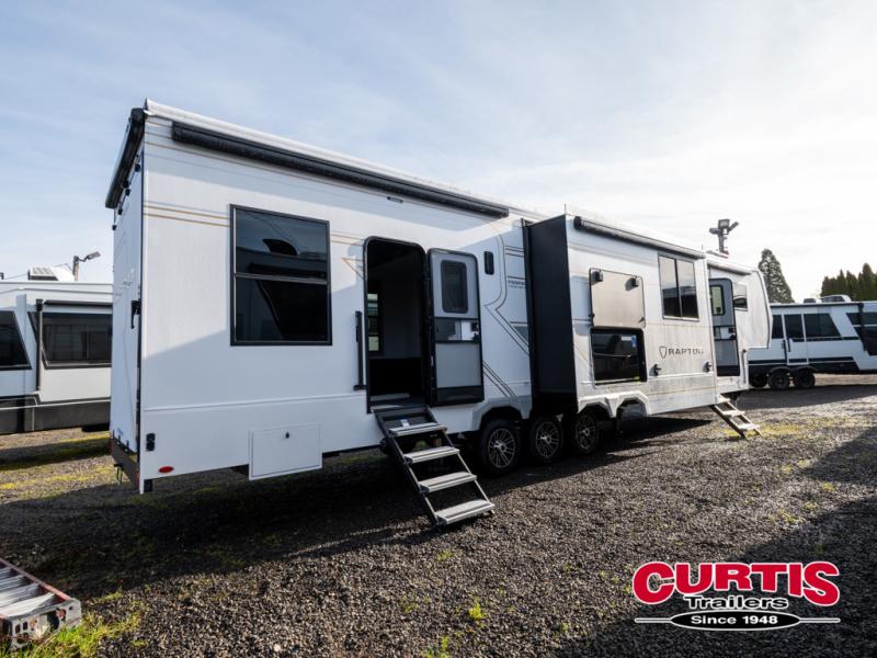 Experience a breath of fresh air with one of these Keystone RV Raptor fifth wheel toy haulers! Their rugged construction consists of a one-piece Alpha Super Flex TPO roof membrane, Dyna Span floor decking, and 5,000 lb. frame-welded tie- downs to keep your toys in place as you travel. Some unexpected conveniences you will appreciate include an Omni-Chill A/C system to keep you cool on those hot summer days, a Furrion backup camera, MaxTurn™ technology with a Helux™ pin box, and a Generation 3 iN-Command smart automation system with Global Connect to make life easier. There is also designer style vinyl flooring throughout, along with new ceiling treatment with LED accent lighting, beach wood and white cabinetry, and many more interior comforts!