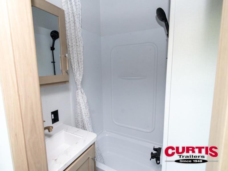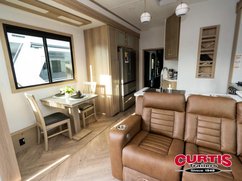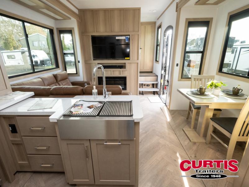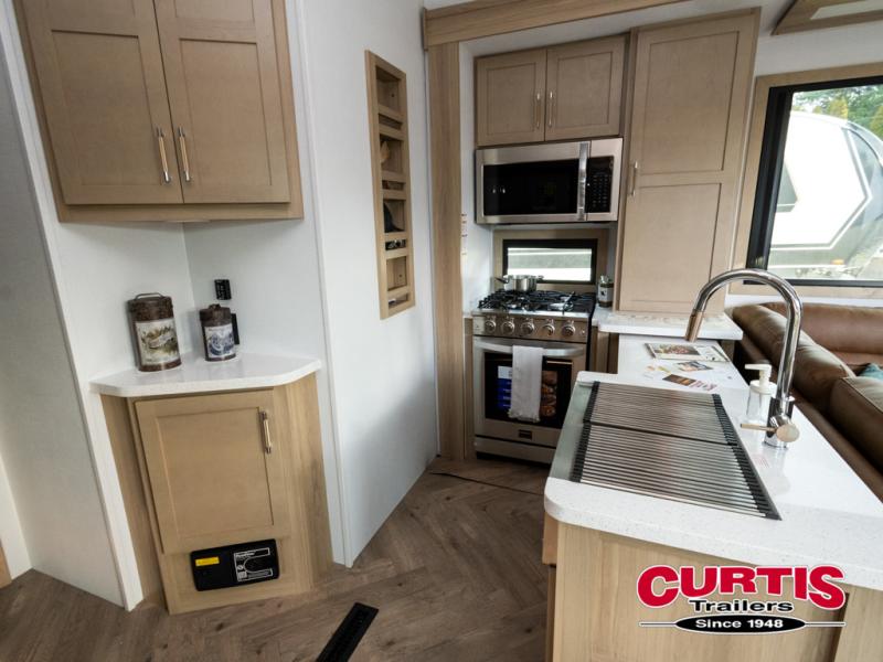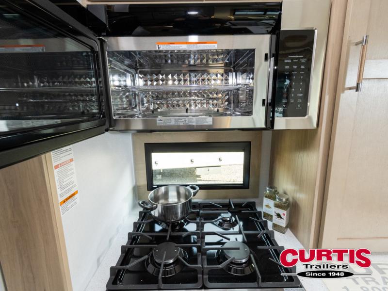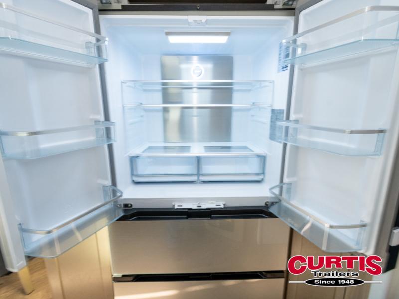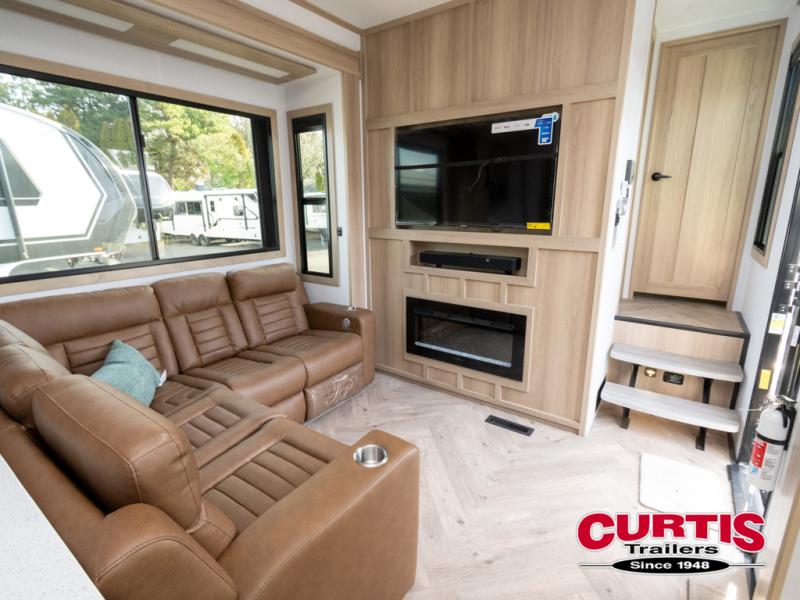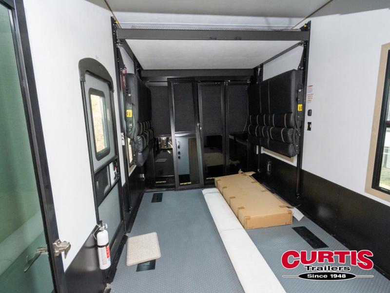 There's room for everyone in this toy hauler! The front private bedroom has a king bed slide for more interior space, a Smart LED TV, a front large wardrobe, plus washer and dryer prep. With two full bathrooms, it will be easy for everyone to get the mud rinsed out of their hair after a fun time on the trails. Start each morning off with a belly full of eggs cooked on the four-burner range and cinnamon rolls baked in the 24" stainless steel oven. Grab a cold cup of orange juice from the 20-cu. ft. 12-volt refrigerator and enjoy it along with the eggs at the dinette table or in the 13' 6" garage on one of the dual opposing sofas with table in between. The L-shaped sofa is conveniently across from the entertainment center with a 50" Smart LED TV and fireplace. As you head into the 13' 6" garage area, you will notice a loft with twin bed, an electric bed above the opposing sofas, Adjust-A-Track frame welded tie-downs, a full bathroom, and one of the dual entry doors to the unit!