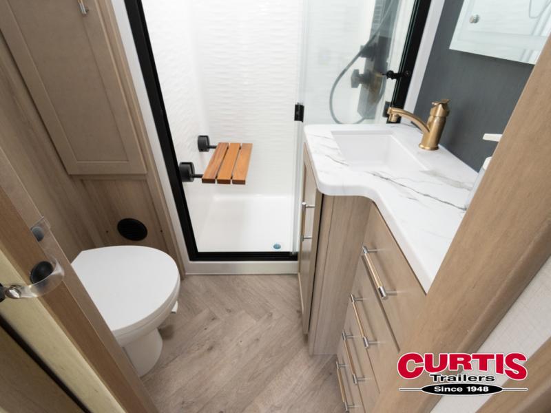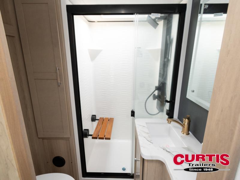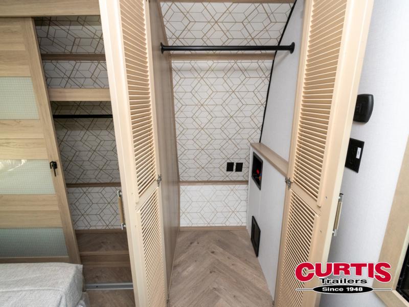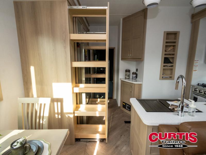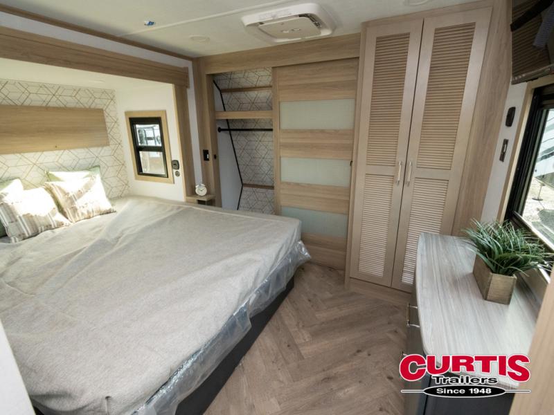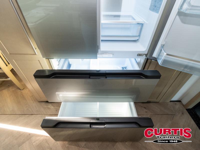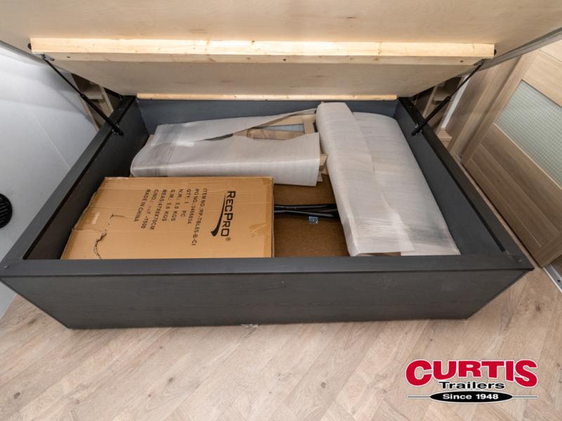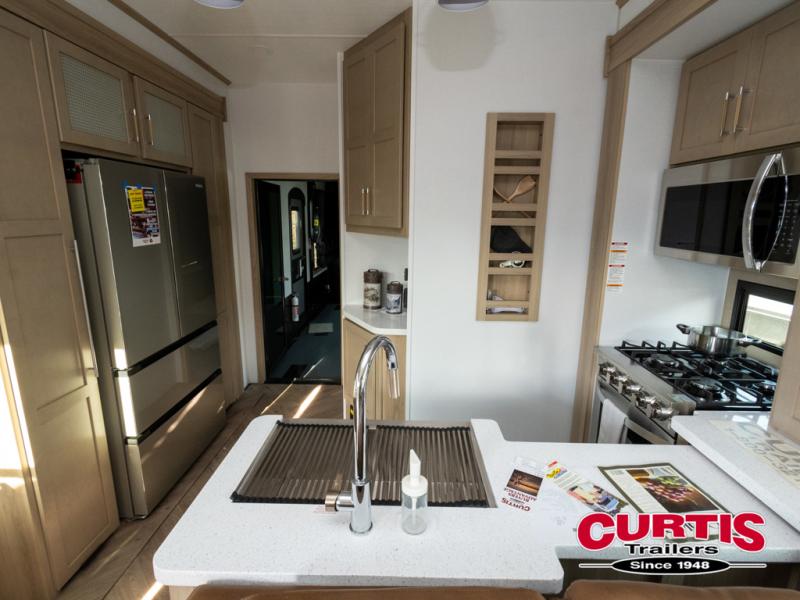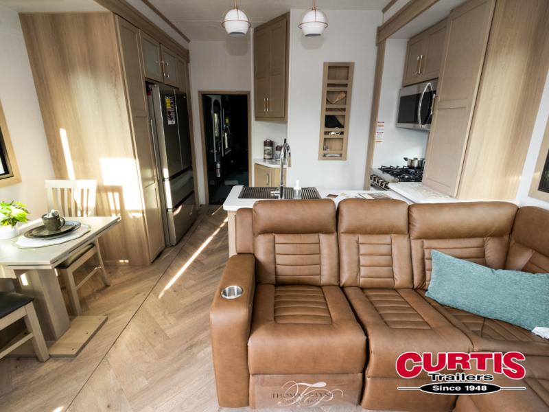 There's room for everyone in this toy hauler! The front private bedroom has a king bed slide for more interior space, a Smart LED TV, a front large wardrobe, plus washer and dryer prep. With two full bathrooms, it will be easy for everyone to get the mud rinsed out of their hair after a fun time on the trails. Start each morning off with a belly full of eggs cooked on the four-burner range and cinnamon rolls baked in the 24" stainless steel oven. Grab a cold cup of orange juice from the 20-cu. ft. 12-volt refrigerator and enjoy it along with the eggs at the dinette table or in the 13' 6" garage on one of the dual opposing sofas with table in between. The L-shaped sofa is conveniently across from the entertainment center with a 50" Smart LED TV and fireplace. As you head into the 13' 6" garage area, you will notice a loft with twin bed, an electric bed above the opposing sofas, Adjust-A-Track frame welded tie-downs, a full bathroom, and one of the dual entry doors to the unit!