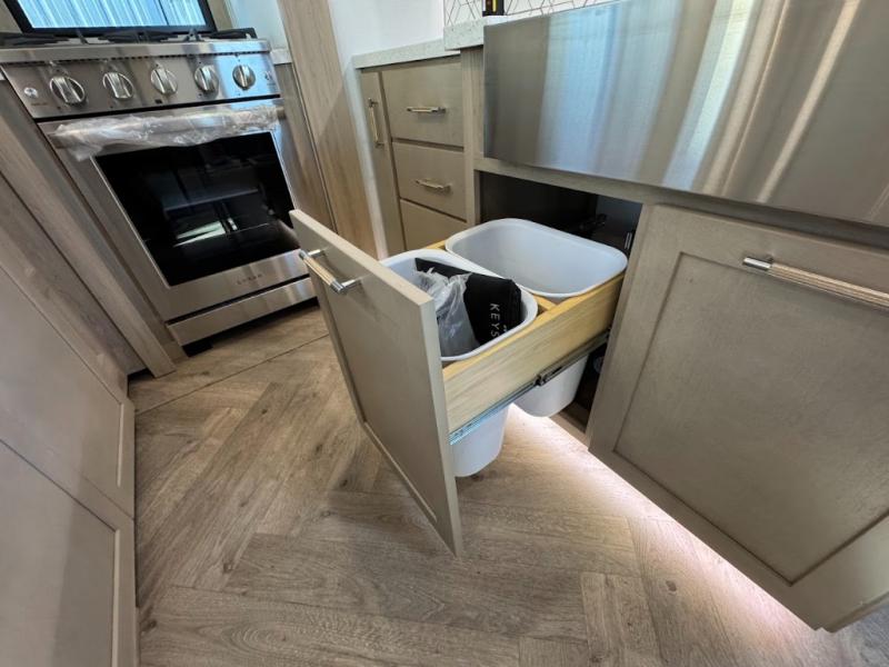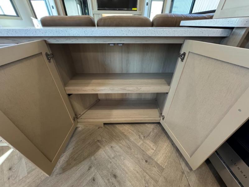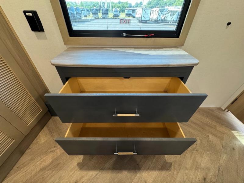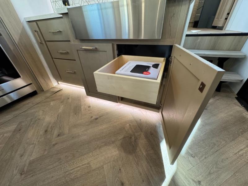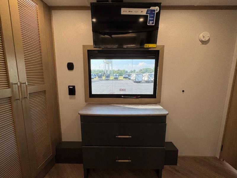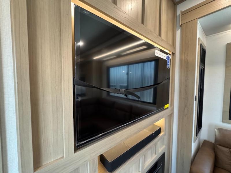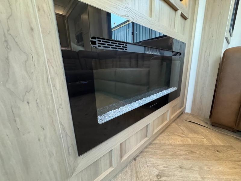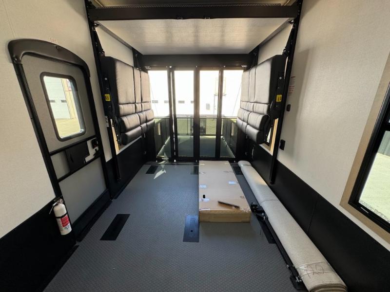 The whole family will love camping in this fifth wheel toy hauler! The front private bedroom has a king bed slide for more interior space, a Smart LED TV, a front large wardrobe, plus washer and dryer prep. Freshen up each morning in the full bathroom with the fiberglass one-piece shower then head to the kitchen to fry up some eggs on the four burner Lusso range and bake some cinnamon rolls in the 24" stainless steel oven. Grab a cold cup of orange juice from the 20 cu. ft. 12 volt refrigerator and enjoy it along with the eggs at the dinette table or in the 14' garage on one of the dual opposing sofas with cupholders. The L-shaped hide-a-bed sofa is conveniently across from the entertainment center with a 50" Smart LED TV and fireplace. As you head into the 14' garage area, you will notice a HappiJac bed with a 32" x 74" mattress, a queen bed above the opposing sofas, Raptor exclusive frame welded tie downs, and one of the dual entry doors to the unit!