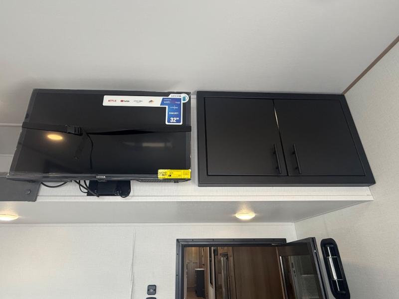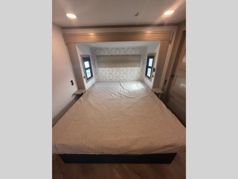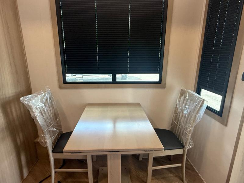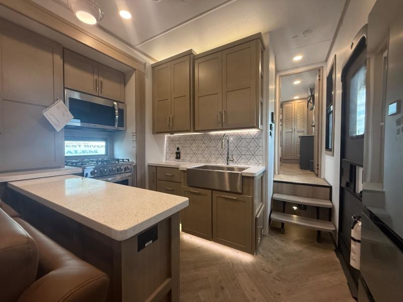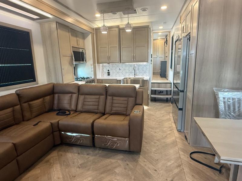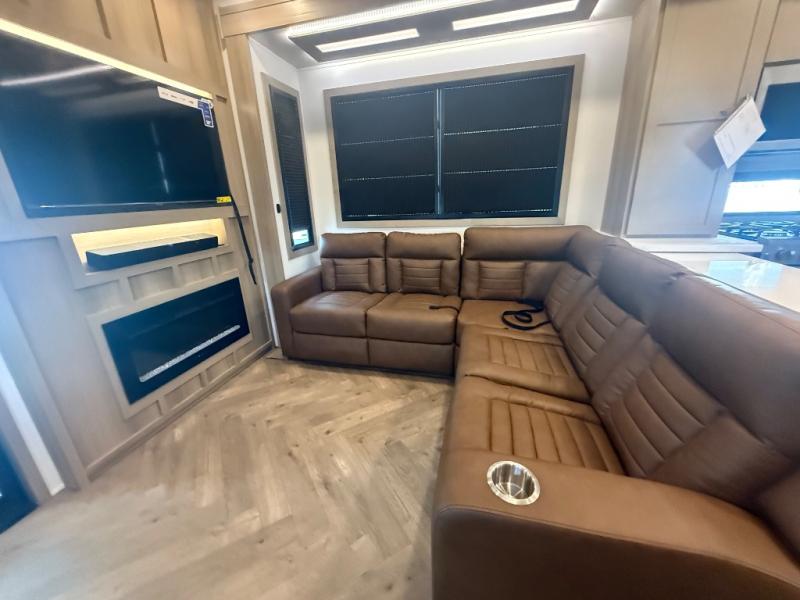 The whole family will love camping in this fifth wheel toy hauler! The front private bedroom has a king bed slide for more interior space, a Smart LED TV, a front large wardrobe, plus washer and dryer prep. Freshen up each morning in the full bathroom with the fiberglass one-piece shower then head to the kitchen to fry up some eggs on the four-burner range and bake some cinnamon rolls in the 24" stainless steel oven. Grab a cold cup of orange juice from the 20-cu. ft. 12-volt refrigerator and enjoy it along with the eggs at the dinette table or in the 15' garage on one of the dual opposing sofas with cupholders. The L-shaped hide-a-bed sofa is conveniently across from the entertainment center with a 50" Smart LED TV and fireplace. As you head into the 15' garage area, you will notice a loft with a twin bed, a queen bed above the opposing sofas, Adjust-A-Track frame welded tie downs, and one of the dual entry doors to the unit!