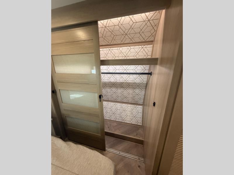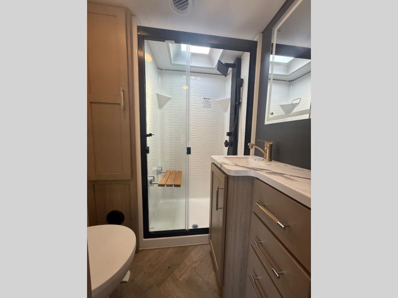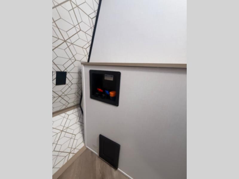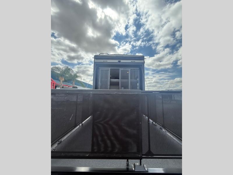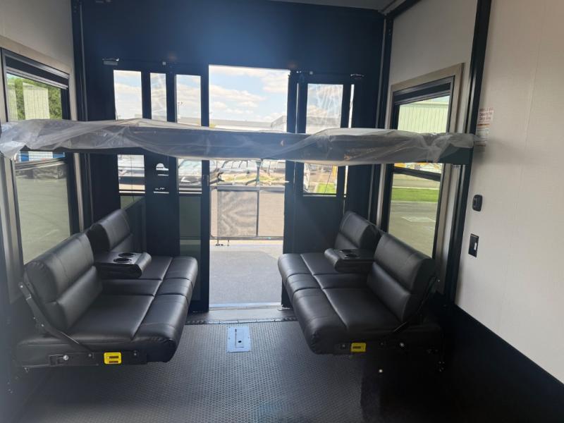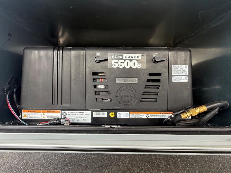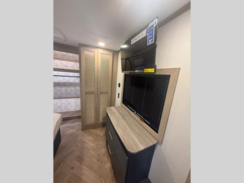 The whole family will love camping in this fifth wheel toy hauler! The front private bedroom has a king bed slide for more interior space, a Smart LED TV, a front large wardrobe, plus washer and dryer prep. Freshen up each morning in the full bathroom with the fiberglass one-piece shower then head to the kitchen to fry up some eggs on the four-burner range and bake some cinnamon rolls in the 24" stainless steel oven. Grab a cold cup of orange juice from the 20-cu. ft. 12-volt refrigerator and enjoy it along with the eggs at the dinette table or in the 15' garage on one of the dual opposing sofas with cupholders. The L-shaped hide-a-bed sofa is conveniently across from the entertainment center with a 50" Smart LED TV and fireplace. As you head into the 15' garage area, you will notice a loft with a twin bed, a queen bed above the opposing sofas, Adjust-A-Track frame welded tie downs, and one of the dual entry doors to the unit!