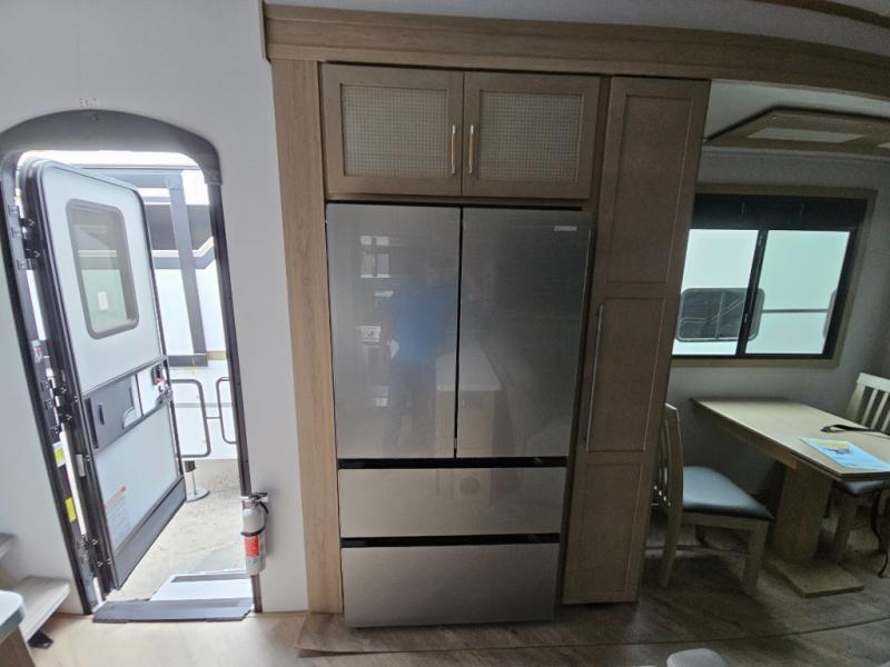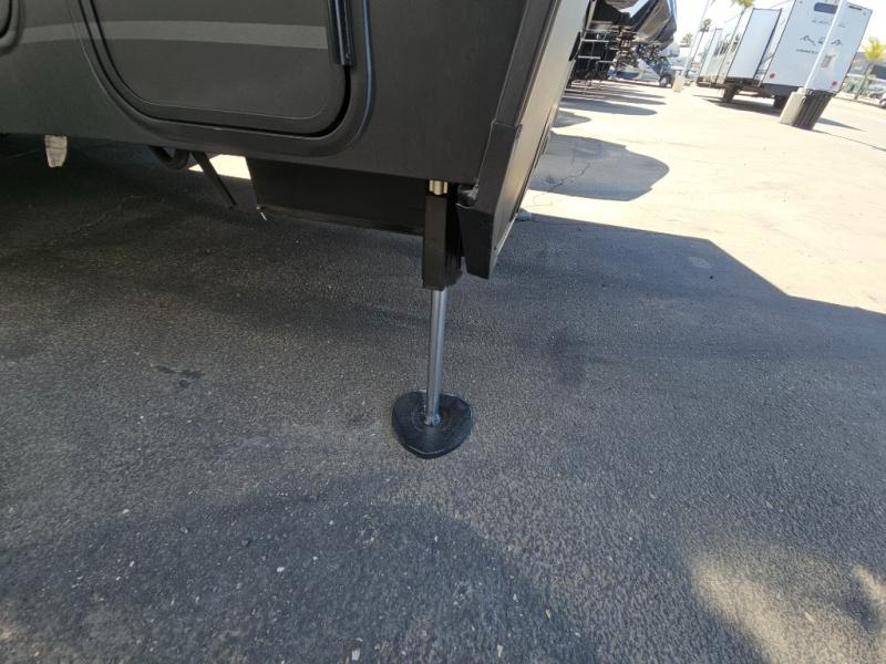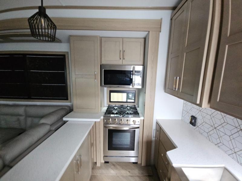 The whole family will love camping in this fifth wheel toy hauler! The front private bedroom has a king bed slide for more interior space, a Smart LED TV, a front large wardrobe, plus washer and dryer prep. Freshen up each morning in the full bathroom with the fiberglass one-piece shower then head to the kitchen to fry up some eggs on the four-burner range and bake some cinnamon rolls in the 24" stainless steel oven. Grab a cold cup of orange juice from the 20-cu. ft. 12-volt refrigerator and enjoy it along with the eggs at the dinette table or in the 15' garage on one of the dual opposing sofas with cupholders. The L-shaped hide-a-bed sofa is conveniently across from the entertainment center with a 50" Smart LED TV and fireplace. As you head into the 15' garage area, you will notice a loft with a twin bed, a queen bed above the opposing sofas, Adjust-A-Track frame welded tie downs, and one of the dual entry doors to the unit!