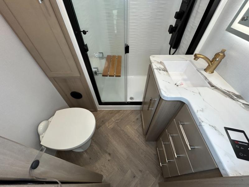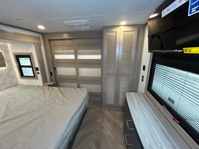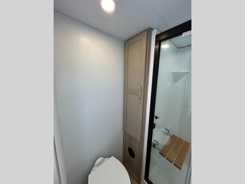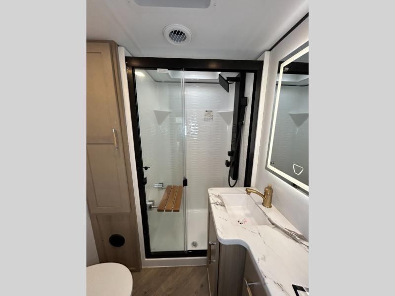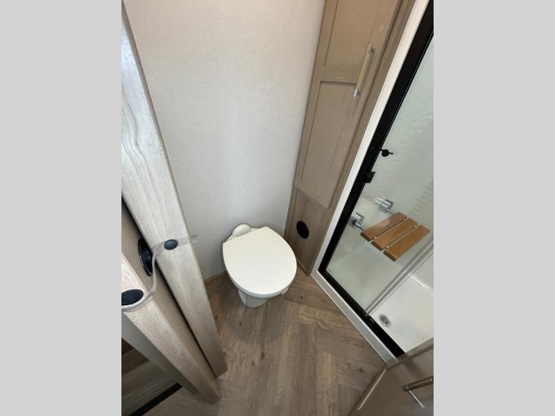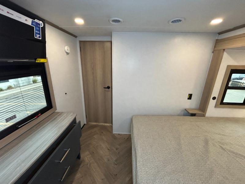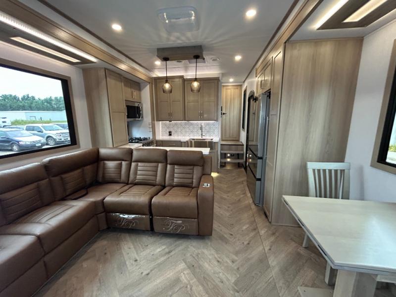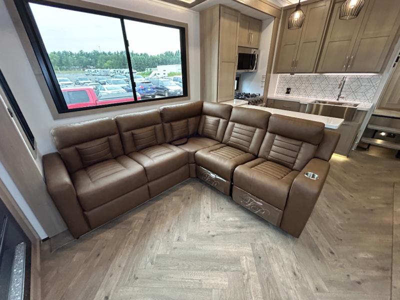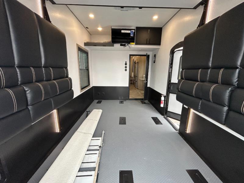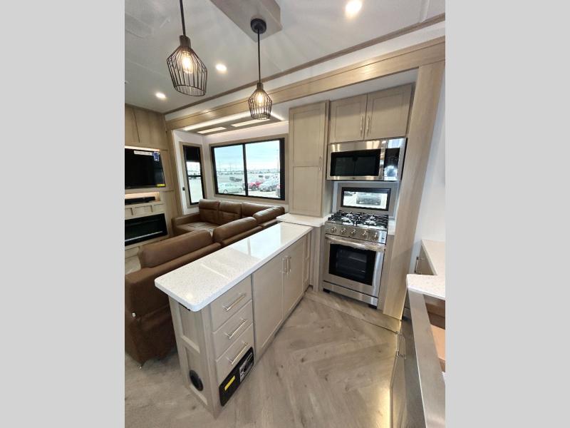 The whole family will love camping in this fifth wheel toy hauler! The front private bedroom has a king bed slide for more interior space, a Smart LED TV, a front large wardrobe, plus washer and dryer prep. Freshen up each morning in the full bathroom with the fiberglass one-piece shower then head to the kitchen to fry up some eggs on the four-burner range and bake some cinnamon rolls in the 24" stainless steel oven. Grab a cold cup of orange juice from the 20-cu. ft. 12-volt refrigerator and enjoy it along with the eggs at the dinette table or in the 15' garage on one of the dual opposing sofas with cupholders. The L-shaped hide-a-bed sofa is conveniently across from the entertainment center with a 50" Smart LED TV and fireplace. As you head into the 15' garage area, you will notice a loft with a twin bed, a queen bed above the opposing sofas, Adjust-A-Track frame welded tie downs, and one of the dual entry doors to the unit!