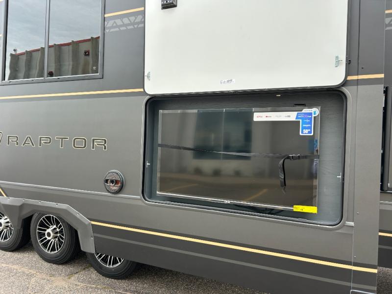 Experience a breath of fresh air with one of these Keystone RV Raptor fifth wheel toy haulers! Their rugged construction consists of a one-piece Alpha Super Flex TPO roof membrane, Dyna Span floor decking, and 5,000 lb. frame-welded tie- downs to keep your toys in place as you travel. Some unexpected conveniences you will appreciate include an Omni-Chill A/C system to keep you cool on those hot summer days, a Furrion backup camera, MaxTurn™ technology with a Helux™ pin box, and a Generation 3 iN-Command smart automation system with Global Connect to make life easier. There is also designer style vinyl flooring throughout, along with new ceiling treatment with LED accent lighting, beach wood and white cabinetry, and many more interior comforts!