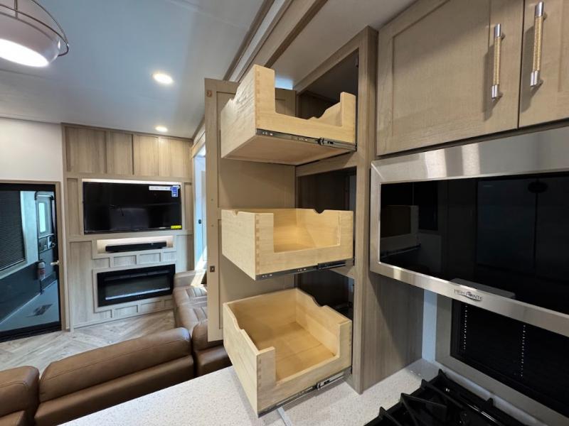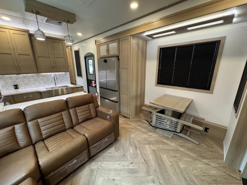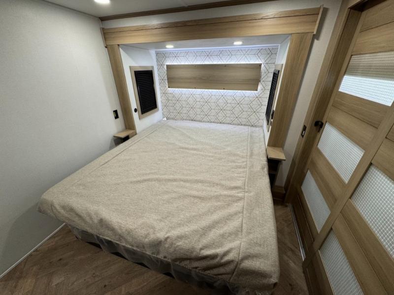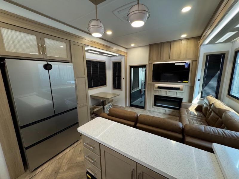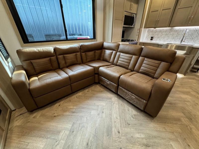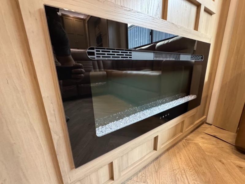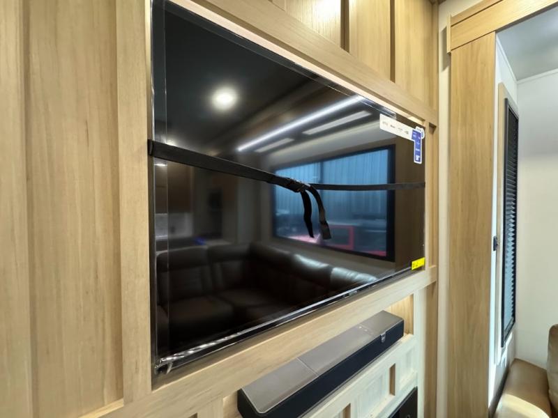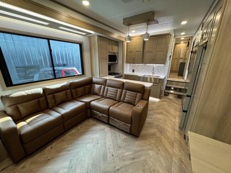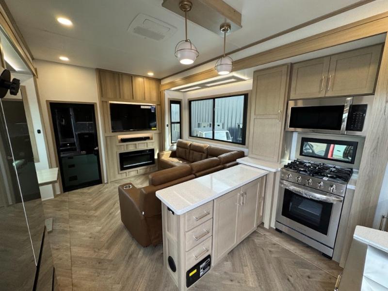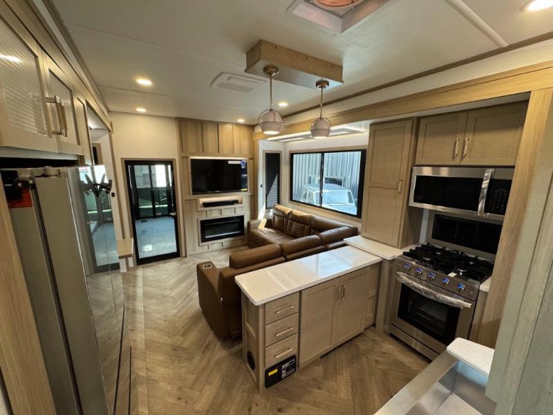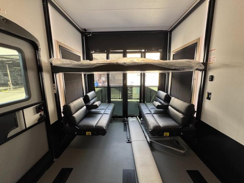 The whole family will love camping in this fifth wheel toy hauler! The front private bedroom has a king bed slide for more interior space, a Smart LED TV, a front large wardrobe, plus washer and dryer prep. Freshen up each morning in the full bathroom with the fiberglass one-piece shower then head to the kitchen to fry up some eggs on the four-burner range and bake some cinnamon rolls in the 24" stainless steel oven. Grab a cold cup of orange juice from the 20-cu. ft. 12-volt refrigerator and enjoy it along with the eggs at the dinette table or in the 15' garage on one of the dual opposing sofas with cupholders. The L-shaped hide-a-bed sofa is conveniently across from the entertainment center with a 50" Smart LED TV and fireplace. As you head into the 15' garage area, you will notice a loft with a twin bed, a queen bed above the opposing sofas, Adjust-A-Track frame welded tie downs, and one of the dual entry doors to the unit!