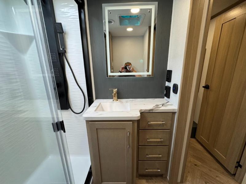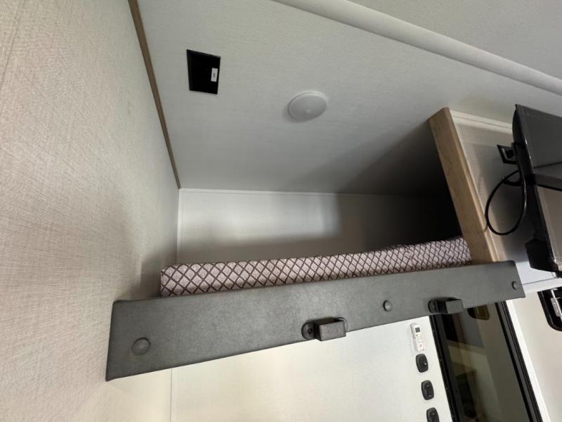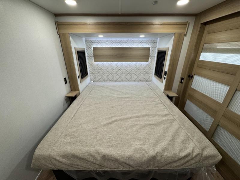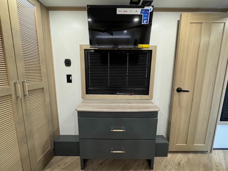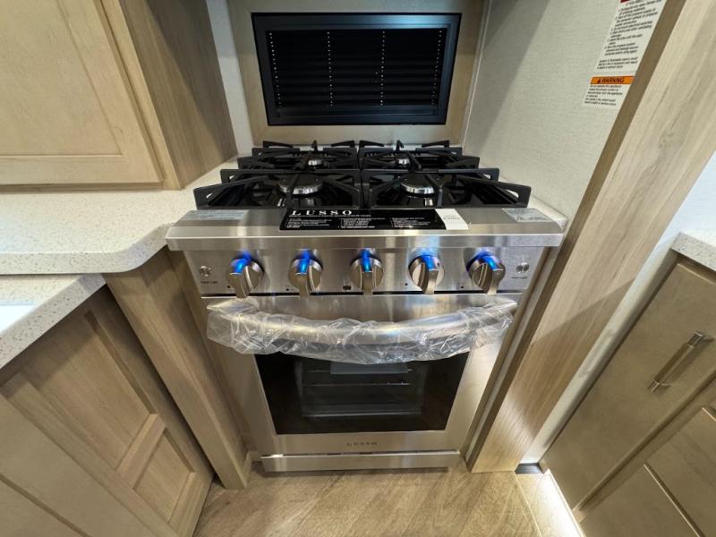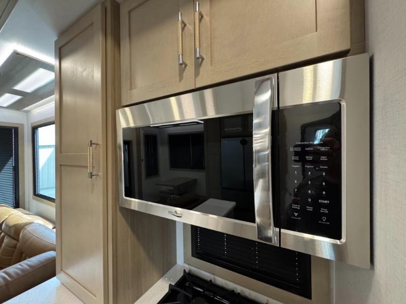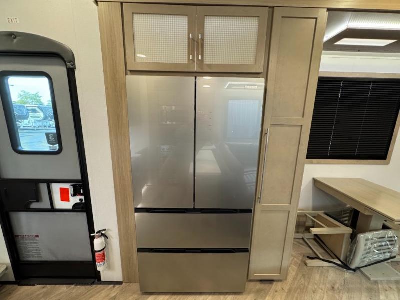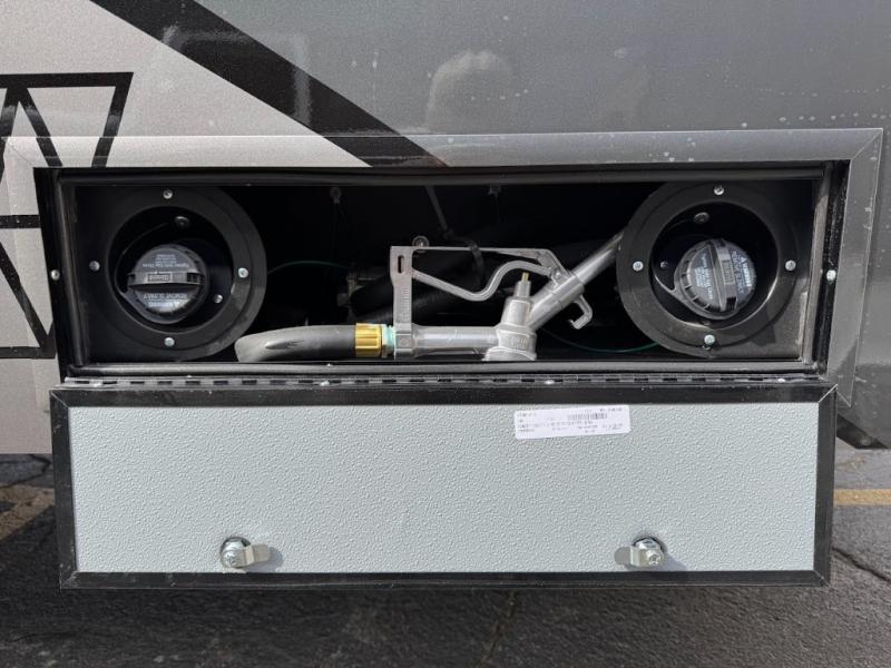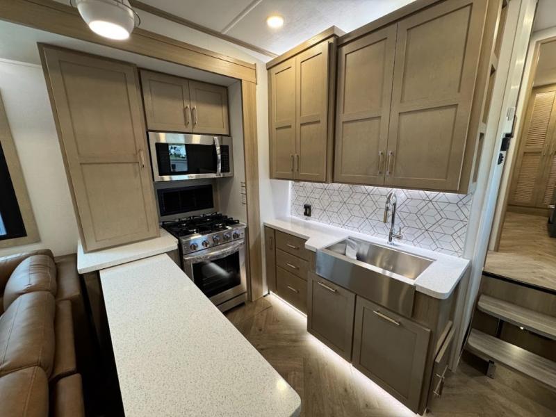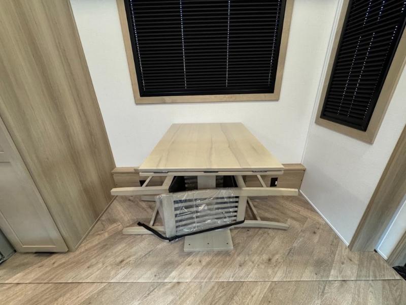 The whole family will love camping in this fifth wheel toy hauler! The front private bedroom has a king bed slide for more interior space, a Smart LED TV, a front large wardrobe, plus washer and dryer prep. Freshen up each morning in the full bathroom with the fiberglass one-piece shower then head to the kitchen to fry up some eggs on the four-burner range and bake some cinnamon rolls in the 24" stainless steel oven. Grab a cold cup of orange juice from the 20-cu. ft. 12-volt refrigerator and enjoy it along with the eggs at the dinette table or in the 15' garage on one of the dual opposing sofas with cupholders. The L-shaped hide-a-bed sofa is conveniently across from the entertainment center with a 50" Smart LED TV and fireplace. As you head into the 15' garage area, you will notice a loft with a twin bed, a queen bed above the opposing sofas, Adjust-A-Track frame welded tie downs, and one of the dual entry doors to the unit!