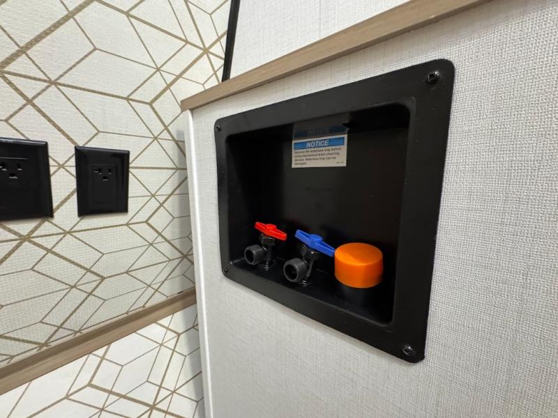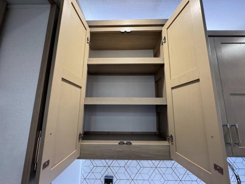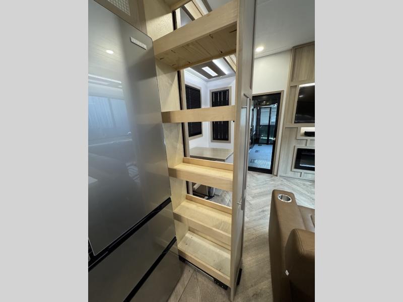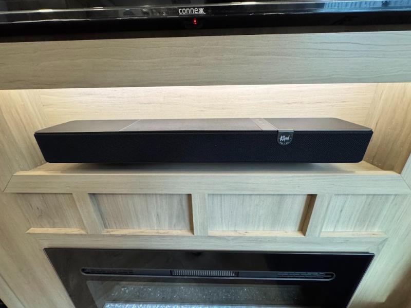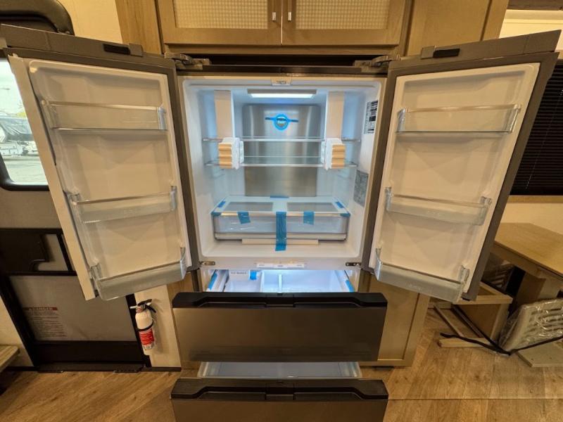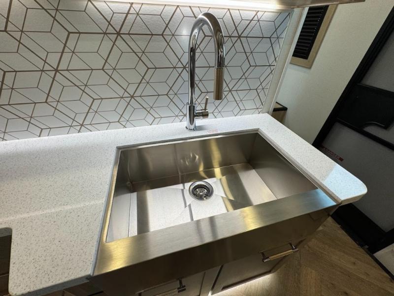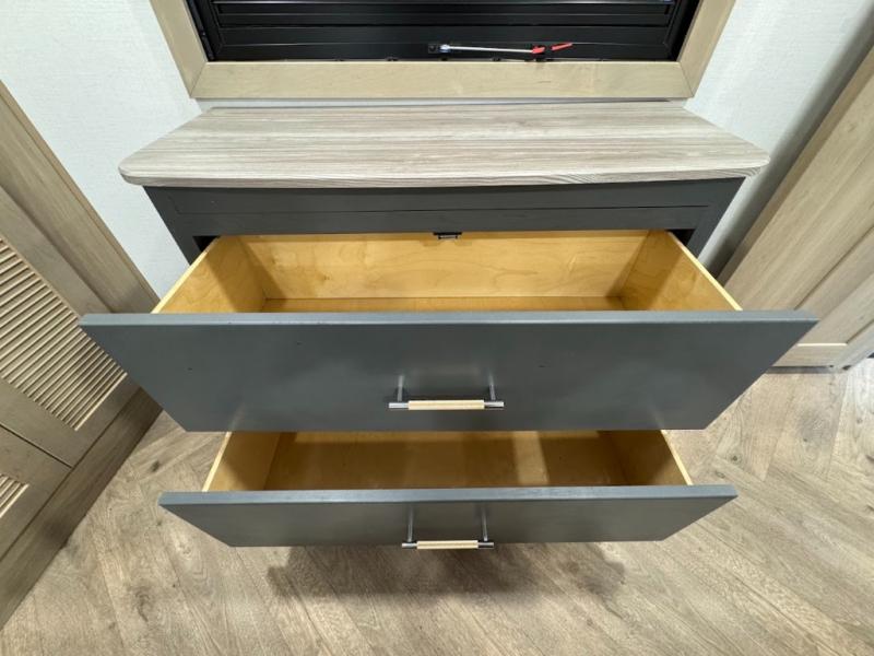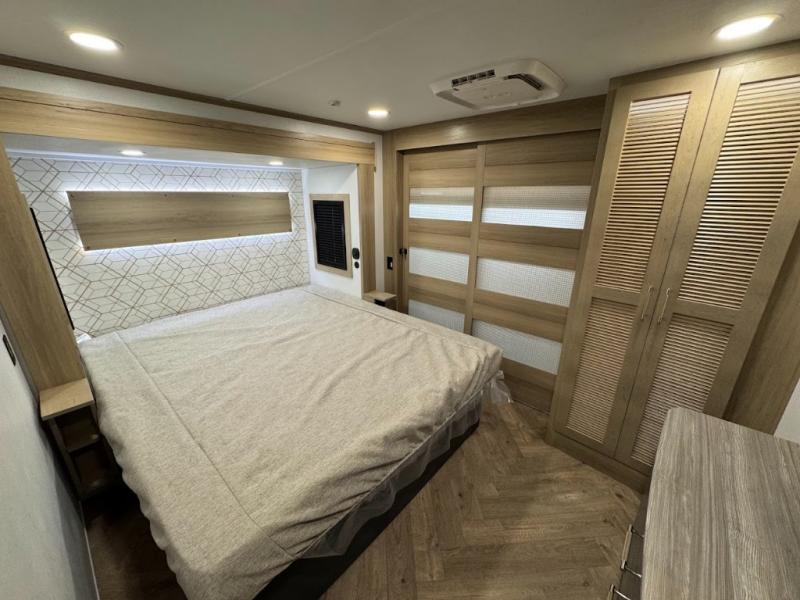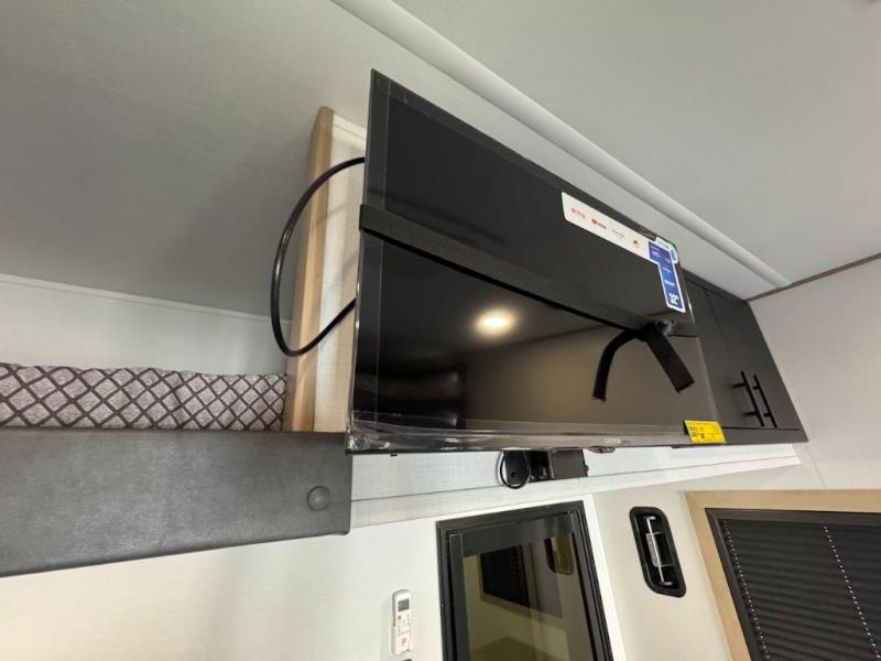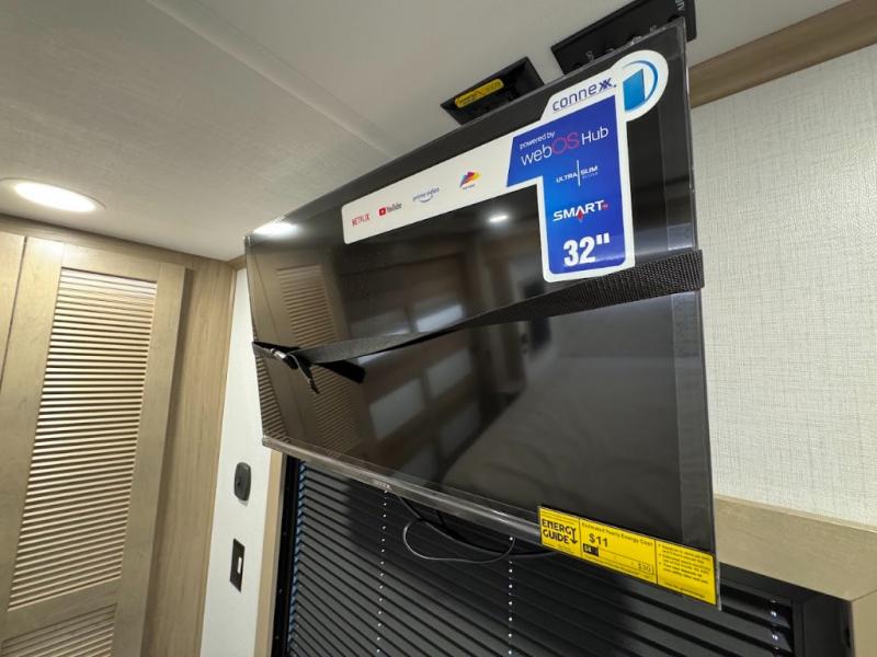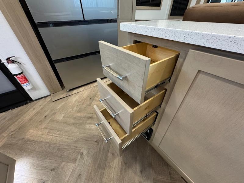 The whole family will love camping in this fifth wheel toy hauler! The front private bedroom has a king bed slide for more interior space, a Smart LED TV, a front large wardrobe, plus washer and dryer prep. Freshen up each morning in the full bathroom with the fiberglass one-piece shower then head to the kitchen to fry up some eggs on the four-burner range and bake some cinnamon rolls in the 24" stainless steel oven. Grab a cold cup of orange juice from the 20-cu. ft. 12-volt refrigerator and enjoy it along with the eggs at the dinette table or in the 15' garage on one of the dual opposing sofas with cupholders. The L-shaped hide-a-bed sofa is conveniently across from the entertainment center with a 50" Smart LED TV and fireplace. As you head into the 15' garage area, you will notice a loft with a twin bed, a queen bed above the opposing sofas, Adjust-A-Track frame welded tie downs, and one of the dual entry doors to the unit!