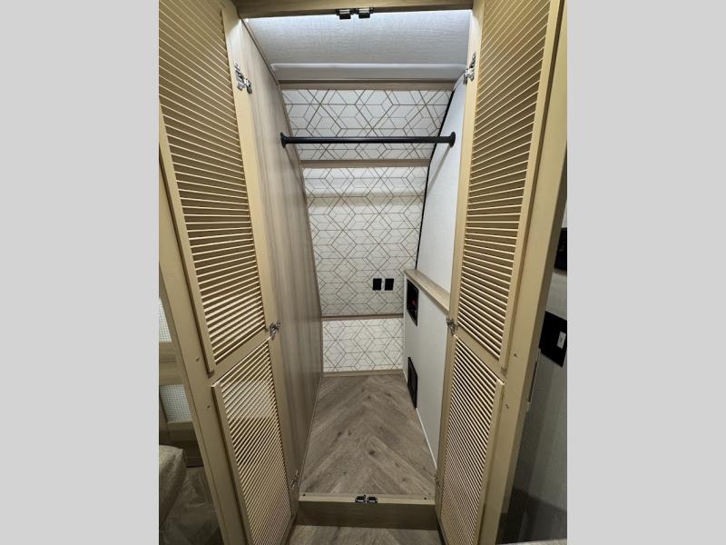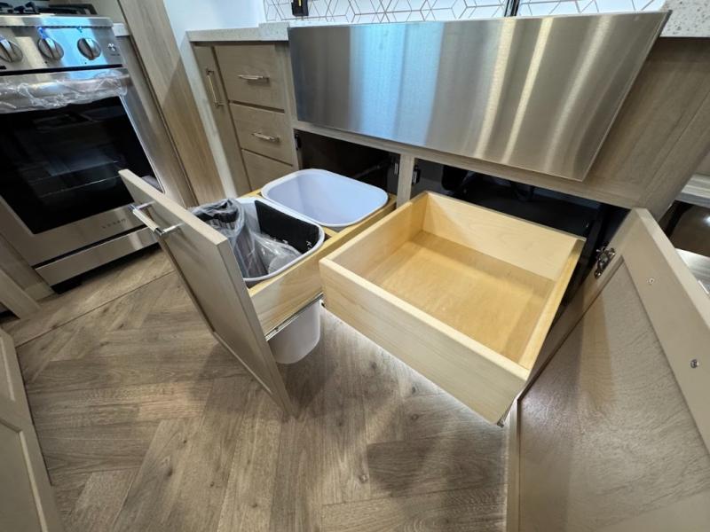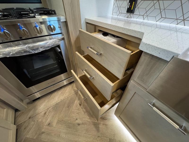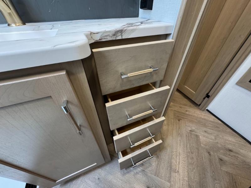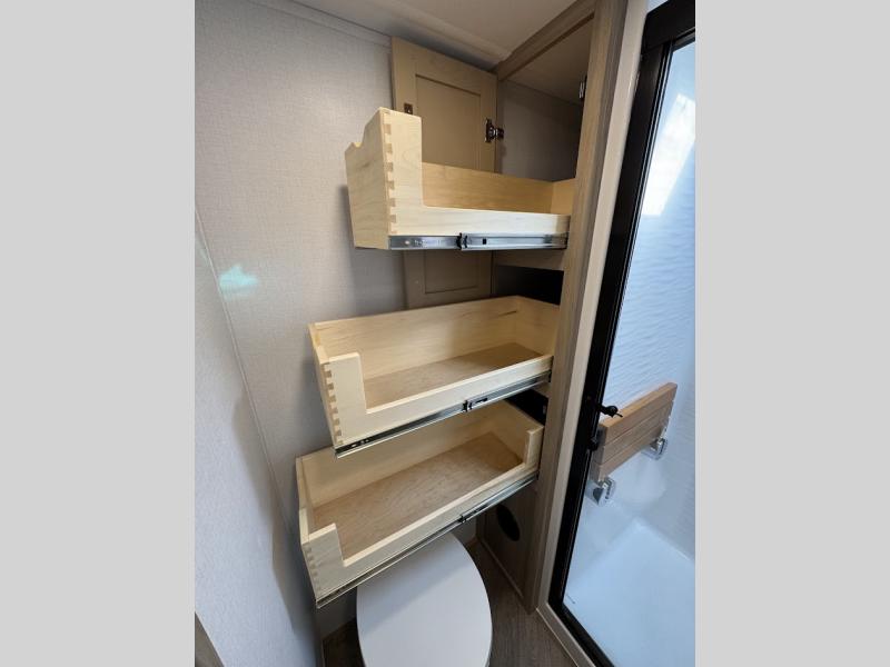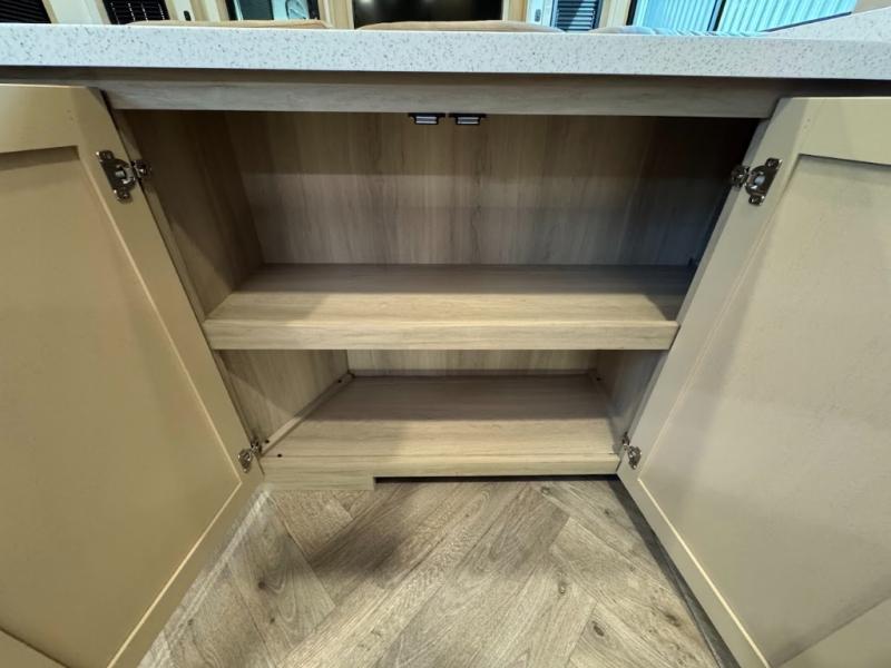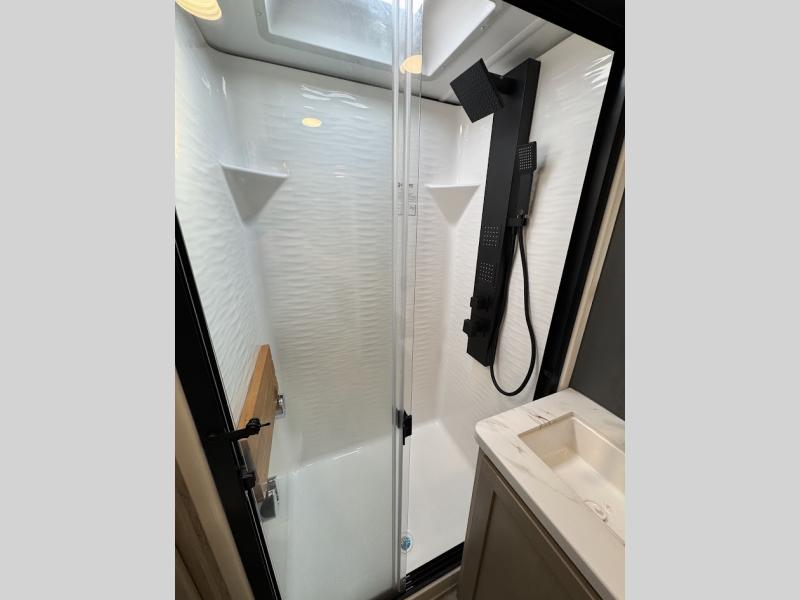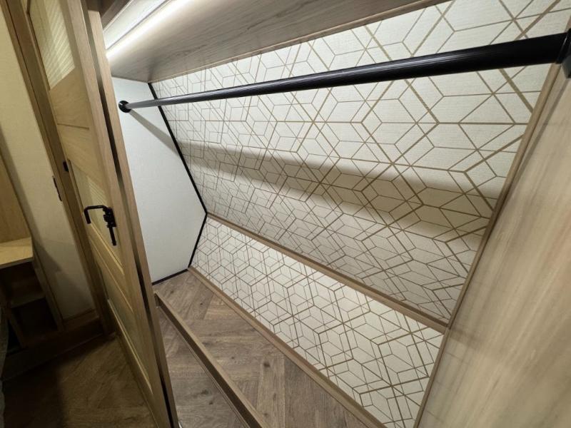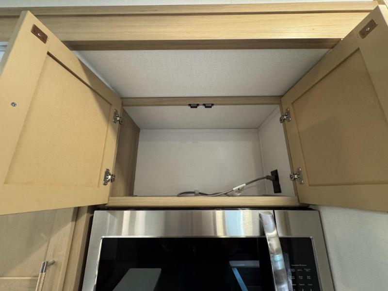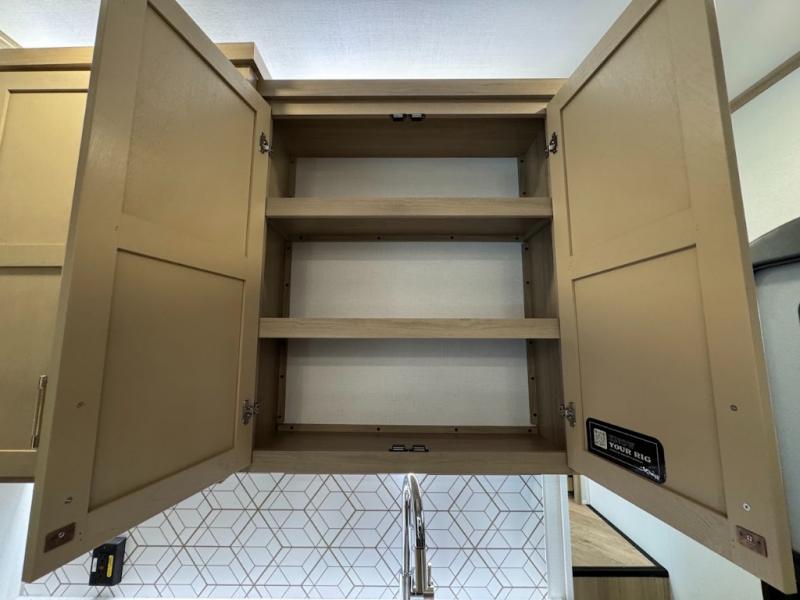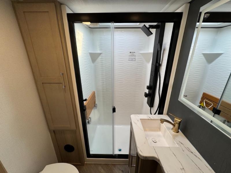 The whole family will love camping in this fifth wheel toy hauler! The front private bedroom has a king bed slide for more interior space, a Smart LED TV, a front large wardrobe, plus washer and dryer prep. Freshen up each morning in the full bathroom with the fiberglass one-piece shower then head to the kitchen to fry up some eggs on the four-burner range and bake some cinnamon rolls in the 24" stainless steel oven. Grab a cold cup of orange juice from the 20-cu. ft. 12-volt refrigerator and enjoy it along with the eggs at the dinette table or in the 15' garage on one of the dual opposing sofas with cupholders. The L-shaped hide-a-bed sofa is conveniently across from the entertainment center with a 50" Smart LED TV and fireplace. As you head into the 15' garage area, you will notice a loft with a twin bed, a queen bed above the opposing sofas, Adjust-A-Track frame welded tie downs, and one of the dual entry doors to the unit!